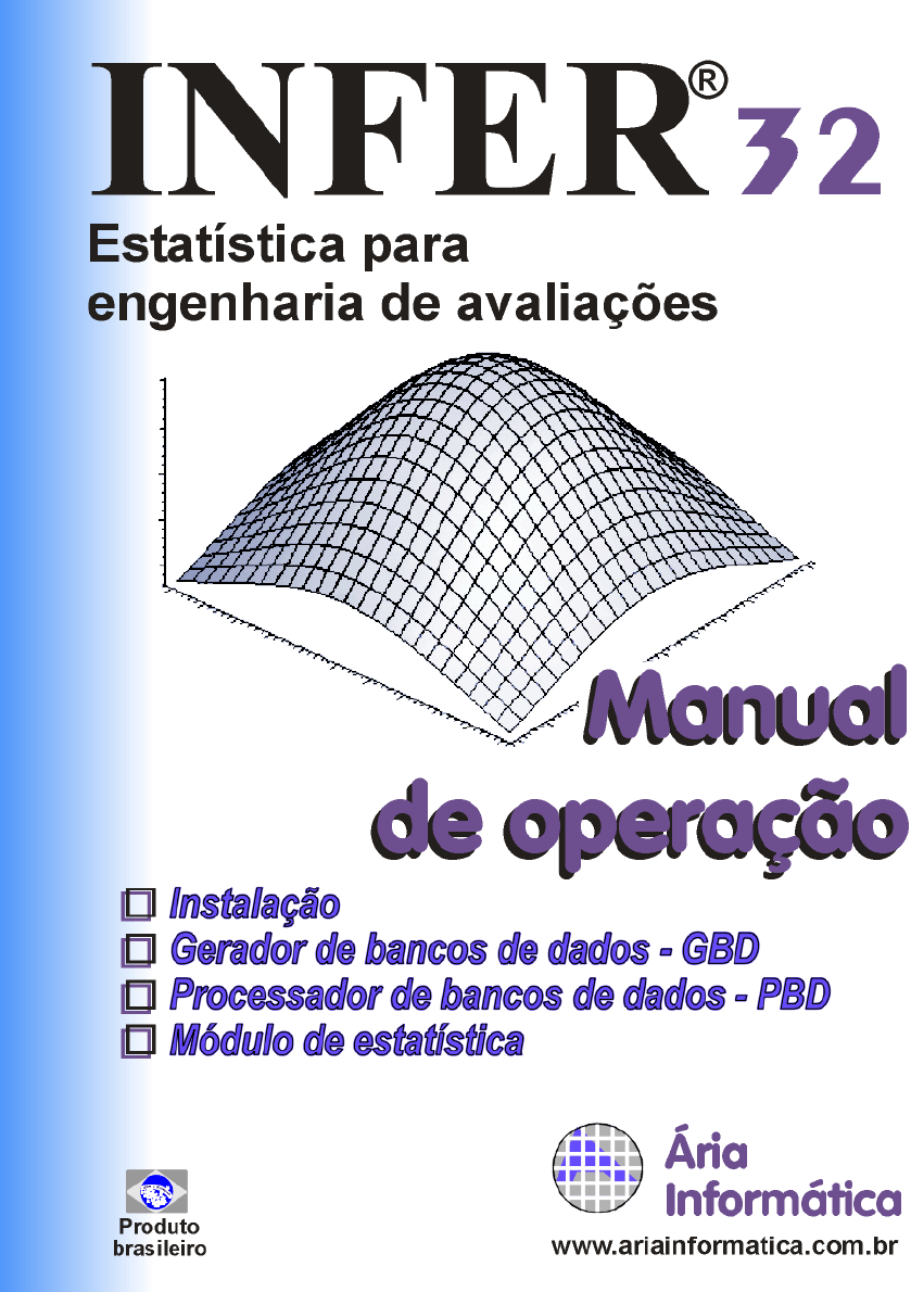 1 INFER versão 32 MANUAL DE OPERAÇÃO revisão 2 (jun/2004) . . sumário 2 revisão 3 (junho/2016) PARTE 1 INSTALAÇÃO DO INFER 1 - O que é Instalar? ............................................................................ 2 2 - Para instalar o INFER usando o Windows .................................... 2 3 - O processo de instalação ............................................................... 2 3.1 Etapa 1 - Condições de uso do INFER .......................................... 2 3.2 Etapa 2 - Seleção de operação em rede ........................................ 3 3.3 Etapa 3- Instalação do sistema INFER 3 ........................................ 5 4 Remoção do Sistema INFER ............................................................. 7 4.1 O processo de remoção ................................................................ 7 PARTE 2 G.B.D. GERADOR DE BANCO DE DADOS 1 - O que é um Banco de Dados .......................................................... 12 2 - O que são os campos ..................................................................... 13 3 - Criando um Banco de Dados .......................................................... 13 3.1 - Criando um campo do tipo TEXTO .............................................. 15 3.2 - Criando um campo do tipo DATA ................................................ 16 3.3 - Criando um campo MULTIPLO (de várias entradas do mesmo tipo)... 17 3.4 - Criando um campo de TEXTO SEM LIMITE DE TAMANHO ........ 19 4 - Ativando (Selecionando) um Banco de Dados ............................ 20 5 - Modificando o Banco de Dados ..................................... 21 5.1 - Modificando um campo existente ................................................. 21 5.2 - Alinhando campos ....................................................................... 23 5.3 - Eliminando campos ..................................................................... 23 5.4 - Introduzindo novos campos ......................................................... 24 5.5 - Introduzindo campos calculados (Equações) ............................... 25 5.6 - Introduzindo campos tabelados ................................................... 27 5.6.1 - Definindo tabelas ................................................................ 28 5.6.2 - Criando campos tipo “Lista de opções“ ................................ 29 5.6.3 - Criando campos tipo “Opção única“ .................................... 30 5.7 - Introduzindo campos de várias opções ........................................ 31 5.8 - Introduzindo títulos e comentários para a ficha ............................ 32 6 - Recuperando dados de Banco de dados danificados - A AMBULÂNCIA.. 34 3 PARTE 3 P.B.D. PROCESSADOR DE BANCO DE DADOS 1 - Introdução ....................................................................................... 36 2 - A tela principal do programa P.B.D. .............................................. 38 3 - Ativando um banco de dados ......................................................... 40 4 - Digitando os primeiros dados ........................................................ 42 5 - Modificando o “visual” da planilha ............................................... 43 5.1 Modificando as fontes .................................................................... 43 5.2 Modificando a largura das colunas ................................................. 43 5.3 Mudando as colunas de lugar ........................................................ 43 6 - Modificando os dados mostrados na planilha .............................. 44 6.1 Ordenando os dados ..................................................................... 44 6.2 Removendo a ordenação ............................................................... 45 6.3 Selecionando (filtrando) dados ....................................................... 46 6.4 Ocultando (e mostrando) colunas de dados ................................... 49 7 - Imprimindo os dados mostrados na planilha ................................ 50 7.1 Imprimindo dados .......................................................................... 50 7.2 Opções de impressão .................................................................... 51 7.3 Outras opções ............................................................................... 52 7.4 Visualização do relatório no vídeo ................................................. 52 8 - Transferindo os dados para o INFER ............................................. 55 9 - Cópias de segurança (“back-up”) e transferências de dados entre computadores ....................................................................... 56 9.1 Gravando a cópia de segurança .................................................... 56 9.2 Recuperando (lendo) os dados da cópia de segurança .................. 57 10 - Arquivos de chaves danificados .................................................. 59 4 PARTE 4 INFER - MÓDULO DE ESTATÍSTICA 1 - O que é o Módulo de Estatística ? ................................................ 61 1.1 Usando o Módulo de Estatística .................................................... 61 1.2 Digitando as informações na planilha do INFER ........................... 63 1.3 Pesquisando o modelo que melhor se ajusta ................................. 65 1.4 Preenchendo os dados do bem a avaliar ....................................... 66 1.5 Visualizando o Relatório do INFER ................................................ 67 1.6 Um exemplo de análise Descritiva ................................................. 69 2 - Editando, Avaliando e Verificando Resultados no INFER ....................... 72 2.1 Definindo Variáveis ........................................................................ 72 2.1.1 Estatística Inferencial ............................................................ 73 2.1.2 Estatística Descritiva ...................................................