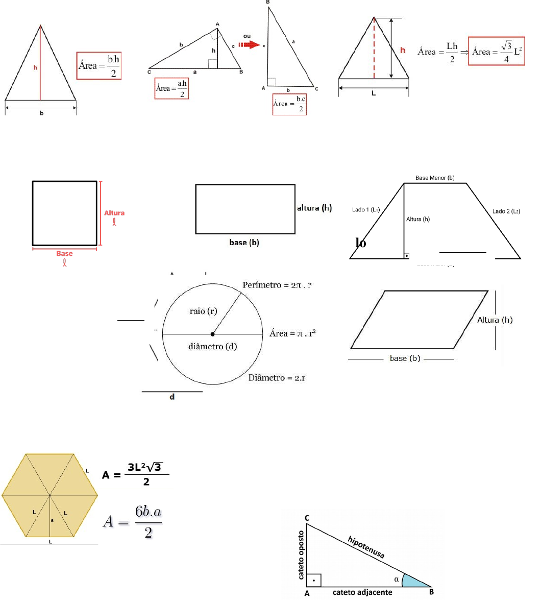 Resumo Das Fórmulas de Geometria Plana Triângulo Triângulo Equilátero Geral Triângulo Retângulo Quadrado Retângulo Trapézio A = l² A = bxh A= Losango Círculo Paralelogramo A = b x h A= Hexágono Teorema de PitágorasO Teorema de Pitágoras relaciona o comprimento dos lados do triângulo retângulo. Essa figura geométrica é formada por um ângulo interno de 90°, chamado de ângulo reto. hipotenusa2 = cateto2 + cateto2 Resumo Das Fórmulas de Geometria Espacial Cubo Paralelepípedo Alateral = 4a2 · Abase = a x b · ATotal = 2ab+2bc+2ac · Volume = a x b x c · Diagonais = √a2 + b2 + c2 Abase = a2 Atotal = 6 x a2 Volume = a3 DLateral: d = a√2 DCubo: d = a√3 Prisma Alateral = n x a Atotal = Alateral + 2Abase V = Abase x h Pirâmide Atotal: Alateral + Abase Volume = Abase x h Cilindro Cone Abase= π x r2 Abase = π x r2 Alateral= 2 π x r x h Alateral = π x r x g Atotal= 2Abase + Alateral Atotal = π x r (g + r) Volume = Abase x h Volume = π x r2 x h Esfera Aesfera = 4 x π x r2 Vesfera = image5.png image6.jpg image7.jpeg image8.jpeg image9.jpeg image10.jpeg image11.jpeg image12.jpeg image13.png image14.png image15.png image16.jpeg image17.jpeg image18.png image19.jpeg image20.png image1.jpeg image2.jpeg image3.jpeg image4.png