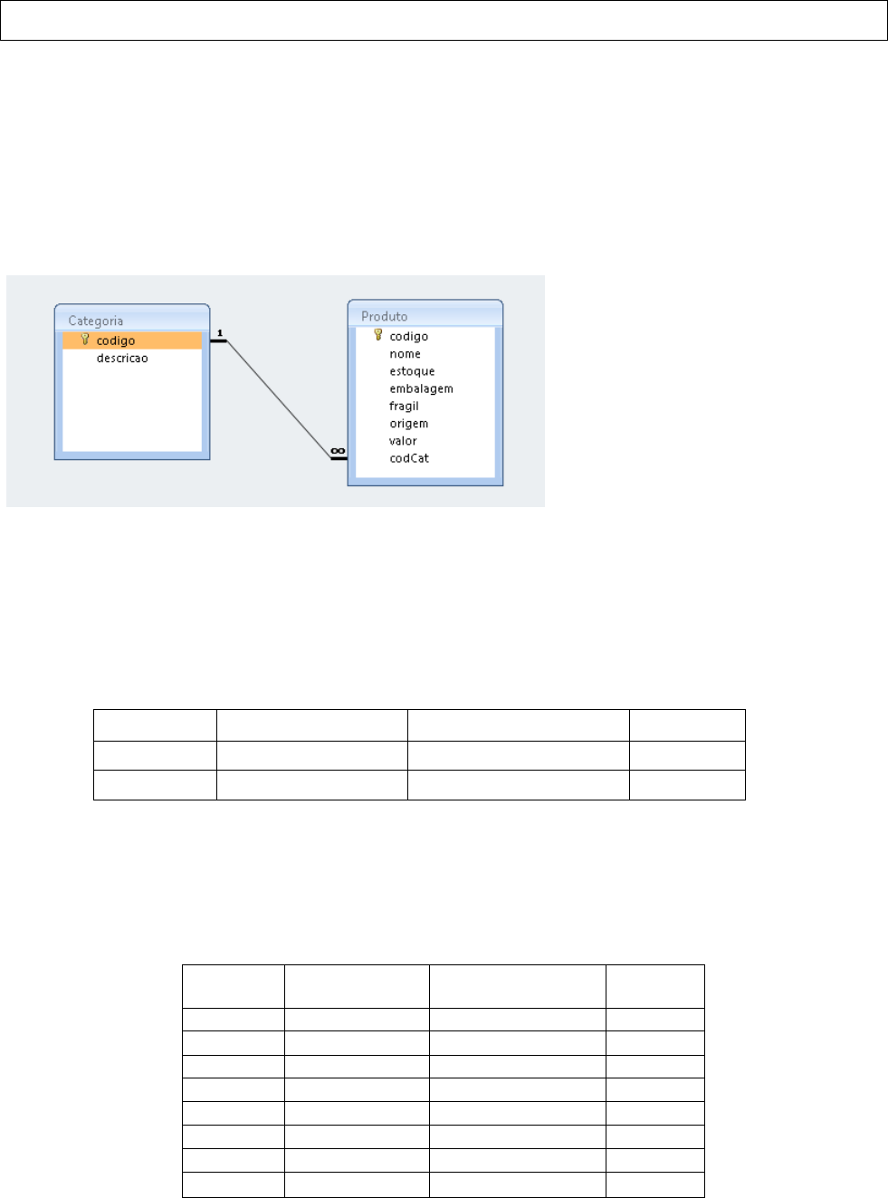 DELPHI COM ACESSO A BANCO DE DADOS TRABALHANDO COM ADOQUERY O componente Query é um componente dataset, assim como o Table, especializado em conexões com tabelas. A diferença entre eles está na forma como acessam as informações. O Table liga-se diretamente a uma única tabela, através da propriedade TableName. O Query faz suas ligações através da linguagem SQL, o que lhe possibilita o acesso a várias tabelas. O Query também possui métodos mais eficientes de acesso aos recursos do servidor do que o Table. Além de fazer uso de uma linguagem mais eficiente, permite o servidor processar requisições mais rapidamente e com menos tráfego de rede. Os exemplos conduzidos por este material serão baseados em um banco de dados Access contendo duas tabelas: Produto e Categoria. As mesmas usadas no material “Uso do Componente ADOConnection”. Mostraremos novamente o modelo e as especificações de tabelas a seguir: 1) Criando o Banco de Dados Para definir o banco de dados, usaremos o SGBD Access da Microsoft. Entre no programa, crie um banco de dados vazio e salve em uma pasta Consprod. a) Criação da Tabela Categoria Selecione a opção Criar Tabela no Modo Estrutura e informe os seguintes dados na janela: Nome do campo Tipo de dados Tamanho Chave codigo Autonumeração descricao Texto 40 Salve a tabela com o nome “Categoria”. Abra a tabela Categoria no modo dados e informe os seguintes valores para a coluna descricao: Limpeza, Alimentação, Vestuário e Bebidas. Para salvar um registro, basta pressionar seta para baixo ou para cima. Observe que o codigo da Categoria é inserido automaticamente assim que o registro é salvo. b) Criação da Tabela Produto Selecione a opção Criar Tabela no Modo Estrutura e informe os seguintes dados na janela: Nome do campo Tipo de dados Tamanho Chave codigo Autonumeração nome Texto 50 estoque Inteiro embalagem Texto 5 frágil Texto 1 Origem Texto 25 Valor Moeda codCat Inteiro Longo Salve a tabela com o nome “Produto” 2) Criando o Projeto CadProdutos Entre no Delphi, selecione File , Save All e salve a unit como uProduto na pasta ConsProduto e em seguida o projeto, como PConsProduto. Altere as seguintes propriedades do formulário: • Name= FconsProduto • Caption = Cadastro de Produtos • Position=poScreenCenter. 3) Definindo o Módulo de Dados Para criar o módulo de dados, acesse a opção File New Data Module. Salve a unit como “UDM”. Em seguida, altere o nome do Datamodule (propriedade name) para DM. a) ADOConection Insira um componente ADOConnection (paleta ADO) no data module e altere as seguintes propriedades ConnectionString: Selecione a propriedade ConnectionString e clique nas reticências. Na janela que se abrirá, verifique se a opção “Use Connection String” está marcada e clique no botão Build para abrir a janela “Propriedade de Vinculação de dados”. Na orelha Provedor, selecione o driver “Microsoft Jet 4.0 OLE DB Provider” e clique em avançar. Na aba Conexão clique nas reticências do item 1 e selecione o banco de dados (consprod.mdb) que será acessado e clique em Ok. Loginprompt: False (inibe a janela de senha do banco de dados) Name: ADOConsProd (padrão ADO + nome_do_programa) Connected: True b) ADOQuery Insira um componente ADOQuery (paleta ADO) e altere as seguintes propriedades • Connection: selecione o nome do componente ADOConnection (ADOConsProd); • Name: QrProd c) Datasource Insira um componente Datasource (paleta Data Access) e altere as seguintes propriedades • Dataset: selecione o nome do componente ADOquery (QrProd); • Name: DsConsProd d) ADOTable Insira um componente AdoTable (paleta ADO) e altere as seguintes propriedades • Connection: selecione o nome do componente ADOquery (QrProd); • Name: TBCat • Tablename: Categoria • Active: True e) Datasource Insira um componente Datasource (paleta Data Access) e altere as seguintes propriedades • Dataset: TBCat; • Name: DsCat Seu data module deve estar semelhante ao da figura abaixo: PARTE 1 – EXECUTANDO A CONSULTA a) Torne o formulário FconsProd ativo. Em seguida, faça-o usar a unit do data module entrando na opção File Use Unit e selecionando Udm; b) insira componente DBGrid (Data Controls) e altere a propriedade Datasource para DM.DsConsProd (nome do datasource ligado ao query) c) insira um botão no formulário, altere seu Caption para “Ver todos” e acrescente o seguinte código no seu evento OnClick: DM.QrProd.Close; // fecha o query DM.QrProd.SQL.Clear; // apaga conteúdo da propriedade Sql DM.QrProd.SQL.Add('SELECT * FROM produto'); // adiciona o comando SQL DM.QrProd.Open; // executa o query Execute o programa. Como você pôde perceber, o ADOquery é semelhante ao componente ADOtable no que diz respeito à conexão com os componentes de acesso, pois ambos são datasets. Entretanto, todo ADOquery por padrão retorna um resultset não editável. Na maioria das situações, ao invés de consultarmos todos os registros de uma tabela, selecionamos apenas uma parte deles, acrescentando uma cláusula WHERE em nosso comando SQL. Entretanto, essa cláusula pode não requerer um valor fixo, mas algo variável provindo da interface com o usuário. Nesse caso, chamamos esse valor de parâmetro. O parâmetro é identificado dentro do comando SQL colocando-se um sinal de dois pontos ( : ) antes do nome de uma variável. Por exemplo: WHERE nome = :cliente -> cliente é um parâmetro WHERE salario > :valor -> valor é um parâmetro Para exemplificar, iremos construir uma consulta que selecione todos os produtos que possuem uma determinada origem. Ao verificarmos os registros da tabela Produto, vemos que a coluna “ORIGEM” pode assumir os seguintes valores: São Paulo e Belo Horizonte. Baseado nisso, iremos inserir um componente de seleção na interface que permita a escolha da origem. PARTE 2 – USANDO SQL PARA A CONSULTA a) Insira um label no form e altere seu Caption para “Origem”; b) insira um Combob