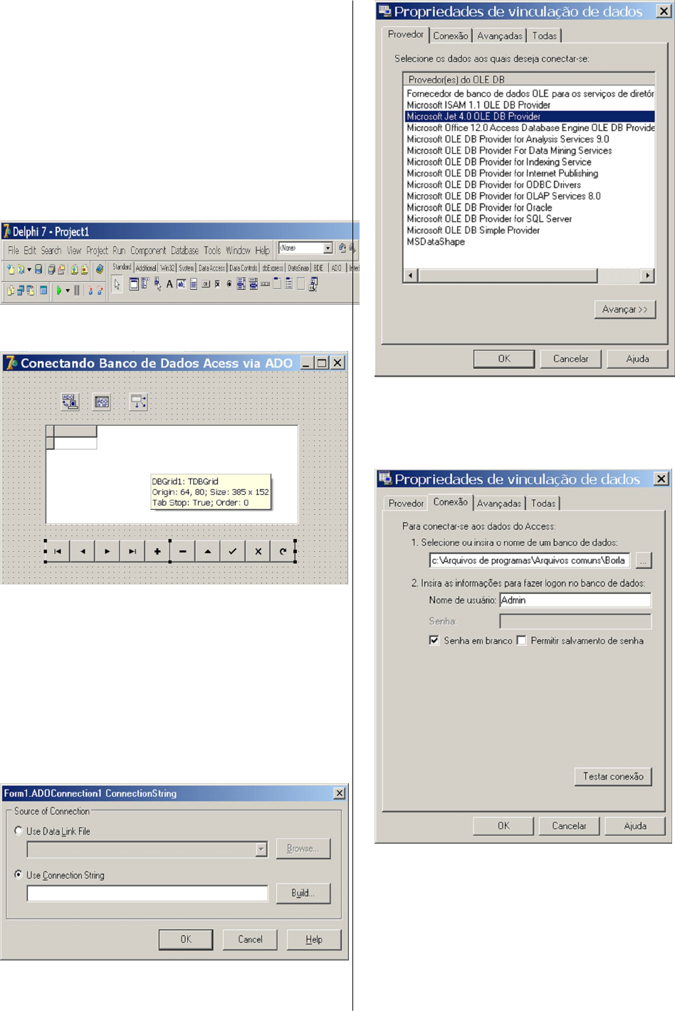 LTP2 - DELPHI ADO com ACCESS Pertencente a família Microsoft, a camada de acesso ADO, incorporada ao DELPHI 7 Enterprise, podendo ser vendida separadamente aos usuários da versão Profissional, veio para facilitar demais a utilização dos bancos de dados ACCESS e SQL Server. De maneira fácil e intuitiva, você consegue efetuar a conexão e utilizar diretamente esta camada de acesso utilizando o driver nativo do banco, obtendo performance e estabilidade. Para nosso exemplo utilizaremos os seguintes componentes: Coloque no form os seguintes componentes: - Ado Connection (Paleta ADO) - Ado table (Paleta ADO) - Data Source (Paleta Data Access) - DB Grid (Paleta Data Controls) - DB Navigator (Paleta Data Controls) Agora vamos ligá-los: No ADOConnection1 Propriedade ConnectionString – Clique nos … Clique em Build… Selecione o drive do Access: Microsoft Jet 4.0 OLE DB Provider Clique em Avançar>> No Item 1 – Selecione o nome do Banco de Dados, clique nos ... Set o path: C:\Arquivos de programas\Arquivos comuns\Borland Shared\Data\dbdemos.mdb Clique no botão: Testar conexão 2 Aparecendo esta mensagem, OK sua conexão está concluída com êxito Clique OK, depois Clique OK e Clique OK. Ainda no ADOConnection, Propriedade: Connection selecione: True Caso apareça a janela: Clique em OK... E na propriedade LoginPrompt , selecione FALSE, para que esta janela não apareça cada vez que você conectar ao banco de dados. Continuando .... No DataSource1, propriedade: DataSet:= ADOTable1 No DBGrid1, propriedade: DataSource:=DataSource1 No DBNavigator, propriedade: DataSource:=DataSource1 No ADOTable1, propriedade: Connection:=ADOConnection1 TableName:=country Active:=True Pronto veja como ficou seu exemplo: agora rodando ...