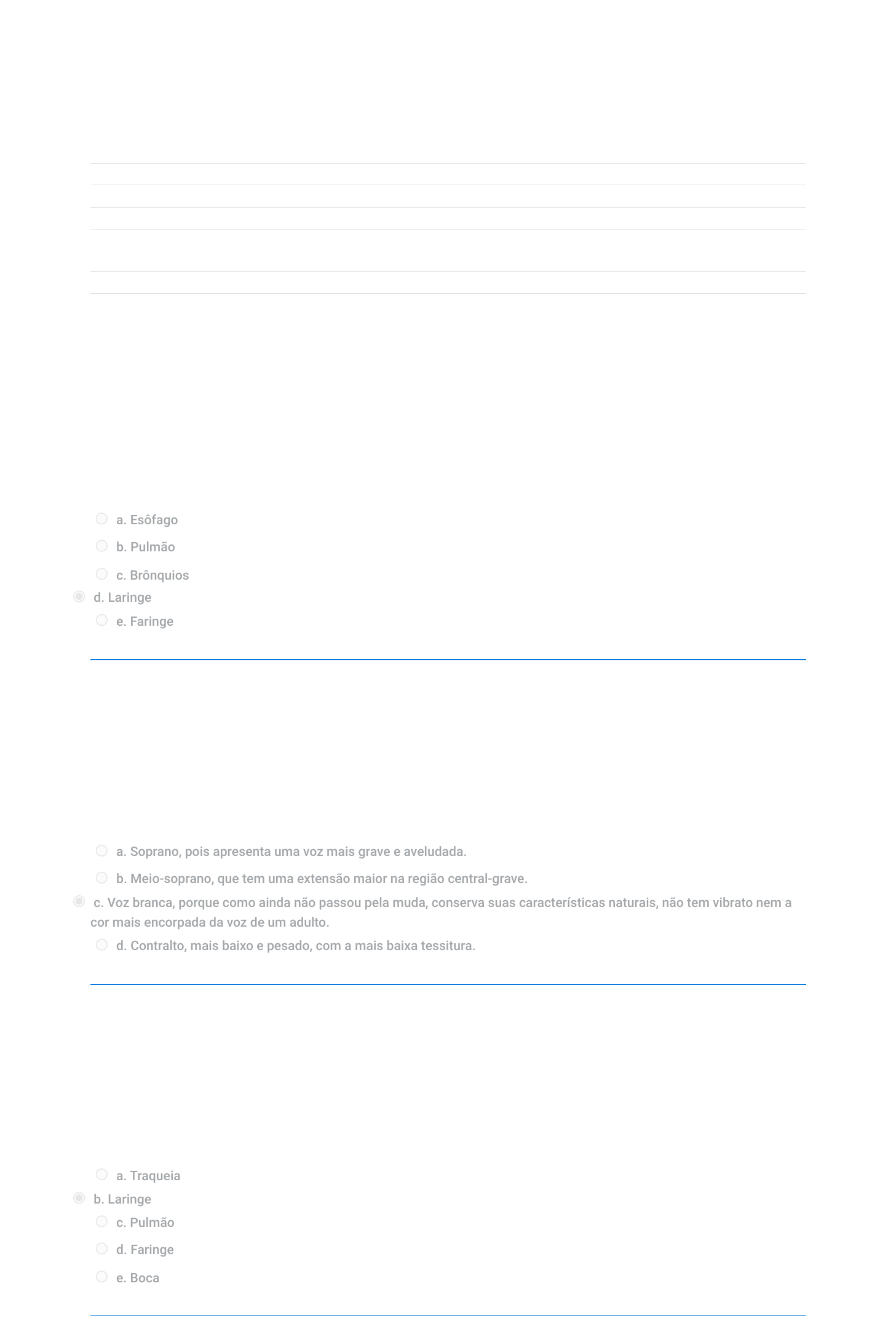 Painel / Meus Cursos / Extensão / Fundamentos da Voz / Atividades / Simulado - Fundamentos da Voz Iniciado em sexta, 1 Nov 2024, 20:47 Estado Finalizada Concluída em sexta, 1 Nov 2024, 20:55 Tempo empregado 8 minutos 11 segundos Avaliar 8,0 de um máximo de 10,0(80%) Comentários Parabéns! Você está apto(a) a realizar sua prova. Questão 1 Incorreto Atingiu 0,0 de 1,0 Questão 2 Correto Atingiu 1,0 de 1,0 Questão 3 Correto Atingiu 1,0 de 1,0 Assinale a alternativa que apresenta uma estrutura comum ao sistema respiratório e digestivo. Escolha uma opção: a. Esôfago b. Pulmão c. Brônquios d. Laringe e. Faringe Como é chamada a voz da criança antes da muda vocal e por quê? Escolha uma opção: a. Soprano, pois apresenta uma voz mais grave e aveludada. b. Meio-soprano, que tem uma extensão maior na região central-grave. c. Voz branca, porque como ainda não passou pela muda, conserva suas características naturais, não tem vibrato nem a cor mais encorpada da voz de um adulto. d. Contralto, mais baixo e pesado, com a mais baixa tessitura. Em que órgão do sistema respiratório estão presentes as pregas vocais? Escolha uma opção: a. Traqueia b. Laringe c. Pulmão d. Faringe e. Boca 01/11/2024, 20:56 Simulado - Fundamentos da Voz: Revisão da tentativa https://grupoevolucao.com.br/ead/mod/quiz/review.php?attempt=498586&cmid=5376#question-502430-5 1/4 https://grupoevolucao.com.br/ead/my https://grupoevolucao.com.br/ead/course/index.php?categoryid=13 https://grupoevolucao.com.br/ead/course/view.php?id=159 https://grupoevolucao.com.br/ead/course/view.php?id=159#section-2 https://grupoevolucao.com.br/ead/mod/quiz/view.php?id=5376 Questão 4 Correto Atingiu 1,0 de 1,0 Questão 5 Incorreto Atingiu 0,0 de 1,0 Questão 6 Correto Atingiu 1,0 de 1,0 Responda: A respiração é composta da inspiração (tomada de ar) e expiração (liberacão do ar)? Escolha uma opção: a. Verdadeiro b. Falso Quando inspiramos, a epiglote se eleva, o ar passa pelas pregas vocais, chegando ate os pulmões. Na inspiração abrimos as costelas enquanto enchemos a base do pulmão de ar. Durante a fonação (fala ou canto) expiramos, devendo manter as costelas abertas, retardando ao máximo seu fechamento. A laringe é um órgão pertencente: Escolha uma opção: a. aos sistemas digestórios e respiratórios. b. ao sistema cardiovascular e digestório. c. ao sistema digestório. d. ao sistema respiratório. e. ao sistema cardiovascular. Durante a respiração, quando o diafragma se contrai e desce, o volume da caixa torácica aumenta, por conseguinte a pressão intrapulmonar: Escolha uma opção: a. aumenta e expulsa o ar dos pulmões. b. diminui e di�culta a entrada de ar. c. aumenta e facilita a entrada de ar. d. diminui e facilita a entrada de ar. e. aumenta e di�culta a entrada de ar. O processo descrito é o da inspiração, que faz com que a caixa torácica aumente de volume, diminuindo, assim, a pressão intrapulmonar e forçando a entrada do ar nos pulmões. 01/11/2024, 20:56 Simulado - Fundamentos da Voz: Revisão da tentativa https://grupoevolucao.com.br/ead/mod/quiz/review.php?attempt=498586&cmid=5376#question-502430-5 2/4 Questão 7 Correto Atingiu 1,0 de 1,0 Questão 8 Correto Atingiu 1,0 de 1,0 Questão 9 Correto Atingiu 1,0 de 1,0 Na laringe, observam-se faixas elásticas de músculo que vibram ao passar o ar. Essa estrutura é denominada Escolha uma opção: a. Glote. b. Epiglote. c. Amígdalas. d. Cartilagem crinoide. e. Pregas vocais. São características da voz infantil: Escolha uma opção: a. Possui pouca ressonância e harmônicos devido a presença de ligamento vocal maduro. b. Pequena extensão, tempo de fonação curto, maior facilidade para o agudo e sem vibrato. c. Cumprimento e espessura das pregas vocais são, respectivamente, curtas e �nas, produzindo um som mais grave. d. Tempo de fonação extenso e maior facilidade para produção graves. A criança começa a usar a voz para a fala desenvolvendo uma habilidade complexa e sofisticada no trato vocal, que dependem do grau de amadurecimento físico, cognitivo e emocional apresentado pela criança. Como a voz é produzida? Escolha uma opção: a. Pela vibração das pregas vocais, através da passagem de ar que causa a vibração das mesmas, o que resulta na produção sonora. b. Através de movimentos peristálticos, ondulando e comprimindo a passagem de ar. c. Pelo fechamento da epiglote, pressionado pela traqueia. d. Pelo estreitamento da faringe. 01/11/2024, 20:56 Simulado - Fundamentos da Voz: Revisão da tentativa https://grupoevolucao.com.br/ead/mod/quiz/review.php?attempt=498586&cmid=5376#question-502430-5 3/4 Questão 10 Correto Atingiu 1,0 de 1,0 Durante o processo de inspiração, ocorre: Escolha uma opção: a. contração do diafragma e manutenção do repouso dos músculos intercostais externos. b. relaxamento do diafragma e contração dos músculos intercostais externos. c. contração do diafragma e contração dos músculos intercostais externos. d. relaxamento do diafragma e relaxamento dos músculos intercostais externos. e. contração do diafragma e relaxamento dos músculos intercostais externos. ◄ Tarefa - Fundamentos da Voz Seguir para... Glossário - Fundamentos da Voz ► 01/11/2024, 20:56 Simulado - Fundamentos da Voz: Revisão da tentativa https://grupoevolucao.com.br/ead/mod/quiz/review.php?attempt=498586&cmid=5376#question-502430-5 4/4 https://grupoevolucao.com.br/ead/mod/assign/view.php?id=5375&forceview=1 https://grupoevolucao.com.br/ead/mod/glossary/view.php?id=5377&forceview=1
