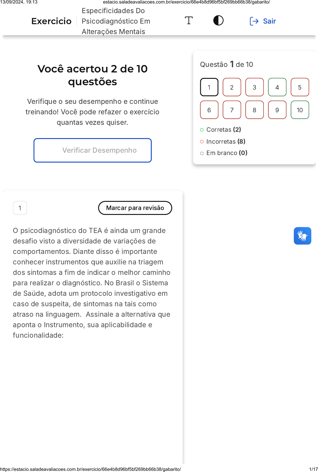 Você acertou 2 de 10 questões Verifique o seu desempenho e continue treinando! Você pode refazer o exercício quantas vezes quiser. Verificar Desempenho 1 Marcar para revisão O psicodiagnóstico do TEA é ainda um grande desafio visto a diversidade de variações de comportamentos. Diante disso é importante conhecer instrumentos que auxilie na triagem dos sintomas a fim de indicar o melhor caminho para realizar o diagnóstico. No Brasil o Sistema de Saúde, adota um protocolo investigativo em caso de suspeita, de sintomas na tais como atraso na linguagem. Assinale a alternativa que aponta o Instrumento, sua aplicabilidade e funcionalidade: Questão 1 de 10 Corretas �2� Incorretas �8� Em branco �0� 1 2 3 4 5 6 7 8 9 10 Exercicio Especificidades Do Psicodiagnóstico Em Alterações Mentais Sair 13/09/2024, 19:13 estacio.saladeavaliacoes.com.br/exercicio/66e4b8d96bf5bf269bb66b38/gabarito/ https://estacio.saladeavaliacoes.com.br/exercicio/66e4b8d96bf5bf269bb66b38/gabarito/ 1/17 A B C A.B.C é um instrumento adotado como instrumento de triagem, utilizado somente nas redes particulares e clínicas especializadas em TEA. Assim, o médico do SUS identificando os sinais apontados no DSM�V, encaminha para redes especializadas e conveniadas A.B.C. utilizado no Brasil, sendo obrigatório na rede de saúde pública, onde médico do identificando os sinais apontados no DSM�V, encaminha para o Centro de Triagem onde o A.B.C. é aplicado. Classificação de alto risco, segue para o psicodiagnóstico M�Chat é um instrumento amplamente usado no Brasil como instrumento de triagem utilizado somente nas redes particulares e clínicas especializadas em TEA. Assim, o médico do SUS identificando os sinais apontados no DSM�V, encaminha para redes especializadas 13/09/2024, 19:13 estacio.saladeavaliacoes.com.br/exercicio/66e4b8d96bf5bf269bb66b38/gabarito/ https://estacio.saladeavaliacoes.com.br/exercicio/66e4b8d96bf5bf269bb66b38/gabarito/ 2/17 D E M�Chat é um instrumento amplamente usado no Brasil como instrumento de triagem utilizado na rede de saúde pública, com o objetivo de encaminhar ao especialista, caso obedeça os critérios de riscos com classificação de moderado (pontuação 3�7) e alto risco (pontuação: 8�20�, para sequenciar a avaliação M�Chat é um instrumento aplicado na rede pública de saúde, com a finalidade de triagem, sendo encaminhado para o psicodiagnóstico somente a classificação de alto risco, para sequenciar a avaliação Resposta incorreta Opa! A alternativa correta é a letra D. Confira o gabarito comentado! Gabarito Comentado O instrumento utilizado pelo SUS e sua aplicabilidades é o M�CHAT�R/F � Escala para Rastreamento de Autismo Revisada: bastante utilizada no Brasil, sendo obrigatório na rede de saúde pública. Elaborado para triagem do autismo com o objetivo de encaminhar para um especialista, caso preencha os requisitos. Ela aponta três riscos definidos: baixo (pontuação: 0�2�, moderado (pontuação 3� 7) e alto risco (pontuação: 8�20�. A partir da classificação moderado é encaminhado para sequenciar a avaliação 13/09/2024, 19:13 estacio.saladeavaliacoes.com.br/exercicio/66e4b8d96bf5bf269bb66b38/gabarito/ https://estacio.saladeavaliacoes.com.br/exercicio/66e4b8d96bf5bf269bb66b38/gabarito/ 3/17 A B C D E 2 Marcar para revisão O TEA, de acordo com a nova classificação do DSM�V, pode se apresentar em nível leve, moderado ou severo, sendo associada esta classificação aos níveis de comprometimento do sujeito, principalmente nos aspectos de comunicação e interação social. Em se tratando do psicodiagnóstico no autismo, para compor a fase inicial sugere-se uma Bateria de avaliação, que investigue os prejuízos de comportamento social e linguagem, principalmente e neste contexto então, sugere-se utilizar os seguintes instrumentos: BAI, BHS e BSI WAIS III e WISC IV PROTEA�R, ABC e CARS BDI II, BSI e BAI Pirâmides de Pfister e WAIS III Resposta incorreta Opa! A alternativa correta é a letra C. Confira o gabarito comentado! Gabarito Comentado O diagnóstico é estreitamente clínico �DSM�V,2013�, sendo o Psicodiagnóstico indicado para descartar possibilidades de outros diagnósticos. Neste, sugere-se que 13/09/2024, 19:13 estacio.saladeavaliacoes.com.br/exercicio/66e4b8d96bf5bf269bb66b38/gabarito/ https://estacio.saladeavaliacoes.com.br/exercicio/66e4b8d96bf5bf269bb66b38/gabarito/ 4/17 A B C além da observação clínica minuciosa, aplicação de protocolo investigativo, com Instrumentos para rastreio de sinais, severidade e comprometimento do paciente com hipótese diagnóstica de TEA� PROTEA�R, ABC e CARS e M�CHAT�R/F. 3 Marcar para revisão Em se tratando de ansiedade, pode-se dizer que seres humanos, vez ou outra, apresenta sinais de ansiedade frente a mudanças ou desafios, porém em alguns casos essa ansiedade torna-se persistente trazendo prejuízos e sofrimentos para o indivíduo. Neste contexto, é importante no psicodiagnóstico: Entrevista psicológica e a Bateria BPA auxiliam na compreensão dos níveis de ansiedade Realizar Entrevista Clínica Psicológica, pautada na correlação entre critérios estabelecidos no DSM�V ou CID�11 e a aplicação de Instrumentos de avaliação Psicológica, como por exemplo o Inventário de Ansiedade de Beck - BAI O parâmetro diagnóstico é investigar através da Entrevista Psicológica a frequência em que o sujeito sente-se ansioso e o quanto ele consegue lidar com a ansiedade, não existindo instrumentos de medidas que auxilie neste processo; 13/09/2024, 19:13 estacio.saladeavaliacoes.com.br/exercicio/66e4b8d96bf5bf269bb66b38/gabarito/ https://estacio.saladeavaliacoes.com.br/exercicio/66e4b8d96bf5bf269bb66b38/gabarito/ 5/17 D E Aplicar a Escala de Beck para investigar se há presença de ideação suicida - BSI pois este é o parâmetro para julgar se os níveis de ansiedade tem trazido prejuízo para vida diária Conversar 