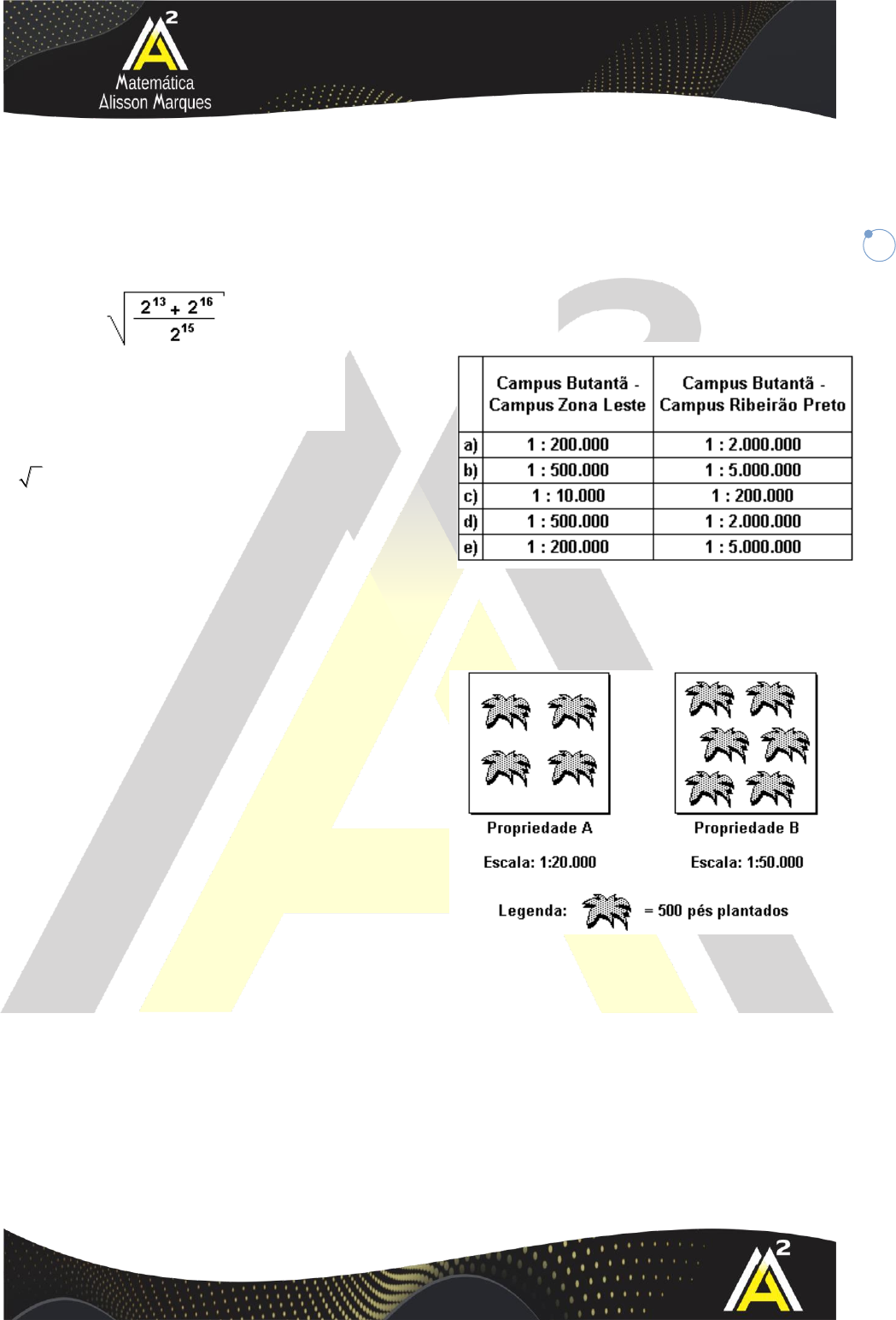REVISÃO 2 1 1. (G1) (ESPM 97) Simplificando a expressão obtemos: a) 2 b)1,5 c)2,25 d)27 e)1 2. (Ufrgs) Considere as afirmações abaixo sobre escala cartográfica. I - Uma estrada em linha reta, entre duas cidades que distam entre si 350 km, teria exatamente 35 cm num mapa em escala 1:100.000. II - Moradias urbanas representadas num mapa em escala 1:10.000 sofrem generalização em seu traçado quando passam a ser representadas em uma escala menor. III - Se um mapa na escala de 1:20.000, representado em uma quadrícula de 20 cm por 40 cm, for reduzido para a escala 1:10.000, as dimensões da nova quadrícula passarão a ser de 10 cm por 20 cm. Quais estão corretas? a)Apenas I. b)Apenas II. c)Apenas I e III. d)Apenas II e III. e)I, II e III. 3. (Fuvest) O Campus da USP - Butantã dista, aproximadamente, 23 km do Campus da USP - Zona Leste e 290 km do Campus da USP - Ribeirão Preto, em linha reta. Para representar essas distâncias em mapas, com dimensões de uma página de aproximadamente 25 × 18 cm, as escalas que mostrarão mais detalhes serão, respectivamente, 4. (Ufscar) O esquema representa a área total de duas propriedades rurais, A e B, nas quais se pratica o cultivo do mesmo tipo de produto. Baseado nesse esquema, pode-se afirmar que a)as duas propriedades têm, na realidade, a mesma dimensão em m2. b)o cálculo da escala de A foi feito em m2 e da escala de B em hectare. c)a propriedade B tem menor número de pés plantados por hectare. d)as duas propriedades têm o mesmo número de pés plantados. e)as duas propriedades têm o mesmo número de pés plantados por hectare REVISÃO 2 2 5. (Ufrn) Imagine que você tenha de fazer a leitura do mapa da Grande Natal com a localização das indústrias que recentemente se instalaram nessa área. Considerando que o referido mapa foi confeccionado na escala de 1:50.000, você pode inferir que ele a)permitirá a visualização e o detalhamento das indústrias têxteis, por ser construído numa escala pequena. b)mostrará com detalhes as indústrias e suas localizações. c)facilitará a visualização dos detalhes das unidades industriais, por ser construído numa escala grande. d)possibilitará a visualização das áreas onde estão instaladas as indústrias. 6. (Uefs) Há uma década, um terço dos estudantes de uma universidade vinha de escolas públicas, e os demais, de escolas particulares. Desde então, o número de estudantes vindos de escolas públicas teve um aumento de 80%, enquanto os de particulares aumentaram 50%. Hoje, os alunos de escolas públicas representam uma fração do total de alunos da universidade igual a a) 3 8 b) 3 7 c) 4 9 d) 5 9 e) 5 8 7. (Enem PPL) Um paciente precisa ser submetido a um tratamento, sob orientação médica, com determinado medicamento. Há cinco possibilidades de medicação,variando a dosagem e o intervalo de ingestão do medicamento. As opções apresentadas são: A: um comprimido de 400 mg, de 3 em 3 horas,durante 1 semana; B: um comprimido de 400 mg, de 4 em 4 horas,durante 10 dias; C: um comprimido de 400 mg, de 6 em 6 horas,durante 2 semanas; D: um comprimido de 500 mg, de 8 em 8 horas,durante 10 dias; E: um comprimido de 500 mg,de 12 em 12 horas,durante 2 semanas. Para evitar efeitos colaterais e intoxicação, a recomendação é que a quantidade total de massa da medicação ingerida, em miligramas, seja a menor possível. Seguindo a recomendação, deve ser escolhida a opção a)A. b)B. c)C. d)D. e)E. 8. (Uefs) Considere os dados fictícios do E- commerce de algumas cidades brasileiras e as respectivas populações: Após análise dos dados, pode-se concluir que uma cidade, que não é capital, apresenta, aproximadamente, uma receita a) 6,5 vezes menor do que BH FS. b) 6,0 vezes menor do que SP. c) 5,5 vezes menor do que RJ. d) 4,0 vezes menor do que B C. e) 3,5 vezes menor do que FS. Cidade SP RJ BH FS B C E-commerce (em bilhões de reais) 6,8 4,9 3,4 2,4 1,7 1,1 População (em milhões de hab.) T V X Y W Z B = Brasília C = Campinas FS = Feira de Santana REVISÃO 2 3 9. (Espm) Duas impressoras iguais imprimem 5000 páginas em 30 minutos. Se elas forem substituídas por uma só impressora 20% mais eficiente que cada uma das anteriores, 3600 páginas seriam impressas num tempo de: a) 36 min b) 42 min c) 24 min d) 28 min e) 48 min 10. (Ufrn) Numa pesquisa de opinião, feita para verificar o nível de aprovação de um governante, foram entrevistadas 1000 pessoas, que responderam sobre a administração da cidade, escolhendo uma - e apenas uma - dentre as possíveis respostas: ótima, boa, regular, ruim e indiferente. O gráfico abaixo mostra o resultado da pesquisa. De acordo com o gráfico, pode-se afirmar que o percentual de pessoas que consideram a administração ótima, boa ou regular é de a)28%. b)65%. c)71%. d)84%. 11. (Ufg) De uma torneira, a água está pingando a uma frequência constante de uma gota a cada 25 segundos. Durante o período de 21h30min até 6h15min do dia seguinte, um recipiente coletou 120 mililitros (mL) de água. Conforme as informações apresentadas, julgue os itens a seguir. ( ) No período mencionado, caiu no recipiente um total de 1.290 gotas d'água. ( ) O volume de cada gota d'água é menor que 0,1mL. ( ) Mantendo-se a mesma frequência, o volume de água coletado, durante 17 horas, será superior a 240mL. ( )Se a frequência fosse de duas gotas por minuto, o volume de água coletado, no mesmo período, seria 20% maior. 12. (Uepg) Na figura abaixo, em que o ponto B localiza-se a leste de A, a distância AB = 5 km. Neste momento, um barco passa pelo ponto C, a norte de B, e leva meia hora para atingir o ponto D. A partir destes dados, assinale o que for correto. 01) AC = 10 km 02) AD = 2,5 km 04)BD = 5 3 km 08)O ângulo BÂD mede 60° 16)A velocidade média do barco é de 15 km/h a) 15 b)27 c)6 d)23 REVISÃO 2 4 13. (Ufjf) Um topógrafo foi chamado para obter a altura de um edifício. Para fazer isto, ele colocou um teodolito (instrumento ó