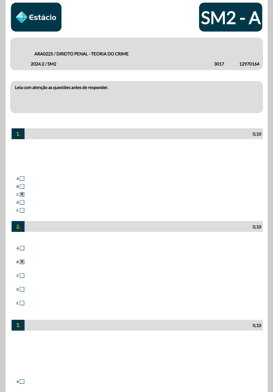 7034300548 SM2 - A 17/10/2024 07:57 Nome: Matrícula: ____________________ Disciplina: ARA0225 / DIREITO PENAL - TEORIA DO CRIME Data: ___ /___ /______ Período: 2024.2 / SM2 Turma: 3017 NSQ: 12970164 Leia com atenção as questões antes de responder. É proibido o uso de equipamentos eletrônicos portáteis e consulta a materiais de qualquer natureza durante a realização da prova. Boa prova. 1. _______ de 0,10 (Prova: SELECON - 2019 - Prefeitura de Niterói - RJ - Guarda Civil Municipal) Paul Polônio é motorista pro�ssional e apreciador das corridas de alta velocidade. Conduzindo seu próprio automóvel, tem o hábito de reunir-se com amigos para realizar corridas ilícitas em vias públicas conhecidas como ¿rachas¿. Em um desses eventos, uma das pessoas presentes vem a ser atingida pelo veículo conduzido por Paul, vindo a falecer. Nesse caso, aplicando-se a parte geral do Código Penal e adequada interpretação jurisprudencial, o crime ocorrido deve ser caracterizado como doloso: Alternativas presente aberto eventual direto negligente 2. _______ de 0,10 Em relação ao lugar do crime, territorialidade e extraterritorialidade da lei penal, assinale a alternativa correta. Não se consideram extensão do território nacional aeronaves privadas a serviço do governo brasileiro em espaço aéreo correspondente a outro país. Se a execução de um delito ocorrer em território estrangeiro, mas o resultado ocorrer em território nacional, é correto afirmar que tal delito ocorreu em território nacional. Crime cometido no estrangeiro contra a vida ou liberdade do Presidente da República brasileiro está sujeito a lei penal brasileira desde que o agente não tenha sido absolvido no estrangeiro. Ficam sujeitos à lei penal brasileira, embora cometidos no estrangeiro, independentemente de condições, os crimes praticados por brasileiro contra brasileiro ou estrangeiro residente no Brasil. Se a execução de um delito ocorrer em território nacional, mas o resultado ocorrer em território estrangeiro, não é correto afirmar que tal delito ocorreu em território nacional. 3. _______ de 0,10 Em determinado set de filmagens, Hades, produtor técnico, entrega arma de fogo verdadeira, devidamente municiada, para o ator Ares, fazendo-o acreditar que se trata de arma cenográfica, sem potencial de efetuar disparos. Já tendo lido o script e presenciado os ensaios, Hades sabia previamente que, nas cenas que seriam filmadas, Ares deveria apontar a arma para Atena e, após breve diálogo, efetuar o disparo para a cena fatal. Querendo a morte de Atena, em razão de desavenças pretéritas, Hades faz a substituição da arma, fornecendo-a diretamente a Ares, irrogando o famoso ¿quebre a perna¿. Ares efetua o disparo e ceifa a vida de Atena. Do ponto de vista jurídico-penal: Ares e Hades responderão por homicídio doloso, como coautores; Ares e Hades responderão por homicídio doloso, o primeiro como partícipe e o segundo como autor; Ares não responderá por crime e Hades responderá por homicídio doloso. Ares e Hades responderão por homicídio doloso, o primeiro como autor e o segundo como partícipe; Ares responderá por homicídio culposo e Hades por homicídio doloso; 4. _______ de 0,10 1. Não há crime quando o agente pratica o fato: I. Em estado de necessidade II. Por doença mental ou desenvolvimento mental incompleto ou retardado, ao tempo da ação ou da omissão, sendo inteiramente incapaz de entender o caráter ilícito do fato ou de determinar-se com esse entendimento. III. Em legítima defesa. IV. Em estrito cumprimento do dever legal ou no exercício regular do direito. Apenas a assertiva III está correta. Apenas as assertivas III e IV estão corretas. Apenas as assertivas I, III e IV estão corretas. Apenas as assertivas I e II estão corretas. Apenas a assertiva II está correta. 5. _______ de 0,10 A médica M. deseja matar o paciente P. Para tanto, entrega ao enfermeiro E. uma ampola contendo substância venenosa, rotulando-a como medicamento e dizendo a E. que o conteúdo da ampola deve ser ministrado imediatamente a P. mediante injeção. E. injeta em P. a substância venenosa, indo P. imediatamente a óbito. Levando em consideração o caso hipotético acima, assinale a alternativa correta. M. deve responder por homicídio doloso quali�cado pelo emprego de veneno, enquanto E. responderá por homicídio culposo, visto que o erro sobre elemento constitutivo do tipo legal de crime exclui o dolo, mas permite a punição por crime culposo, se previsto em lei. Ainda que se trate de hipótese de autoria mediata, tendo o Código Penal brasileiro adotado o conceito unitário de autor, isso não afeta a responsabilidade penal de E. Apenas M. deve responder por homicídio doloso quali�cado pelo emprego de veneno, visto que E., apesar de ter causado a morte de P., desconhecia o conteúdo da ampola. Tanto M. quanto E. devem responder por homicídio doloso quali�cado pelo emprego de veneno, pois, segundo a legislação penal, quem, de qualquer modo, concorre para o crime incide nas penas a este cominadas. Apenas E. deve responder por homicídio doloso quali�cado pelo emprego de veneno, visto que M., apesar de ter a intenção de matar P., não praticou qualquer conduta típica de homicídio. 6. _______ de 0,10 Cleiton, policial federal e professor de curso de direção defensiva e ofensiva, viajava de carro com sua namorada, Gisele. Durante a viagem, Gisele reclamou da alta velocidade empreendida pelo namorado e o alertou da possibilidade de causar um acidente, tendo em vista o tempo chuvoso. Cleiton, por sua vez, respondeu que nada aconteceria, porque ele era um pro�ssional competente, de excelência, que ensinava outros policiais rodoviários federais a pilotarem viaturas. Entretanto, durante uma curva, o veículo derrapou na pista molhada, o carro �cou desgovernado, capotou e Gisele faleceu instantaneamente. Cleiton sofreu pequenas escoriações. A perícia feita 