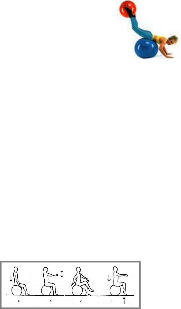 Cinesioterapia Profa Adriane Mazola Russ EExxeerrccíícciiooss ccoomm BBoollaa TTeerraappêêuuttiiccaa Condições da Bola O solo para realização dos exercícios com bola suíça ou bola Bobath deve ser firme e antideslizante; As bolas podem ser limpas facilmente no tanque com água, detergente bactericida, e enxaguadas e secas com toalha; Ao utilizar a bola em ambiente hospitalar, evite colocá-la no chão entre os exercícios. Para impedir o que se chama de contaminação cruzada, jamais utilize a mesma bola em pacientes diferentes sem que antes tenha sido lavada; Para os exercícios de equilíbrio, a bola precisa estar firmemente inflada, o que pode ser feito com um compressor pequeno de encher pneus. Para melhor conforto, esvaziar um pouco a bola quando for posicionar o pcte em dv; A pressão deverá maior para pacientes mais pesados; O tamanho da bola precisa ser selecionado baseando-se nas características físicas do paciente, com relação ao comprimento de tronco e tórax; pessoa com pernas longas, requer bola maior; Condições de Segurança Ao usar a bola suíça a segurança do paciente deve ser a preocupação primária de terapeuta durante o tempo todo; Equilíbrio: deve ser testado antes da prescrição dos exercícios para verificar a capacidade do pcte em se manter sobre a bola com e sem auxílio; Pacientes com diminuição de sensibilidade em um ou ambos os lados do corpo e diminuição da imagem corporal devem ser observados de perto, e necessitarão de espelhos para aumentar sua segurança; Uso de cintas entre o fisioterapeuta e o pcte, bem como bolas de areia, calços e estabilizadores, podem prover maior segurança e base de estabilização para impedir que o pcte venha a sofrer algum acidente; As roupas e calçados devem ser apropriados para os exercícios. Cuidado com roupas e calçados escorregadios e cabelos compridos soltos! Jamais utilize bolas remendadas. Elas facilmente poderão estourar, sendo portanto, extremamente perigosas. Utiliza sempre o bom senso ao prescrever qualquer tipo de exercício. Tenha em mente que se o pcte queixar-se de dor, provavelmente está fazendo o exercício de forma errada ou estará fazendo um exercício que é contra-indicado para sua condição. Exemplos de Exercícios com Bola com Suíça Cowboy Objetivos: Treinar uma boa postura ereta que seja automática e econômica; Fortalecer o quadríceps e os músculos da panturrilha; Preparar o paciente para o treino de marcha; Praticar balanceio assimétrico dos braços; Tamanho da bola: Em torno de 55 a 65 cm. O diâmetro da bola deve ser um pouco maior que a distância do joelho até o solo. Técnica: Paciente ereto sentado sobre a bola com os dois pés no solo; Quadris, joelhos e pés flexionados em 90º; Joelhos e pés separados na largura dos quadris; O pcte deverá empurrar o chão com os pés. Os quadríceps são ativados, e o tronco se move verticalmente para cima e para baixo, contrapondo a aceleração; Podem ser acrescentados movimentos de braços e pernas; Os músculos abdominais deverão impedir a extensão do tronco, se a ênfase do exercício de braços e mãos for para cima; Cinesioterapia Profa Adriane Mazola Russ Exemplos de Indicação Estabilização de tronco, alinhamento e fortalecimento de MMII e equilíbrio em enfermidades como esclerose múltipla, distrofia muscular, pacientes com déficits proprioceptivos devido à pólio... Balança Objetivos Ensinar o pcte a mover o tronco alinhando para frente e para trás no espaço; Treinar atividade econômica dos músculos abdominais e extensores da coluna ao estabilizar o tronco; Praticar balanceio assimétrico do braço no plano sagital; Encorajar o alinhamento dos membros inferiores com a retirada correta de calcanhares e artelhos; Tamanho da bola Em torno de 55 a 65 cm. O diâmetro da bola deve ser um pouco maior que a distância do joelho até o solo. Técnica: Paciente ereto sentado sobre a bola com os dois pés no solo; Quadris, joelhos e pés flexionados em 90º; Joelhos e pés separados na largura dos quadris; Braços formando um arco levantado acima da cabeça; A bola é puxada em direção aos pés; os calcanhares são levantados para permitir mais movimento; Tronco e cabeça alinhados, se inclinam para trás; músculos abdominais são ativados; Empurrar a bola para trás com os calcanhares mantidos em contato com o solo; os antepés levantam O tronco e cabeça alinhados se inclinam para frente; os braços são abaixados até o nível dos ombros; os músculos abdominais são ativados até que a posição ereta seja alcançada; Ao inclinar-se para frente, os músculos extensores da coluna são ativados mantendo o tronco dinamicamente estável contra a gravidade; Exemplos de Indicação: Paciente que está aprendendo a manter o tronco alinhado. Pode ser uma progressão do exercício de Cowboy. Faquir Objetivos Conseguir um treino econômico dos músculos abdominais e extensores da coluna; Detectar fraqueza nos músculos abdominais; Ensinar ao paciente como inclinar o tronco alinhado a partir da posição vertical até a posição horizontal e voltar; Praticar passos reativos; Treinar alinhamento de MMII; Fortalecer / estabilizar os músculos extensores da coluna em uma atividade de fazer ponte; Tamanho da bola Em torno de 55 a 65 cm. O diâmetro da bola deve ser um pouco maior que a distância do joelho até o solo. Uma bola um pouco maior facilita o exercício. Técnica: Paciente ereto sentado sobre a bola com os dois pés no solo; Quadris, joelhos e pés flexionados em 90º; Joelhos e pés separados na largura dos quadris; Braços em flexão de 90º, formando um arco no plano transverso; Os braços se movem para cima e para trás enquanto o tronco se inclina para trás; Cinesioterapia Profa Adriane Mazola Russ Quando a bola começa a rolar, os passos para frente (reativos) permitem maior rolamento da bola. Quando a bola rola cranialmente, o esforço nos músculos abdominais diminui a atividade dos extenso