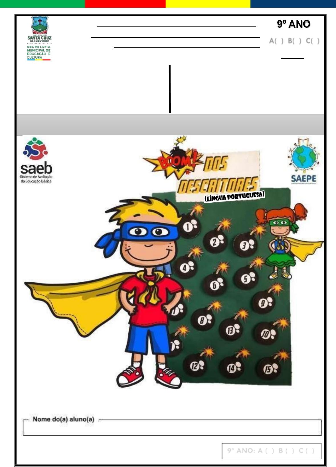ESCOLA: _ NOME: PROFESSOR: A( ) B( ) C( ) DATA: / /2024 9º ANO ENSINO FUNDAMENTAL CADERNO DE QUESTÕES LÍNGUA PORTUGUESA FOCO NO SAEPE 9º ANO: A ( ) B ( ) C ( ) D1 – Localizar informação explícita em um texto. D19 – Reconhecer o efeito de sentido decorrente da escolha de palavras, frases ou expressões. D2 - Inferir informação em texto verbal. D20 – Identificar o efeito de sentido decorrente do uso da pontuação e de outras notações. D3 – Inferir o sentido da palavra ou expressão. D21 – Reconhecer o efeito decorrente do emprego de recursos estilísticos e morfossintáticos. D4 – 4 Interpretar textos não verbais e textos que articulam elementos verbais e não verbais. D22 – Reconhecer efeitos de humor e i ronia D5 – Identificar o tema ou assunto de um texto. D23 – Identificar os níveis de linguagem e/ou as marcas linguísticas que evidenciam locutor e/ou interlocutor. D6 – Distinguir fato de opinião relativa ao fato. D7 – Diferenciar a informação principal das secundárias em um texto. D8 – D9 – Reconhecer gênero discursivo. D10 – Identificar o propósito comunicativo em diferentes gêneros. D11 – Reconhecer os elementos que compõem uma narrativa e o conflito gerador. D12 – Identificar semelhanças e/ou diferenças de ideias e opiniões na comparação entre textos. D13 – Reconhecer diferentes formas de tratar uma informação na comparação de textos de um mesmo tema. D14 – Reconhecer as relações entre partes de um texto, identificando os recursos coesivos que contribuem para sua continuidade. D15 – D16 - D17 – Reconhecer o sentido das relações lógico-discursivas marcadas por conjunções, advérbios etc. D18 – D1 – Localizar informação explícita. Questão 01 - (SEAPE). Leia o texto abaixo. O perfume A arte da perfumaria iniciou-se logo que o homem primitivo aprendeu a fazer o fogo e descobriu que certas plantas desprendiam fragrâncias agradáveis quando queimadas. O nome “perfume” deriva do latim per fumum ou pro fumum, que significa “através da fumaça”. Isso vem demonstrar a mais antiga aplicação da mistura de fragrâncias de plantas aromáticas, que eram utilizadas como oferendas. Durante séculos, centenas de culturas desenvolveram atos simbólicos e religiosos onde plantas raras e resinas aromáticas, queimadas nos altares dos templos, eram oferecidas como sacrifícios, em busca do favor dos deuses. Com este objetivo eram utilizados o sândalo, a casca de canela, as raízes de cálamo e vetiver, bem como substâncias resinosas como mirra, incenso, benjoim e cedro do Líbano. Poucas composições aromáticas da época foram transmitidas por escrito. Entretanto, uma está registrada no livro do Êxodo, capítulo 30. A composição utilizava quatro ingredientes naturais, muito empregados nos dias de hoje, mas de forma mais refinada: mirra, cássia, cortiça de árvore de canela e óleo de cálamo aromático. Disponível em: <http://migre.me/IPOeh>. Acesso em: 17 jun. 2011. De acordo com esse texto, o perfume surgiu a partir A) da descoberta do fogo. B) da narrativa bíblica. C) dos atos religiosos. D) dos ingredientes naturais. D2 - Inferir informação em texto verbal. Questão 02 - Leia o texto para responder a questão abaixo: Dois e Dois são Quatro Ferreira Gullar Como dois e dois são quatro Sei que a vida vale a pena Embora o pão seja caro E a liberdade pequena Como teus olhos são claros E a tua pele, morena como é azul o oceano E a lagoa, serena Como um tempo de alegria Por trás do terror me acena E a noite carrega o dia No seu colo de açucena — sei que dois e dois são quatro sei que a vida vale a pena mesmo que o pão seja caro e a liberdade pequena. Fonte: http://www.pensador.info/autor/Ferreira_Gullar/ A repetição da expressão “como dois e dois são quatro” no primeiro verso das estrofes 1 e 4 e no título do poema reforça a ideia de: A) certeza absoluta de que vale a pena viver. B) esperança frente às dificuldades da vida. C) facilidade para conseguir o pão de cada dia. D) certeza da necessidade de lutar pela liberdade D3 – Inferir o sentido da palavra ou expressão. Questão 03 - Leia o texto para responder a questão a seguir. Para causar o humor no texto, seu produtor se utiliza de um jogo de sentidos no uso da expressão “PETRÓLEO REFINADO”. Um dos sentidos possíveis para a palavra destacada é: A) estruturado. B) mal humorado. C) diversificado. D) bem educado. D4 – 4 Interpretar textos não verbais e textos que articulam elementos verbais e não verbais. Questão 04 – Observe as imagens a seguir para responder ao que se pede. http://migre.me/IPOeh%26gt%3B http://www.pensador.info/autor/Ferreira_Gullar/ Os textos acima são exemplos de linguagem a) verbal. b) não verbal. c) mista. d) formal. D5 – Identificar o tema ou assunto de um texto. Questão 05 - Leia o texto abaixo e responda à questão. CACHORROS Os zoólogos acreditam que o cachorro se originou de uma espécie de lobo que vivia na Ásia. Depois os cães se juntaram aos seres humanos e se espalharam por quase todo o mundo. Essa amizade começou há uns 12 mil anos, no tempo em que as pessoas precisavam caçar para se alimentar. Os cachorros perceberam que, se não atacassem os humanos, podiam ficar perto deles e comer a comida que sobrava. Já os homens descobriram que os cachorros podiam ajudar a caçar, a cuidar de rebanhos e a tomar conta da casa, além de serem ótimos companheiros. Um colaborava com o outro e a parceria deu certo. www.recreionline.com.br O assunto tratado nesse texto é a A) relação entre homens e cães. B) profissão de zoológico C) amizade entre os animais. D) alimentação dos cães. D6 – Distinguir fato de opinião relativa ao fato. Questão 06 – Leia e responda CIDADANIA, DIREITO DE TER DIREITOS Cidadania é o direito de ter uma ideia e poder expressá- la. É poder votar em quem quiser sem constrangimento. [...] Há detalhes que parecem insignificantes, mas re
