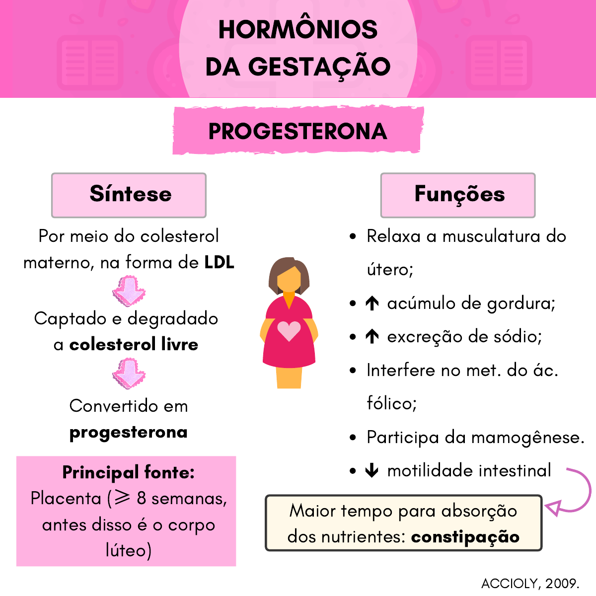 PROGESTERONA Síntese Funções Por meio do colesterol materno, na forma de LDL Captado e degradado a colesterol livre Convertido em progesterona Principal fonte: Placenta (≥ 8 semanas, antes disso é o corpo lúteo) Relaxa a musculatura do útero; acúmulo de gordura; excreção de sódio; Interfere no met. do ác. fólico; Participa da mamogênese. motilidade intestinal Maior tempo para absorção dos nutrientes: constipação HORMÔNIOS DA GESTAÇÃO ACCIOLY, 2009. elasticidade da parede uterina Principal fonte: Placenta (≥ 8 semanas, antes disso é o corpo lúteo) Participa da mamogênese; Afeta a função tireoidiana; Interfere no metabolismo do ác. fólico; Provoca retenção de sódio ( volume intravascular); Antagonista à nsulina ESTRÓGENO Principal função: Assim como a progesterona Além disso, ele: HORMÔNIOS DA GESTAÇÃO ACCIOLY, 2009. Complicações na gestação Normalmente: volume sanguíneo; prostaciclinas e tromboxanos; vasodilatação. HA Crônica - PA ≥ 140 x 90 (antes da gravidez ou até a 20ª sg*); Pré-eclâmpsia (PE) - PA ≥ 140 x 90 e proteinúria (300 mg/24h) após a 20ª sg*; Eclâmpsia - Convulsões em gestantes com quadro hipertensivo; HA Crônica com PE associada - A HA agrava-se e a proteinúria surge ou piora após a 20ª sg*; Síndrome de HELLP - Hemólise, alteração hepática e plaquetopenia. Algumas gestantes: prostaciclinas e tromboxanos; da PA, dano endotelial, etc. GESTAÇÃO ACCIOLY, 2009. Síndromes Hipertensivas da gravidez (SHG) Gestação Classificação da HA na gestação: SHG Podendo, então, ocorrer: *Sg = semana gestacional Complicações na gestação Aumento do volume plasmático (cerca de 50%). Hemodiluição (redução da concentração das hemácias). GESTAÇÃO ACCIOLY, 2009. Anemia gestacional Gestação Anemia fisiológica da gestação Ausência de anemia - ≥ 11 g/dL; Anemia leve a moderada - ≥ 8 g/dL e