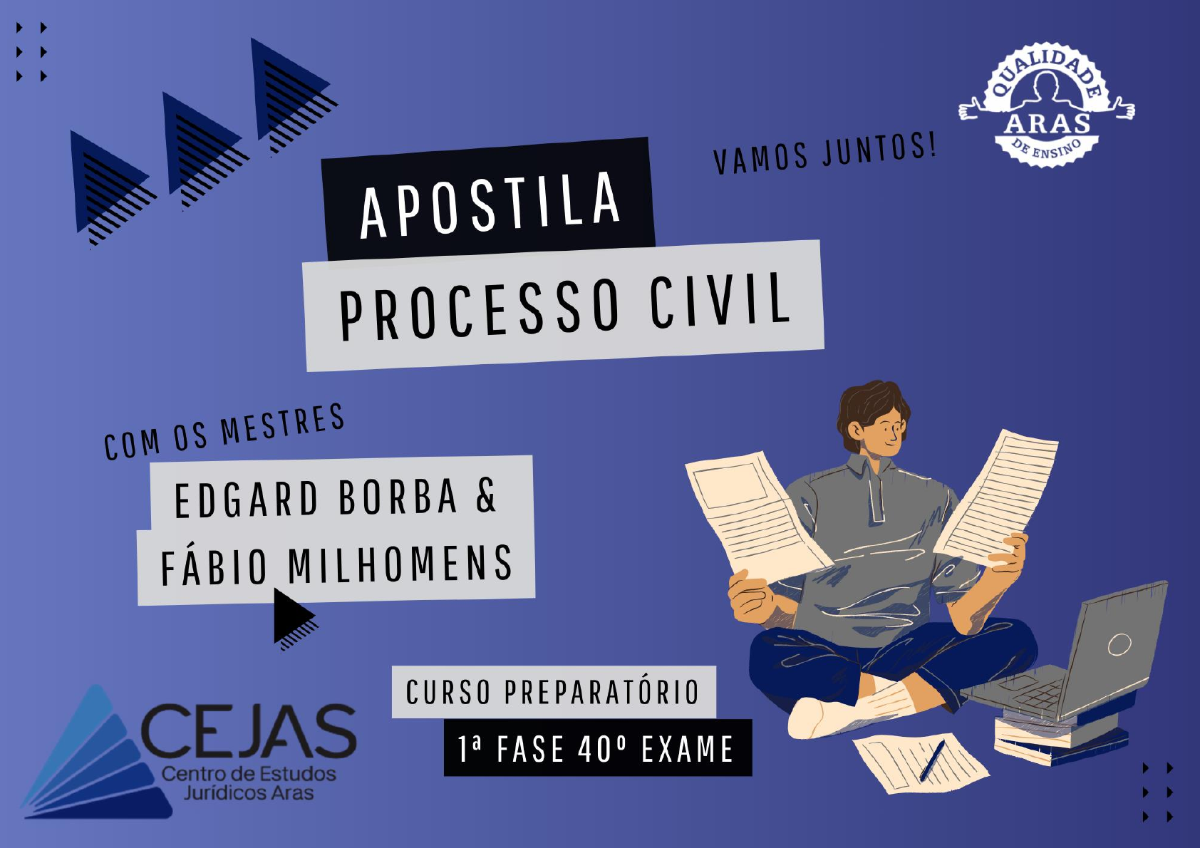 <p>Curso Preparatório para a 1ª Fase da OAB</p><p>Profs. Edgard Borba e Fábio Milhomens | Processo Civil</p><p>ANOTAÇÕES</p><p>2</p><p>_____________________________________________________________________________________</p><p>https://www.cejasonline.com.br/</p><p>SUMÁRIO</p><p>Capítulo 1. Normas Fundamentais do Processo Civil ................................................................... 3</p><p>Capítulo 2. Ação ............................................................................................................................. 9</p><p>Capítulo 3. Pressupostos Processuais ................................................................................................ 15</p><p>Capítulo 4. Competência ............................................................................................................... 16</p><p>Capítulo 5. Jurisdição ............................................................................................................................. 22</p><p>Capítulo 6. Litisconsórcio ............................................................................................................... 24</p><p>Capítulo 7. Intervenção de Terceiros ................................................................................................. 27</p><p>Capítulo 8. Juízo Arbitral ............................................................................................................... 32</p><p>Capítulo 9. Comunicação dos Atos Processuais .................................................................................. 35</p><p>Capítulo 10. Procedimento Comum ................................................................................................ 38</p><p>Capítulo 11. Julgamento Antecipado da Lide .................................................................................. 44</p><p>Capítulo 12. Organização e Saneamento do Processo .................................................................... 46</p><p>Capítulo 13. Audiência de Instrução ................................................................................................. 47</p><p>Capítulo 14. Sentença .............................................................................................................................. 49</p><p>Capítulo 15. Coisa Julgada ................................................................................................................ 54</p><p>Capítulo 16. Incidente de Resolução de Demandas Repetitivas (IRDR) ........................................ 55</p><p>Capítulo 17. Ação Rescisória ............................................................................................................... 56</p><p>Capítulo 18. Incidente de Assunção de Competência (IAC) ...................................................... 57</p><p>Capítulo 19. Tutelas Provisórias ............................................................................................................... 58</p><p>Capítulo 20. Recursos em Espécies ................................................................................................. 61</p><p>Capítulo 21. Execução .............................................................................................................................. 66</p><p>Capítulo 22. Das Provas .............................................................................................................................. 70</p><p>Capítulo 23. Execução de Alimentos .................................................................................................. 71</p><p>Capítulo 24. Ação Possessória ................................................................................................................ 73</p><p>Capítulo 25. Ação Monitória ................................................................................................................. 76</p><p>Curso Preparatório para a 1ª Fase da OAB</p><p>Profs. Edgard Borba e Fábio Milhomens | Processo Civil</p><p>ANOTAÇÕES</p><p>3</p><p>_____________________________________________________________________________________</p><p>https://www.cejasonline.com.br/</p><p>CAPÍTULO 1. NORMAS</p><p>FUNDAMENTAIS DO PROCESSO CIVIL.</p><p>Previstas, basicamente, do art. 1º ao 12, do CPC.</p><p> Art. 1º, CPC. O processo civil será ordenado, disciplinado e interpretado conforme os valores e as</p><p>normas fundamentais estabelecidos na Constituição da República Federativa do Brasil, observando-</p><p>se as disposições deste Código.</p><p>• Não basta ter um processo que realize o seu procedimento.</p><p>• O processo precisa estar conjugado ao viés constitucional.</p><p>• O CPC traz um elenco de princípios que irão colaborar com a visão prática do processo.</p><p>• O processo busca a pacificação social.</p><p>• Conjunto de princípios e regras que disciplinam o processo, conjugado com o viés constitucional.</p><p> Art. 2º, CPC. O processo começa por iniciativa da parte e se desenvolve por impulso oficial, salvo as</p><p>exceções previstas em lei.</p><p>• A jurisdição estatal é exercida pelo Poder Judiciário, composto pelos Juízes e Tribunais,</p><p>conhecendo e decidindo sobre os conflitos submetidos a si.</p><p>• A petição inicial está disciplinada no art. 319, do CPC.</p><p>• A partir do momento que a petição inicial é distribuída ou registrada, considera-se proposta a ação,</p><p>conforme o art. 312, do CPC.</p><p>Curso Preparatório para a 1ª Fase da OAB</p><p>Profs. Edgard Borba e Fábio Milhomens | Processo Civil</p><p>ANOTAÇÕES</p><p>4</p><p>_____________________________________________________________________________________</p><p>https://www.cejasonline.com.br/</p><p>• O réu precisa ser citado para ingressar no processo e</p><p>gerar seus efeitos, nos moldes do art. 240, do CPC, constituindo, assim, a estabilização subjetiva da</p><p>lide pela determinação dos suje