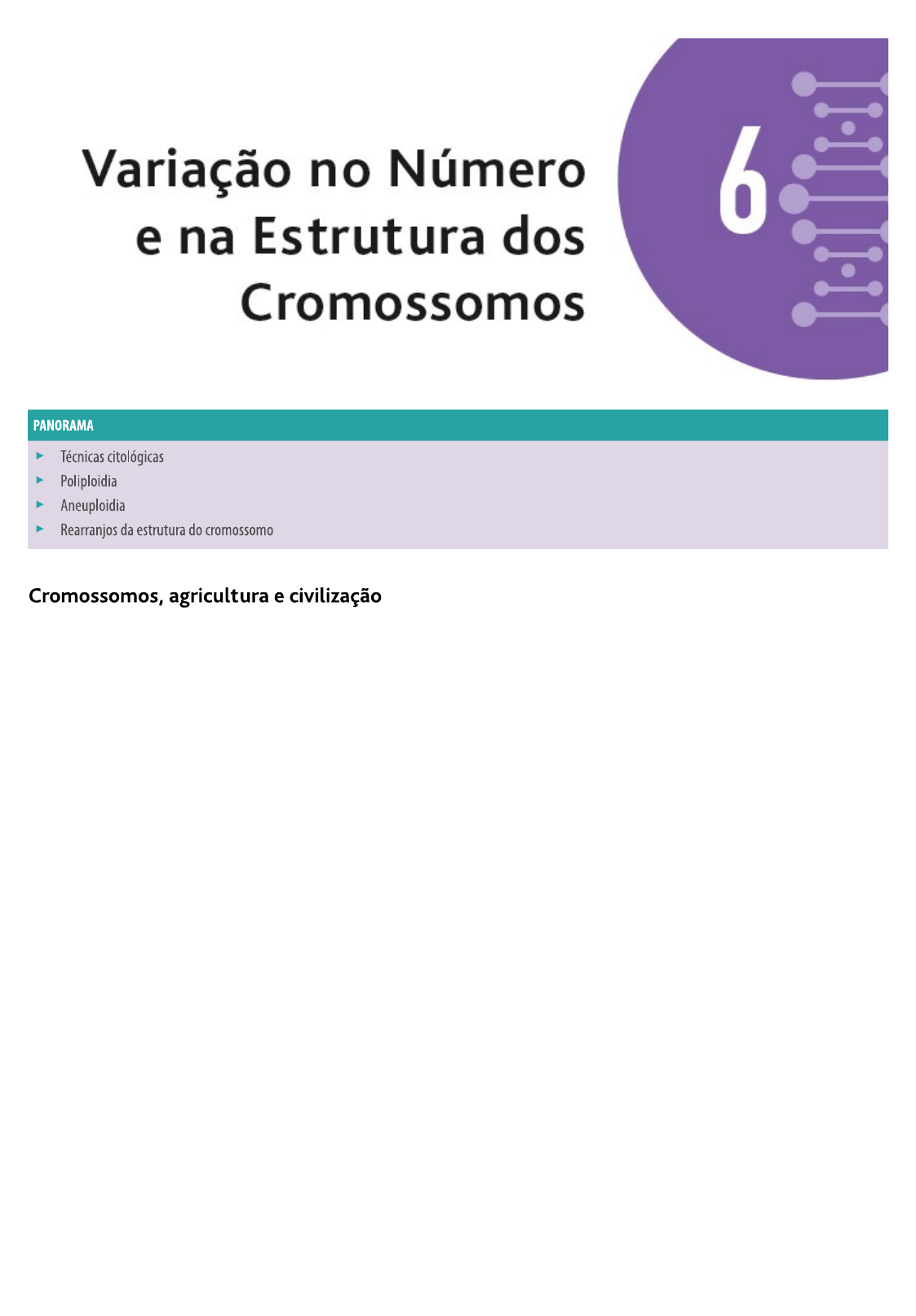 O cultivo de trigo surgiu há cerca de 10.000 anos no Oriente Médio. Hoje, o trigo é o principal produto agrícola para mais de um bilhão de pessoas. É cultivado em diversos ambientes, desde a Noruega até a Argentina. Desenvolveram-se mais de 17.000 variedades, cada uma delas adaptada a uma região diferente. A produção mundial de trigo é de 60 milhões de toneladas anuais, o que representa mais de 20% das calorias consumidas por toda a população humana. Sem dúvida, o trigo é um produto agrícola importante e, segundo alguns, um sustentáculo da civilização. O trigo cultivado atualmente, Triticum aestivum, é um híbrido de no mínimo três espécies diferentes. Originou-se de gramíneas de baixo rendimento que cresciam na Síria, no Irã, no Iraque e na Turquia. Aparentemente, algumas dessas gramíneas eram cultivadas por povos antigos dessas regiões. Embora não conheçamos o curso exato dos acontecimentos, parece ter havido um intercruzamento de duas dessas gramíneas, produzindo uma espécie que se destacou como planta de cultura. Graças ao cultivo humano, essa espécie híbrida passou por melhoramento seletivo e também foi intercruzada com uma terceira espécie, produzindo um híbrido triplo, ainda mais adequado para a agricultura. O trigo moderno é descendente dessas plantas híbridas triplas. O que tornou os trigos triplos-híbridos tão superiores a seus ancestrais? Eles tinham grãos maiores, cresciam em condições mais variadas e a colheita era mais fácil. Agora compreendemos a base cromossômica desses aperfeiçoamentos. O trigo triplo-híbrido contém os cromossomos de cada progenitor. Geneticamente, é uma fusão dos genomas de três espécies diferentes. Campo de trigo. Os geneticistas usam corantes para identificar cromossomos específicos e analisar suas estruturas. Os geneticistas estudam o número e a estrutura dos cromossomos por coloração das células em divisão com determinados corantes, seguida por exame microscópico. A análise de cromossomos corados é a principal atividade da especialidade chamada citogenética. A citogenética originou-se da pesquisa de vários biólogos europeus do século 20 que descobriram os cromossomos e observaram seu comportamento durante a mitose, a meiose e a fertilização. Essa pesquisa prosperou durante o século 20, com o surgimento de microscópios aperfeiçoados e de melhores procedimentos de preparo e coloração dos cromossomos. A demonstração de que os genes estão localizados nos cromossomos fomentou o interesse nessa pesquisa e levou a importantes estudos sobre o número e a estrutura dos cromossomos. Hoje, há aplicação de importantes conhecimentos citogenéticos, principalmente na medicina, em que são usados para identificar a associação entre doenças e anormalidades cromossômicas. Os pesquisadores empregam células em divisão, geralmente no meio da mitose, na maioria das análises citológicas. Para aumentar o número de células nesse estágio, costumavam usar material em crescimento, como embriões de animais e extremidades das raízes dos vegetais. O desenvolvimento de técnicas de cultura celular, porém, tornou possível estudar cromossomos em outros tipos de células (Figura 6.1). Por exemplo, leucócitos humanos podem ser coletados do sangue periférico, separados das hemácias – que não se dividem – e cultivados. Em seguida, estimula-se a divisão dos leucócitos por tratamento químico e, no meio da divisão, prepara-se uma amostra das células para análise citológica. O procedimento habitual é tratar as células em divisão com uma substância química que desative o fuso mitótico. Essa interferência captura os cromossomos em mitose, quando é mais fácil observá-los. As células cuja mitose foi interrompida são imersas em solução hipotônica, o que faz com que absorvam água por osmose e aumentem de volume. O conteúdo de cada célula é diluído pela água que entra, de maneira que os cromossomos se dispersam livremente quando elas são comprimidas sobre uma lâmina de microscópio. Essa técnica facilita muito a análise subsequente, sobretudo se houver grande número de cromossomos. Durante muitos anos acreditou-se erroneamente que as células humanas continham 48 cromossomos. O número correto, 46, só foi determinado depois do uso da técnica de aumento do volume celular para separar os cromossomos dentro de cada célula mitótica. Para mais detalhes, ver Marcos da genética | Tjio e Lenan contam corretamente os cromossomos humanos, disponível on-line. Até o fim da década de 1960 e o início da década de 1970, as dispersões cromossômicas geralmente eram coradas com reagente de Feulgen, corante roxo que reage com as moléculas de açúcar no DNA, ou com acetocarmim, um corante vermelho-escuro. Como esses tipos de corantes tingem uniformemente os cromossomos, é impossível para o pesquisador distinguir um cromossomo do outro, a menos que os cromossomos sejam muito diferentes em tamanho ou nas posições de seus centrômeros. Atualmente, os citogeneticistas usam corantes que fazem o tingimento diferencial dos cromossomos ao longo de seus comprimentos. A quinacrina, substância química semelhante ao antimalárico quinina, foi um dos primeiros reagentes com maior capacidade de discriminação. Os cromossomos corados com quinacrina têm um padrão característico de faixas brilhantes sobre fundo escuro. No entanto, como a quinacrina é uma substância fluorescente, as faixas só aparecem quando os cromossomos são expostos à luz ultravioleta (UV). A irradiação ultravioleta faz com que algumas das moléculas de quinacrina inseridas no cromossomo emitam energia. Partes do cromossomo emitem brilho intenso, enquanto outras continuam escuras. Esse padrão de faixas brilhantes e escuras é altamente reproduzível e também é específico de cada cromossomo (Figura 6.2). Desse modo, com o bandeamento com quinacrina, os citogeneticistas são capazes de identifica