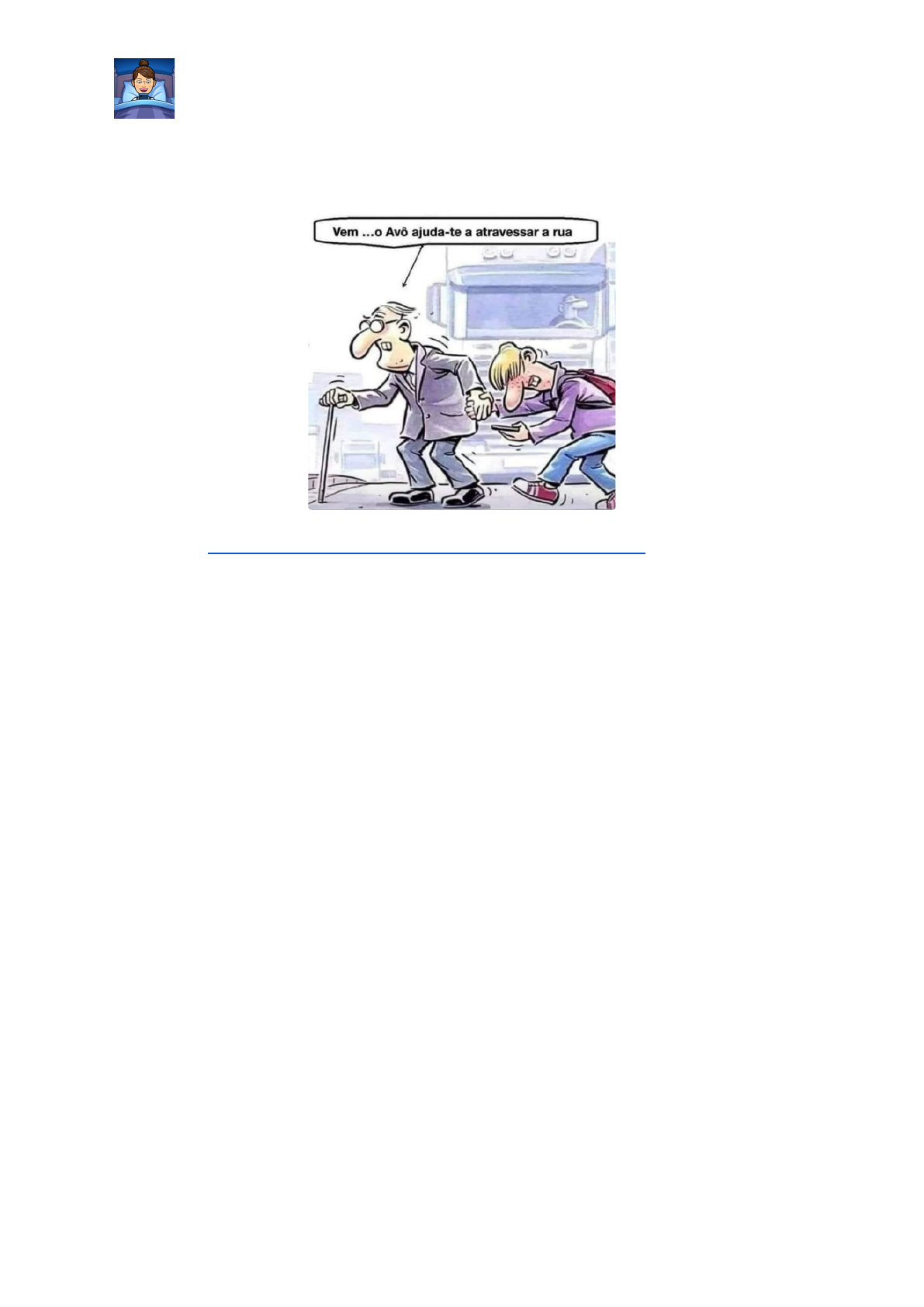 Us� d� celula� Elaboração das atividades: Giovana B F Picolo Insta:@ana.voig.1 TEXTO 1 Disponível em: https://www.threads.net/@antonio_de_carvalho_58/post/DA3LGojood4 acesso em 08-10-2024. 1. O que a frase “vem... o avô ajuda-te a atravessar a rua” sugere sobre o relacionamento entre o avô e o neto? Comente. 2. Como a presença do celular na mão do neto influencia o significado da charge? Qual é o possível impacto desse detalhe no contexto da cena? Levante ao menos 3 hipóteses. 3. A frase dita pelo avô é tradicionalmente associada a um contexto em que a criança é quem precisa de ajuda. Como essa inversão de papéis, com o avô ajudando o neto distraído, altera a mensagem? 4. Em sua opinião, o que a charge está criticando ou ironizando sobre o comportamento dos jovens? Justifique sua resposta com elementos visuais e textuais. 5. Que aspectos da relação entre gerações são sugeridos pela imagem do avô e do neto e quais valores ou críticas podem ser inferidos a partir dessa representação? 6. Como a charge dialoga com a realidade atual do uso excessivo de celulares por jovens? a- Esse uso afeta a percepção de segurança e atenção ao ambiente? Explique. 7. A charge provoca uma reflexão sobre quem realmente precisa de ajuda no momento. Como essa ideia se conecta ao papel das gerações mais velhas na sociedade moderna? Argumente. https://www.threads.net/@antonio_de_carvalho_58/post/DA3LGojood4 Us� d� celula� 8. Qual seria uma possível interpretação da escolha do avô como símbolo de sabedoria e experiência e como isso se contrapõe à imagem do neto distraído com o celular? 9. Você acredita que a mensagem da charge pode ser aplicada a outros contextos além de atravessar a rua? Em caso afirmativo, quais seriam esses contextos? 10. Observe a colocação pronominal da charge. Ela está de acordo com a norma padrão? Justifique. 11. Crie uma legenda alternativa para essa charge que mantenha o humor ou a crítica presente, mas altere a situação retratada. Como essa mudança impacta o sentido da charge? TEXTO 2 1. O que a imagem de Chapeuzinho Vermelho e Lobo Mau, ambos distraídos com seus celulares, sugere sobre as interações sociais nos dias de hoje? Explique. 2. Na versão tradicional do conto, Chapeuzinho Vermelho deveria ter medo do Lobo Mau. O que o fato de ambos estarem distraídos com seus celulares indica a respeito dessa relação na imagem? Comente. 3. A distração com os celulares impede que Chapeuzinho e o Lobo Mau percebam um ao outro. Como isso altera a tensão que normalmente existe na história original? Argumente. 4. Quais elementos da imagem ajudam a construir a crítica ao uso excessivo da tecnologia? Cite ao menos dois detalhes visuais e explique seu significado. Us� d� celula� 5. Qual seria a consequência se Chapeuzinho Vermelho e o Lobo Mau tivessem notado um ao outro, em vez de estarem focados nos celulares? Descreva a cena. 6. A imagem provoca uma reflexão sobre como a tecnologia afeta nossa atenção ao mundo ao redor. Como você acha que o uso do celular está impactando as interações humanas no cotidiano? Dê exemplos. 7. Em sua opinião, o que essa imagem pode estar criticando a respeito das mudanças de comportamento causadas pelos dispositivos móveis? Você acha que isso reflete uma realidade comum? Em caso afirmativo, qual? 8. Considerando a imagem e a ideia de distração tecnológica, quais outros contos clássicos poderiam ser repensados sob a mesma ótica? Escolha um conto e explique como ele poderia ser reinterpretado. (pode ser através de desenho) 9. O que a ausência de perigo ou tensão entre Chapeuzinho Vermelho e o Lobo Mau sugere sobre o papel da tecnologia nas relações humanas? O uso dos celulares muda o contexto de predador e presa? 10. Crie um novo final para a história de Chapeuzinho Vermelho, levando em consideração o fato de que ela e o Lobo Mau estão distraídos com seus celulares e não se veem. Como seria esse final alternativo? 11. Imagine que Chapeuzinho Vermelho e o Lobo Mau tivessem redes sociais. Que tipo de conteúdo você acha que cada um postaria? Como suas personalidades seriam refletidas em suas publicações? 12. Faça um balão de fala para cada personagem da charge. 13. Em seu ponto de vista, os clássicos da literatura infantil mudariam em tempo de tecnologia? Vamos dar asas à imaginação e escrever um deles?