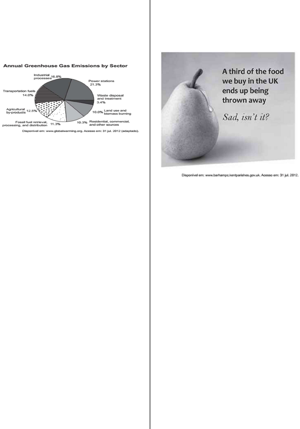 SIMULADO ENEM 1° DIA LINGUAGENS, CÓDIGOS E SUAS TECNOLOGIAS 1) A emissão de gases tóxicos na atmosfera traz diversas consequências para nosso planeta. De acordo com o gráfico, retirado do texto Global warming is an international issue, observa-se que: A. as queimadas poluem um pouco mais do que os combustíveis usados nos meios de transporte. B. as residências e comércios são os menores emissores de gases de efeito estufa na atmosfera. C. o processo de tratamento de água contribui para a emissão de gases poluentes no planeta. D. os combustíveis utilizados nos meios de transportes poluem mais do que as indústrias. E. os maiores emissores de gases de efeito estufa na atmosfera são as usinas elétricas. 2) 36 hours in Buenos Aires Contemporary Argentine history is a roller coaster of financial booms and cracks, set to gripping political soap operas. But through all the highs and lows, one thing has remained constant: Buenos Aires’s graceful elegance and cosmopolitan cool. This attractive city continues to draw food lovers, design buffs and party people with its riotous night life, fashion-forward styling and a favorable exchange rate. Even with the uncertain economy, the creative energy and enterprising spirit of Porteños, as residents are called, prevail — just look to the growing ranks of art spaces, boutiques, restaurants and hotel. SINGER, P. Disponível em: www.nytimes.com. Acesso em: 30 jul. 2012. Nesse artigo de jornal, Buenos Aires é apresentada como a capital argentina, que: A. foi objeto de novelas televisivas baseadas em sua vida noturna e artística. B. manteve sua elegância e espírito cosmopolita, apesar das crises econômicas. C. teve sua energia e aspecto empreendedor ofuscados pela incerteza da economia. D. foi marcada historicamente por uma vida financeira estável, com repercussão na arte. E. parou de atrair apreciadores da gastronomia, devido ao alto valor de sua moeda. 3) Uma campanha pode ter por objetivo conscientizar a população sobre determinada questão social. Na campanha realizada no Reino Unido, a frase “A third of the food we buy in the UK ends up being thrown away" foi utilizada para enfatizar o(a): A. desigualdade social. B. escassez de plantações. C. reeducação alimentar. D. desperdício de comida. E. custo dos alimentos. 4) Hunger Games Review: Family Film Guide Parent Concerns: There is definitely violence in this film. The central Hunger Games may not be as bloody and brutal as author Suzanne Collins describes in the novel, but there’s a visceral reaction to seeing the kid-on-kid violence ratherthanconjuring it inyourown imagination. The tributes kill each other in a host of ways, from spear, knife and arrow wounds to hand-to-hand battles that leave teens with their heads smashed in or necks snapped. The editing is quick and the shots never linger on anything overly graphic, but there is blood and twenty-two adolescents, aged 12-18, die in the annual blood sport pageant. Immature teens, even if they’ve read the books, may not be ready to handle to the film just yet. A good rule of thumb: if they’re not old enough to be reaped into the Hunger Games, theyYe probably not mature enough to see it. ANGULO-CHEN, S. Disponível em: http://news.moviefone.com. Acesso em: 28jun. 2012. Produções literárias e cinematográficas estão, muitas vezes, articuladas. No caso do filme Hunger Games, a autora da resenha chama a atenção para a questão da violência, que é mais: A. detalhada do que a autora do livro gostaria que fosse. B. brutal do que os pais permitiriam para seus filhos. C. amena do que os adolescentes imaginavam. D. superficial do que o público poderia esperar. E. impactante do que a representada no livro. 5) On the Meaning of Being Chinese Ethnically speaking, I feel I am complicated to classify, but who isn’t, right? To me, being Chinese-Brazilian in America means a history of living in three opposite cultures, and sometimes feeling that I did not belong in neither, a constant struggle that immigrants, and national citizens, face when their appearance is foreign to natives in the country. Jokingly, I say that I am Asian in America, Brazilian in China, and a “gringa” in Brazil. Nevertheless, 1 believe that dealing with these hard to reconcile extremes have somehow helped me to become more comfortable with my identity. BELEZA LI. Disponível em: www.aiisf.org. Acesso em: 28 mar. 2014. Nesse fragmento, Beleza Li resume sua experiência de vida ao descrever a complexidade em: A. viver como imigrante em um país asiático. B. definir quem ela é no que concerne à etnia. C. compreender as culturas que a constituem. D. lidar com brincadeiras sobre sua aparência. E. lutar contra a discriminação nos Estados Unidos. 6) OLHOS DE RESSACA "Enfim, chegou a hora da encomendação e da partida. Sancha quis despedir-se do marido, e o desespero daquele lance consternou a todos. Muitos homens choravam também, as mulheres todas. Só Capitu, amparando a viúva, parecia vencer-se a si mesma. Consolava a outra, queria arrancá-la dali. A confusão era geral. No meio dela, Capitu olhou alguns instantes para o cadáver tão fixa, tão apaixonadamente fixa, que não admira lhe saltassem algumas lágrimas poucas e caladas... As minhas cessaram logo. Fiquei a ver as dela; Capitu enxugou-as depressa, olhando a furto para a gente que estava na sala. Redobrou de carícias para a amiga, e quis levá-la; mas o cadáver parece que a retinha também. Momentos houve que os olhos de Capitu fitaram o defunto, quais os da viúva, sem o pranto nem palavras desta, mas grandes e abertos, como a vaga do mar lá fora, como se quisesse tragar também o nadador da manhã." (Machado de Assis) "Capitu parece vencer-se a si mesma" A SI MESMA é redundância da palavra SE - figura a que chamamos: A. metáfora B. anacoluto C. pleonasmo D. silepse E. hipérbato 7) Leia o trecho a seguir: 4 Graus Céu de vidro azul fumaça Quatro Graus de latitude Rua est