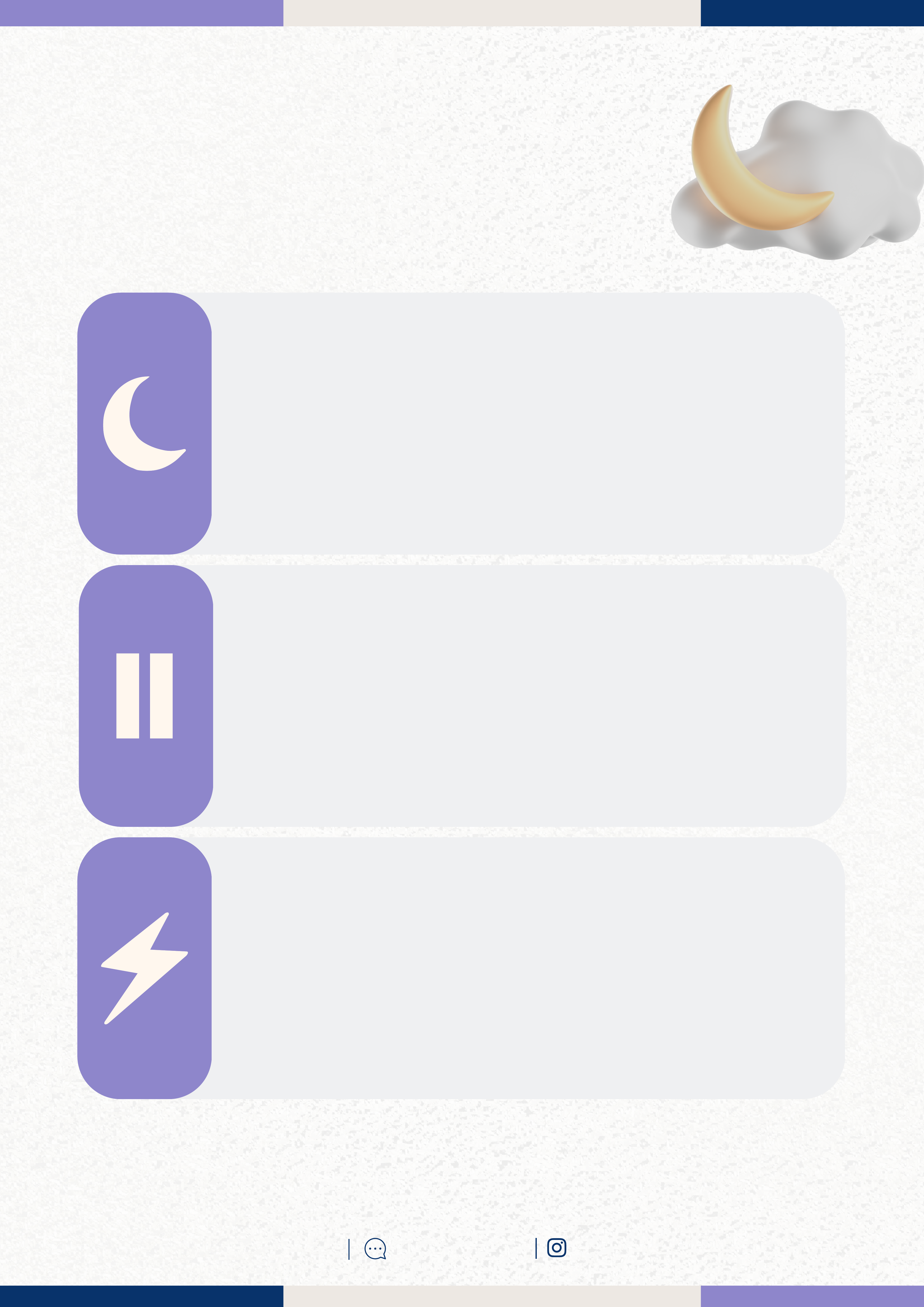 os 3 PRINCIPAIS transtornos DO SONO Praticar exercícios regularmente melhora a qualidade do sono. No entanto, evite exercícios vigorosos antes de dormir, pois isso pode dificultar o relaxamento. Os exercícios aumentam a duração e a profundidade do sono e podem reduzir a insônia e outros distúrbios. INSÔNIA É caracterizada por interrupções da respiração durante o sono. O indivíduo pode ter sua respiração suspensa por até 10 segundos, o que pode afetar a qualidade do sono. Geralmente causada por obstrução das vias aéreas, excesso de peso ou estrutura da face. APNÉIA DO SONO Caracteriza-se por sonolência excessiva durante o dia combinada com franqueza muscular repentina, que pode ser provocada por forte emoção ou surpresa. As pessoas com narcolepsia podem ter dificuldade para manter o sono durante o dia e podem cair no sono de repente. NARCOLEPSIA (88) 99415 - 4163Daniele Pereira danielepereira.psic
