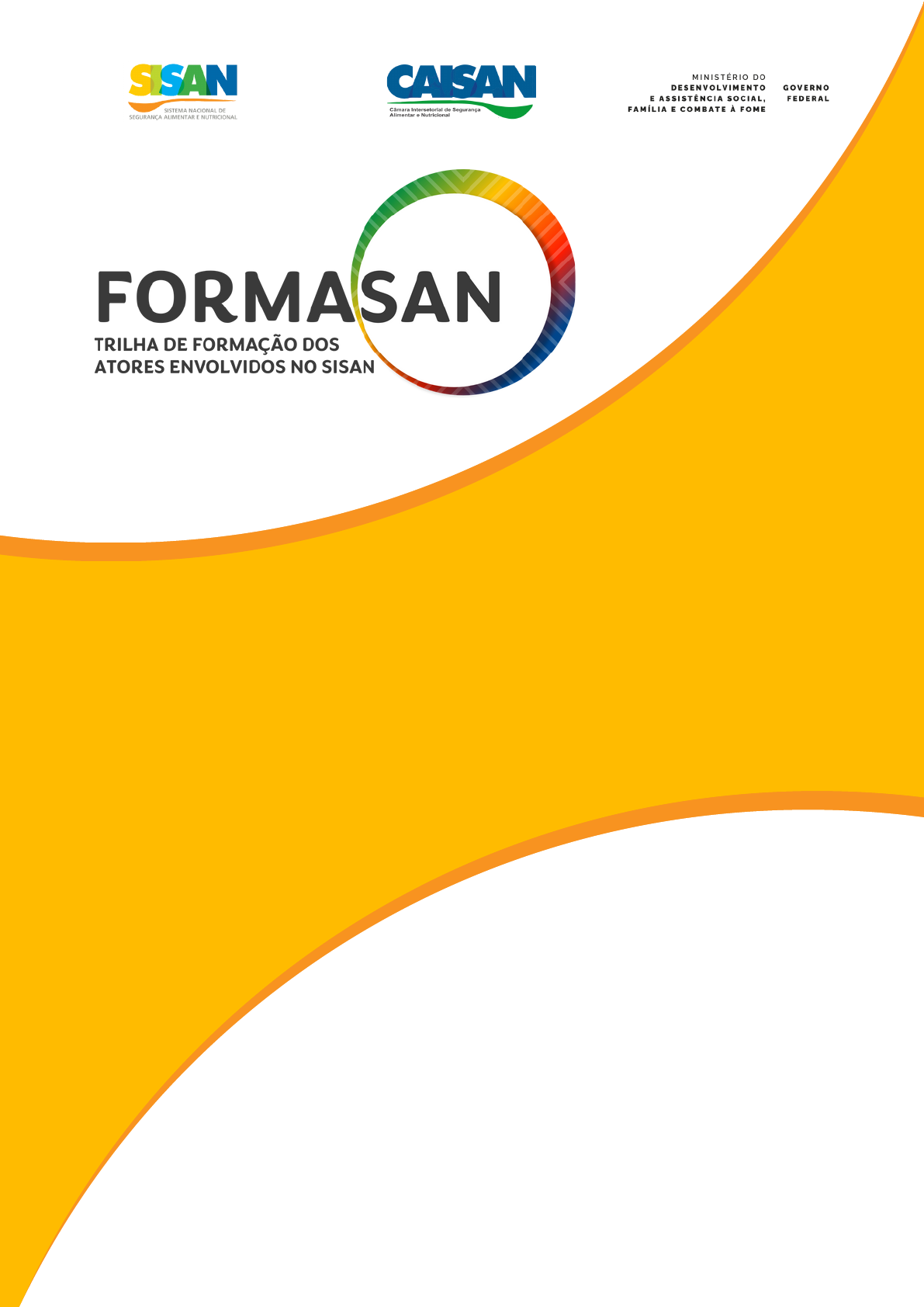 CURSO O SISAN e a PNSAN: aspectos introdutórios MANUAL DO CURSO C UR SO O SISAN e a PNSAN: aspectos introdutórios Valéria Burity (Secretária Extraordinária de Combate à Pobreza e à Fome) | Rafael Arantes (Assessor) | Vanessa Manfre (Assessora) Luiza Trabuco (Coordenadora Geral de Apoio à Gestão do SISAN) | Renata Bravin (Coordenadora) | Caroline Moreira (Assessora) Ísis Leite (Coordenadora Geral de Articulação Federativa do SISAN) | Élcio Magalhães (Coordenador) | Laura Sollero (Assessora) | Lorrayne Tavares (Assessora) | Alexandre Valadares (Coordenador Geral de Vigilância do SISAN) | Marcelo Galiza (Coordenador) | Bárbara Viana (Apoio) | Ronalda Oliveira (Apoio) | Luciana Cardoso (Apoio) | Liana Alves (Apoio) | Audrei Soares (Apoio) | Ivanete Oliveira (Apoio) | Felipe Mendes (Apoio) REALIZAÇÃO PRODUÇÃO MINISTÉRIO DO DESENVOVIMENTO E ASSISTÊNCIA SOCIAL, FAMÍLIA E COMBATE À FOME - MDS SECRETARIA EXTRAORDINÁRIA DE COMBATE À POBREZA E À FOME – SECF Cristine Garcia Gabriel (Coordenadora Geral) | Maria Cristina Marcon (Coordenadora Geral) | Patrícia Maria de Oliveira Machado (Coordenadora Acadêmica do Curso) | Claudia Soar (Coordenadora Acadêmica) | Débora Kurrle Rieger Venske (Coordenadora Acadêmica) | Mick Lennon Machado (Coordenador Operacional do Curso) | Milena Corrêa Martins (Coordenadora Operacional do Curso) | Murilo Lyra Pinto (Coordenador Operacional do Curso) | Barbara Leone Silva (Coordenadora Operacional do Curso) | Maria Eduarda Z. Camargo (Equipe Operacional) | Mariana Winck Spanholi (Equipe Operacional) | Arthur Krieck Medeiros (Equipe Operacional) | Felipe Bruno Lupi Vergara (Equipe Operacional) | Giovana Felicio Lima (Equipe Operacional) | Victoria de Oliveira (Equipe Operacional) | Ana Beatriz Wolff Machado (Equipe Operacional) Conteúdo, Roteiro, Narração e Edição de Áudio: Milena Corrêa Martins | Mick Lennon Machado Diagramação e Edição de Vídeo: Giovana Felicio Lima | Maria Eduarda Z. Camargo | Mick Lennon Machado Materiais de Apoio: Maria Eduarda Camargo | Ana Beatriz Wolff Machado | Milena Corrêa Martins Revisão: Ísis Leite | Élcio Magalhães | Laura Sollero | Lorrayne Tavares Bancos de imagens utilizados: Canva, Storyset, Flaticon (Todas as imagens possuem licença gratuita de uso) UNIVERSIDADE FEDERAL DE SANTA CATARINA - UFSC TEIA DE ARTICULAÇÃO PELO FORTALECIMENTO DA SEGURANÇA ALIMENTAR E NUTRICIONAL - TEARSAN SUMÁRIO Apresentação................................................3 Informações gerais...................................4 Conteúdo programático.......................5 Como acessar os materiais?..............7 Conheça os outros cursos da Trilha de Formação!...............................................13 Estrutura do curso....................................................5 Como avançar nos estudos?...........................7 O que vou aprender?.............................................6 Como fazer as atividades avaliativas?.....9 Como emitir meu certificado?.......................12 Bem vindos e bem vindas ao curso “O SISAN e a PNSAN: aspectos introdutórios”! Este é um dos cursos da “FormaSAN: trilha de formação dos atores envolvidos no SISAN”, que foi elaborada para atender as demandas de formação e capacitação dos gestores, lideranças da sociedade civil e dos demais atores envolvidos com o Sistema Nacional de Segurança Alimentar e Nutricional. Portanto, como uma trilha de formação que aborda os diferentes temas relacionados ao SISAN e à PNSAN através de diferentes cursos de aprendizagem, cada curso pode ser realizado de acordo com o interesse e a necessidade de cada ator do Sistema. Os cursos dessa trilha são ofertados pelo Ministério do Desenvolvimento e Assistência Social, Família e Combate à Fome (MDS), com o objetivo de capacitar os atores governamentais e da sociedade civil para atuarem de forma efetiva na consolidação do SISAN, visando a consequente efetivação do Sistema nos municípios e estados brasileiros. Para isso, o curso conta com um conteúdo abrangente e com ferramentas de aprendizagem cuidadosamente elaboradas, que buscam integrar conceitos e normativas com os conhecimentos práticos necessários para a governança e implementação das estratégias públicas de segurança alimentar e nutricional nos diversos territórios. Este curso iniciado por você, denominado “O SISAN e a PNSAN: aspectos introdutórios” foi desenvolvido para abordar os aspectos introdutórios em relação ao Sistema e à Política Nacional de Segurança Alimentar e Nutricional, e possui uma carga horária de 20 horas. Todos os cursos da Trilha de formação são ofertados no formato autoinstrucional, permitindo que o ritmo e a velocidade da aprendizagem possam se adequar às diferentes rotinas vivenciadas pelos atores do SISAN. Todas as etapas dessa trilha foram desenvolvidas, com muito carinho, através de uma parceria entre o MDS e a Teia de Articulação pelo Fortalecimento da Segurança Alimentar e Nutricional da Universidade Federal de Santa Catarina (TearSAN/UFSC). Juntos, esperamos que você aproveite cada passo e cada conteúdo. E ao final de cada curso, esperamos que você se sinta mais capacitado para continuar atuando e contribuindo com a implementação do SISAN no seu território, no seu município ou no seu estado. Então, aproveite este manual para ver mais informações sobre o curso e encontrar orientações em relação ao seu conteúdo programático, à forma de acesso aos materiais disponibilizados e à realização das atividades avaliativas. Guarde esse manual com você, para acessar sempre que sentir necessidade. E depois, siga para a primeira aula do curso! Desejamos uma ótima formação e contamos com você para um SISAN mais forte! 3 APRESENTAÇÃO INFORMAÇÕES GERAIS Contexto: FormaSAN: trilha de formação dos atores envolvidos no SISAN Título do curso: O SISAN e a PNSAN: aspectos introdutórios Objetivo geral: Introduzir os aspecto