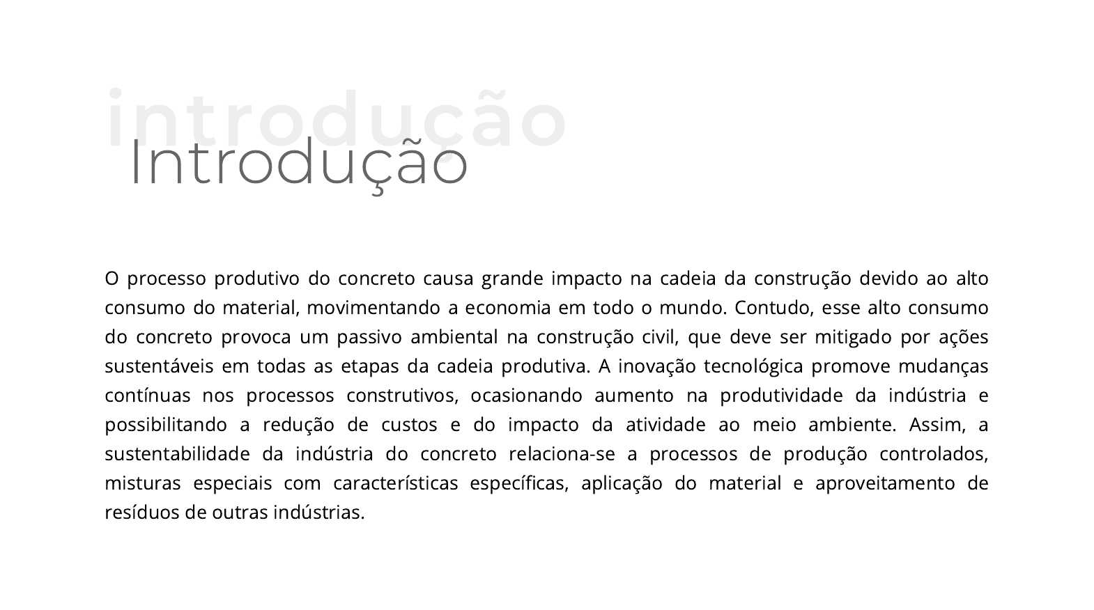introdução Introdução O processo produtivo do concreto causa grande impacto na cadeia da construção devido ao alto consumo do material, movimentando a economia em todo o mundo. Contudo, esse alto consumo do concreto provoca um passivo ambiental na construção civil, que deve ser mitigado por ações sustentáveis em todas as etapas da cadeia produtiva. A inovação tecnológica promove mudanças contínuas nos processos construtivos, ocasionando aumento na produtividade da indústria e possibilitando a redução de custos e do impacto da atividade ao meio ambiente. Assim, a sustentabilidade da indústria do concreto relaciona-se a processos de produção controlados, misturas especiais com características especí�cas, aplicação do material e aproveitamento de resíduos de outras indústrias.