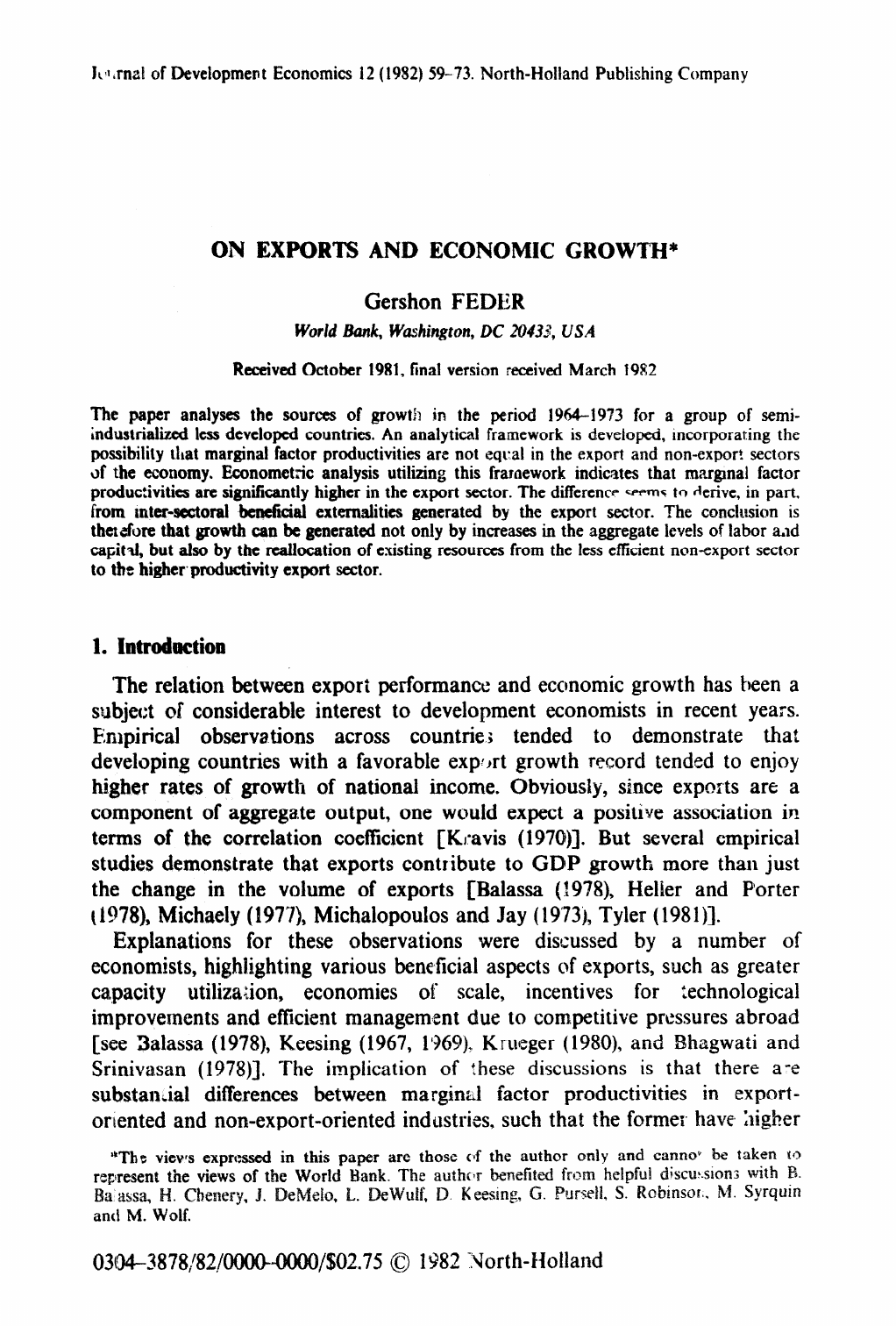 JtllLrnal of Development Economics f 2 (1982) 59-73. North-Holland Publishing Company ON EXPORTS AND ECONOMIC GROWTH* Gershon FEDER World Bank, Washington, DC 20433, USA Received October 1981, final version received March 1982 The popper analyses the sources of growth in the period 1964-1973 for a group of semi- industrialized less developed countries. An analytical framework is developed, incorporating the possibility that marginal factor productivities are not equal in the export and non-export sectors df the economy. Econometric analysis utilizing this framework indicates that margmal factor productivities are significantly higher in the export sector. The difference -VI, Michalopoulos and Jay ( 19’73), Tyler ( 198 I)]. Explanations for these observations were discussed by a number of economists, highlighting various beneficial aspects of exports, such as greater ca‘pacity utilizaiion, economies of scale, incentives for technological improvements and effkient management due to competitive pressures abroad [see 3alassa (19’78), Meesing (1967, 1’269) Krueger ( 1980), and Bhagwati and Sriniva.san ( 1978)]. The implication of ese discussions is that there a-e substaCa1 differences between margin&l factor productivities in export- orlented and non-export-oriented industries, such that the former, have Sgher “The views expred in this pa r are those cd the author only and cannor be taken 10 represent the views of the World Bank. The authclr e&d from helpful discu:.sion3 with R. Sk?, Keesing, 6. Bcmell. S. Robinsor.. M. Syrquin and M. Wolf. 03(~3878:82/~~/$02.75 0 1382 Xorth-Holland ADEILSON Highlight factor productivity, It fallows, then, that counuties which have adopted policies less biased against exports benefited from closer&-optimal resource I” allocation and higher growth, The present paper develops an anrilytical framework for tbe quantitative assessment of f&or productivity di@ere&ls Uxtqween expc>rts and non- expo~s using ~~~~~~~ ,‘Pd”, ,:“cfii~’ ~f~~~~~i i$ aii[$& i$’ in ern~iirical study of so~rrzes of growth in a sample of, Islemi-industrialized less developed countries within the decade S@Pi9?3. The ‘analysis allows gm estimate of the sectoral bargina productivities. FurthermoreY the extent of inter-sectoral beneficial exteqnalities generated by exports can be specifically ideniitied. The results highlight the role of eliport performahce in explaining the groT#th record of the sample counties. m a-nalytis in this paper adope a sup& side description of changes in aggregate ou:put. In SO doing it follows a practice widely used h the empirical study of sources of growth [see, e.g., Hagen and I-Iawrylyshyn (;t969) and Robinson (197 l)]. Within such a framework, where aggregate growth is ;related to changes in capital and labor through an underlying production function, the ‘.’ stub:es of Balassa (197P), Chenery et al. (1970), Michalopoulos and Jay (1973) and Tyler (1981) havl? included an indicator of export performance among the variabies explaining growth.” In the following, a framework is developed which provides a formal rationalization for t5e incorporation of export varizlzles in the sources of growth equation. Fptihenno& starting from the sectoral production functions, a proper smcatioti of export v&iables is indicated and a non-conventional intizrpretation of parameters is implied. Since the present analysis focuses on the potential non-optimaiity of resource allocation between export and non-export sectors, the economy is Gtwe(‘t as if it cclnsists of two ‘distil- ct sectors: one producing export goods, he other producing for the &. lnestlc market.2 Instead of an aggregate al productioln function, eacl. J 1 the tvro sectors” output is a function Qf the falztors alloca@:d to the sector, En addition, the output of the non-export sector is dependent OTI Ilhe volume of exports produced. This formulatisn represents the beneficial effects of exports 011 other sectors [Keesing (1967, p. 511, 14’79, pp. 4, !5)& such as the development of eflicient and internationally rqresent exports pzformarrce by export g”cr\wth multiplied by export share; e expsrts _growtIiL, n s.bstraction, as many firms are pxxlucing for both domestic and external argued that even then, the domestically marketed output su& firms is e a’ame fact:tc*r prQd~~~ti~~ti~s which characterize exports. wever, to the exports represents a good approximation of the changes in the \ olume of ~~~~~~~t~~~ of such firms, the results are stilt valid. ADEILSON Highlight ADEILSON Highlight compe; itive mana lent, the introduction of improved production her quality labr, steadier flow of imported inputs, r-red to tos externalities, since they aire not reflected irr are incorporated n the formulation below: N = F(K,, L,, X), (1) X = G(K., Lx), where (21 N = non-exports, X = exports, K,, K, = respective sector caprtal stocks, L Lx = respective sector labor forces. Since data regarding sectcsal allocations of primaisy production factors are no! readily available, a speScation is required which will allow estimates of sectoral marginal productivities using aggregate (national) data. This is accomplished as follows:. Suppose that the ratio of respective marginal factor productivities in the two sectors deviates from unity by a factor 6, i.e., (G,/Fk)=(G,/FL)= I+& 13 where the subscripts denote partial derivati v es. In the absence of exiernalities, and for a given set of prices, a situation where 6 =O would reflect an allocation of resources which maximizes national output. However, due to a number of reasons, marginal factor produe&ities are likely to be lower in the non-export sector (i.e., 6 ~0). One important reason is the more competitive environment in which export- oriented firms operate. Competition induces innovativeness, adaptabilny, efficient management of firms‘ resources, etc. Another reason for deviations between sectoral margi ctor productivities are various regulations and co