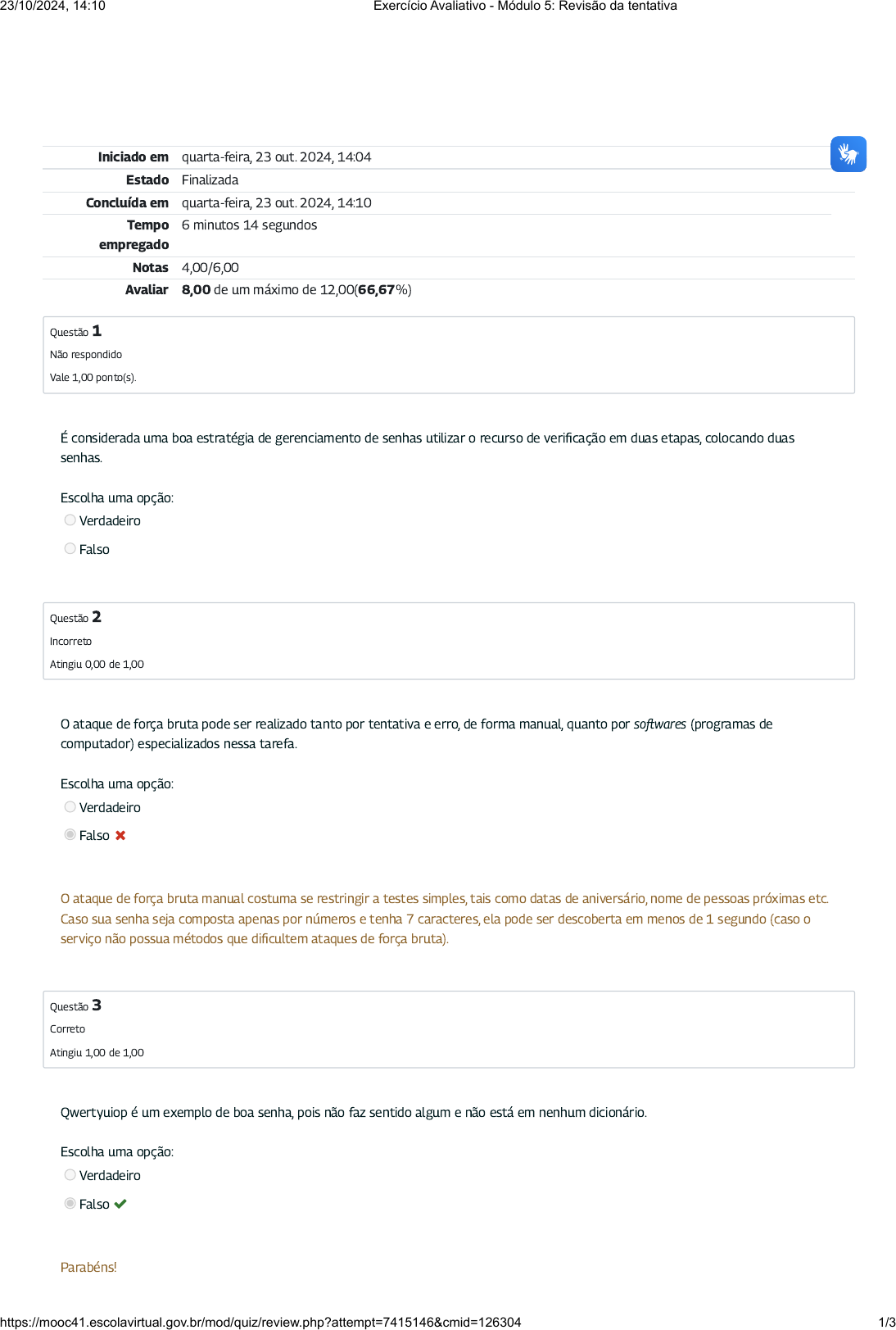 Iniciado em quarta-feira, 23 out. 2024, 14:04 Estado Finalizada Concluída em quarta-feira, 23 out. 2024, 14:10 Tempo empregado 6 minutos 14 segundos Notas 4,00/6,00 Avaliar 8,00 de um máximo de 12,00(66,67%) Questão 1 Não respondido Vale 1,00 ponto(s). Questão 2 Incorreto Atingiu 0,00 de 1,00 Questão 3 Correto Atingiu 1,00 de 1,00 É considerada uma boa estratégia de gerenciamento de senhas utilizar o recurso de veri�cação em duas etapas, colocando duas senhas. Escolha uma opção: Verdadeiro Falso O ataque de força bruta pode ser realizado tanto por tentativa e erro, de forma manual, quanto por so�wares (programas de computador) especializados nessa tarefa. Escolha uma opção: Verdadeiro Falso O ataque de força bruta manual costuma se restringir a testes simples, tais como datas de aniversário, nome de pessoas próximas etc. Caso sua senha seja composta apenas por números e tenha 7 caracteres, ela pode ser descoberta em menos de 1 segundo (caso o serviço não possua métodos que di�cultem ataques de força bruta). Qwertyuiop é um exemplo de boa senha, pois não faz sentido algum e não está em nenhum dicionário. Escolha uma opção: Verdadeiro Falso Parabéns! 23/10/2024, 14:10 Exercício Avaliativo - Módulo 5: Revisão da tentativa https://mooc41.escolavirtual.gov.br/mod/quiz/review.php?attempt=7415146&cmid=126304 1/3 Questão 4 Correto Atingiu 1,00 de 1,00 Questão 5 Correto Atingiu 1,00 de 1,00 Questão 6 Correto Atingiu 1,00 de 1,00 Não é recomendado utilizar na sua senha nomes de pessoas, cidades, países, bandas etc. Escolha uma opção: Verdadeiro Falso Parabéns! Sobre as estratégias de atuação dos crackers para quebrar o sigilo das senhas, é incorreto a�rmar: Escolha uma opção: a. Podem se utilizar de so�wares especializados em quebrar senhas, denominado método da força bruta. b. Ao identi�car a sua senha, provavelmente não conseguirão acessar o serviço online, caso você se utilize do recurso de veri�cação em duas etapas. c. Sempre começam tentando sequências mais comuns e óbvias, como datas de aniversário e nome de pessoas mais próximas. d. Utilizam-se de keyloggers para enviar mensagem eletrônica que encaminha a vítima para um página falsa, porém muito parecida com a de um site o�cial. A�rmativa está incorreta. Keyloggers são programas instalados secretamente em computadores para capturar dados. Assim que os caracteres são digitados usando o teclado, o so�ware espião armazena o conteúdo em um arquivo que pode ser disponibilizado para criminosos. Parabéns! Sua resposta está correta. Marque a opção que possui a melhor senha: Escolha uma opção: a. qwertyuiop b. $gunsandroses1985% c. 1r0nm41d3n d. !Crd2879# Parabéns! Uma senha com mais de 8 caracteres composta de letras maiúsculas e minúsculas, números e caracteres especiais que não se repetem é considerada uma boa senha. Sua resposta está correta. 23/10/2024, 14:10 Exercício Avaliativo - Módulo 5: Revisão da tentativa https://mooc41.escolavirtual.gov.br/mod/quiz/review.php?attempt=7415146&cmid=126304 2/3 23/10/2024, 14:10 Exercício Avaliativo - Módulo 5: Revisão da tentativa https://mooc41.escolavirtual.gov.br/mod/quiz/review.php?attempt=7415146&cmid=126304 3/3