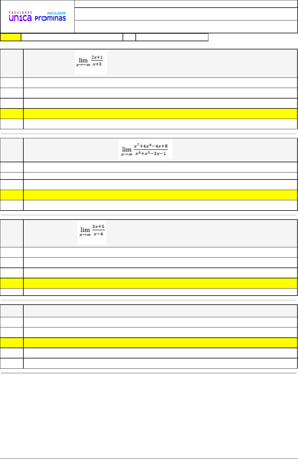 26/08/2024 10:11:26 1/3 REVISÃO DE SIMULADO Nome: ROGERIO DE OLIVEIRA SOARES Disciplina: Cálculo Diferencial e Integral I e II Respostas corretas são marcadas em amarelo X Respostas marcardas por você. Questão 001 Analise o limite e determine seu valor. X A) -2 B) +∞ C) -∞ D) 2 E) 0 Questão 002 Podemos afirmar que o limite é igual: A) -∞ B) Æ C) - 8 D) ∞ X E) 8 Questão 003 O valor do limite A) ∞ B) -∞ C) - 3 D) 3 X E) Æ Questão 004 A função f(x)= 6/x + x2, possui assíntota vertical igual a: A) x=3 B) x=1 C) x=0 X D) x=2 E) x=6 26/08/2024 10:11:26 2/3 Questão 005 Observe o gráfico da função f(x)=2/√x . Podemos afirmar que: X A) A função possui uma assíntota vertical x=1 B) A função possui uma assíntota vertical x=3 C) A função possui uma assíntota vertical x=0 D) A função possui uma assíntota horizontal y=1 E) A função possui uma assíntota horizontal y=2 Questão 006 Determine o limite A) -2 B) 0 X C) 1/2 D) 1 E) -1/2 Questão 007 Determine o limite da função 4 / (x-3) para x → 3 pela esquerda A) -∞ B) -3 C) +3 X D) 0 E) +∞ 26/08/2024 10:11:26 3/3 Questão 008 Observe a função f(x) = 2 + 2/x e a sua representação gráfica: Julgue as afirmativas em verdadeiras ou falsas. A sequência correta para as afirmativas acima é: A) V – F – V – V. B) V – F – V – F . C) F – F – V – F. D) V – F – F – F. X E) V – V – V – F.