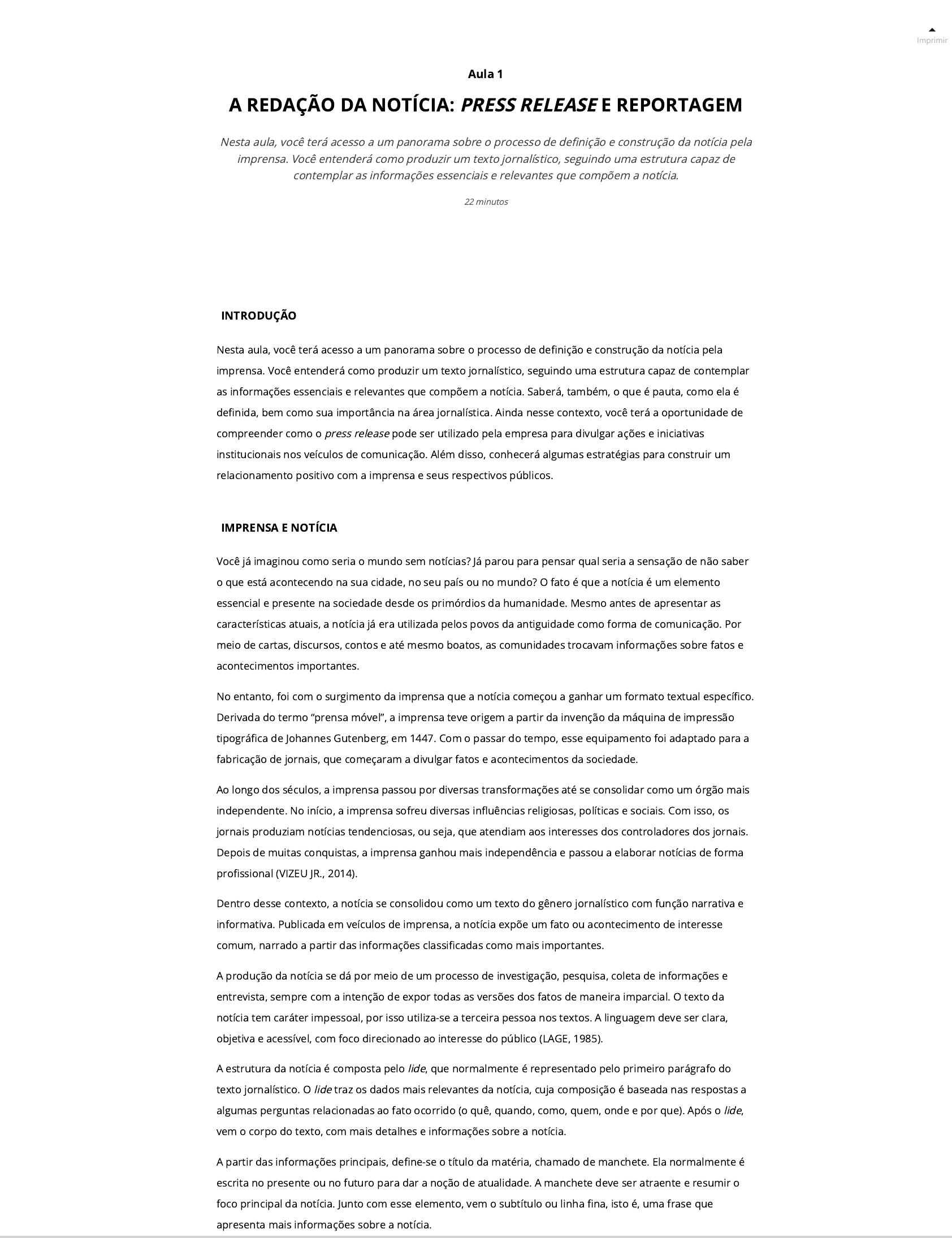 Imprimir INTRODUÇÃO Nesta aula, você terá acesso a um panorama sobre o processo de de�nição e construção da notícia pela imprensa. Você entenderá como produzir um texto jornalístico, seguindo uma estrutura capaz de contemplar as informações essenciais e relevantes que compõem a notícia. Saberá, também, o que é pauta, como ela é de�nida, bem como sua importância na área jornalística. Ainda nesse contexto, você terá a oportunidade de compreender como o press release pode ser utilizado pela empresa para divulgar ações e iniciativas institucionais nos veículos de comunicação. Além disso, conhecerá algumas estratégias para construir um relacionamento positivo com a imprensa e seus respectivos públicos. IMPRENSA E NOTÍCIA Você já imaginou como seria o mundo sem notícias? Já parou para pensar qual seria a sensação de não saber o que está acontecendo na sua cidade, no seu país ou no mundo? O fato é que a notícia é um elemento essencial e presente na sociedade desde os primórdios da humanidade. Mesmo antes de apresentar as características atuais, a notícia já era utilizada pelos povos da antiguidade como forma de comunicação. Por meio de cartas, discursos, contos e até mesmo boatos, as comunidades trocavam informações sobre fatos e acontecimentos importantes. No entanto, foi com o surgimento da imprensa que a notícia começou a ganhar um formato textual especí�co. Derivada do termo “prensa móvel”, a imprensa teve origem a partir da invenção da máquina de impressão tipográ�ca de Johannes Gutenberg, em 1447. Com o passar do tempo, esse equipamento foi adaptado para a fabricação de jornais, que começaram a divulgar fatos e acontecimentos da sociedade. Ao longo dos séculos, a imprensa passou por diversas transformações até se consolidar como um órgão mais independente. No início, a imprensa sofreu diversas in�uências religiosas, políticas e sociais. Com isso, os jornais produziam notícias tendenciosas, ou seja, que atendiam aos interesses dos controladores dos jornais. Depois de muitas conquistas, a imprensa ganhou mais independência e passou a elaborar notícias de forma pro�ssional (VIZEU JR., 2014). Dentro desse contexto, a notícia se consolidou como um texto do gênero jornalístico com função narrativa e informativa. Publicada em veículos de imprensa, a notícia expõe um fato ou acontecimento de interesse comum, narrado a partir das informações classi�cadas como mais importantes. A produção da notícia se dá por meio de um processo de investigação, pesquisa, coleta de informações e entrevista, sempre com a intenção de expor todas as versões dos fatos de maneira imparcial. O texto da notícia tem caráter impessoal, por isso utiliza-se a terceira pessoa nos textos. A linguagem deve ser clara, objetiva e acessível, com foco direcionado ao interesse do público (LAGE, 1985). A estrutura da notícia é composta pelo lide, que normalmente é representado pelo primeiro parágrafo do texto jornalístico. O lide traz os dados mais relevantes da notícia, cuja composição é baseada nas respostas a algumas perguntas relacionadas ao fato ocorrido (o quê, quando, como, quem, onde e por que). Após o lide, vem o corpo do texto, com mais detalhes e informações sobre a notícia. A partir das informações principais, de�ne-se o título da matéria, chamado de manchete. Ela normalmente é escrita no presente ou no futuro para dar a noção de atualidade. A manchete deve ser atraente e resumir o foco principal da notícia. Junto com esse elemento, vem o subtítulo ou linha �na, isto é, uma frase que apresenta mais informações sobre a notícia. Aula 1 A REDAÇÃO DA NOTÍCIA: PRESS RELEASE E REPORTAGEM Nesta aula, você terá acesso a um panorama sobre o processo de de�nição e construção da notícia pela imprensa. Você entenderá como produzir um texto jornalístico, seguindo uma estrutura capaz de contemplar as informações essenciais e relevantes que compõem a notícia. 22 minutos É importante notar que a notícia não se resume exclusivamente ao texto jornalístico. Devem-se considerar todos os elementos que acompanham a veiculação da notícia, como as imagens e legendas. Você já deve ter ouvido falar que uma imagem vale mais do que mil palavras, certo? Muitas vezes, a notícia pode ser resumida em uma fotogra�a, ilustração ou vídeo. Da mesma forma, uma palavra pode representar mil imagens e resumir um acontecimento de maneira impactante e assertiva. PRESS RELEASE E NOTÍCIA Agora que você aprendeu sobre o processo de produção da notícia, é importante entender como acontece a seleção do tema que será a base desse texto jornalístico. A elaboração da notícia começa com a escolha da pauta, ou seja, com a de�nição dos assuntos considerados relevantes e interessantes para o público de um determinado veículo de comunicação. Uma pauta traz as principais informações do fato a ser investigado, delimita o foco da matéria e indica as fontes que devem ser consultadas para a produção do texto jornalístico. A pauta oferece o direcionamento, apontando o caminho para que a notícia seja averiguada, construída e, posteriormente, publicada pela imprensa. É importante saber que as pautas terão interesses diferentes para cada veículo de comunicação, de acordo com as tendências editoriais e as preferências do público-alvo (HENRIQUES et al., 2019). Para uma pauta sobre eleição presidencial, por exemplo, seria relevante adotar a divulgação em jornais diários. Por outro lado, uma pauta sobre esportes radicais será mais interessante para uma revista especializada. As pautas podem ser levantadas pelo jornalista da imprensa ou sugeridas por meio de um press release produzido por uma empresa. O jornalista está sempre em busca de pautas, por isso o press release é um instrumento importante e de grande utilidade para a imprensa, servindo como base para o