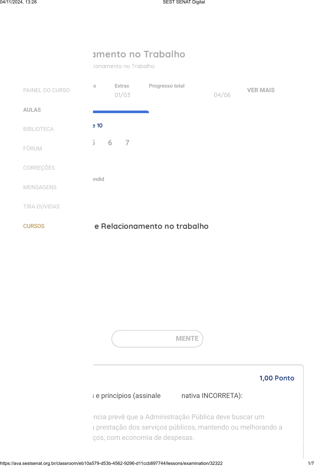 Ética e Relacionamento no Trabalho Status Aprovado Conteúdos 03/03 Extras 01/03 Progresso total 04/06 Online Turma: Ética e Relacionamento no Trabalho VER MAIS Questões respondidas: 10 de 10 1 2 3 4 5 6 7 8 9 10 Não respondida Respondida AVALIAÇÃO Avaliação �nal - Ética e Relacionamento no trabalho Tentativa 1 10,00 APROVADO RESPONDER NOVAMENTE Sobre os padrões éticos e princípios (assinale a alternativa INCORRETA): PERGUNTA 1 1,00 Ponto O princípio da E�ciência prevê que a Administração Pública deve buscar um aperfeiçoamento na prestação dos serviços públicos, mantendo ou melhorando a qualidade dos serviços, com economia de despesas. PAINEL DO CURSO AULAS BIBLIOTECA FÓRUM CORREÇÕES MENSAGENS TIRA-DÚVIDAS CURSOS 04/11/2024, 13:28 SEST SENAT Digital https://ava.sestsenat.org.br/classroom/eb10a579-d53b-4562-9296-d11ccb897744/lessons/examination/32322 1/7 https://ava.sestsenat.org.br/ https://digital.sestsenat.org.br/meu-espaco Identi�que as técnicas ou estratégias de gerenciamento de con�ito (assinale a alternativa INCORRETA): De acordo com a comunicação verbal e não verbal (assinale a alternativa INCORRETA): O Princípio da legalidade é fundamento do Estado democrático de direito, tendo por �m combater o poder arbitrário do Estado. No Princípio da Impessoalidade a Administração não deve manter-se numa posição de neutralidade em relação aos administrados, �cando proibida de estabelecer discriminações gratuitas. No Princípio da Moralidade a Administração deve atuar com moralidade, isto é de acordo com a lei. Alternativa correta PERGUNTA 2 1,00 Ponto Estratégia ganhar perder Estratégia participativa Estratégia de acomodação Estratégia integrativa Alternativa correta PERGUNTA 3 1,00 Ponto O uso inadequado do toque não pode causar problemas de acusações de conduta imprópria ou assédio moral. As possibilidades de comunicação são in�nitas. PAINEL DO CURSO AULAS BIBLIOTECA FÓRUM CORREÇÕES MENSAGENS TIRA-DÚVIDAS CURSOS 04/11/2024, 13:28 SEST SENAT Digital https://ava.sestsenat.org.br/classroom/eb10a579-d53b-4562-9296-d11ccb897744/lessons/examination/32322 2/7 https://digital.sestsenat.org.br/meu-espaco Na construção de relações, o encontro cara a cara é, inegavelmente, o meio de comunicação mais e�caz e continua a ser a mais importante interação humana. Leia as frases abaixo e assinale a alternativa INCORRETA relativa as quatro questões apresentadas quanto às ações diárias: O toque aumenta a probabilidade de as pessoas fazerem aquilo que você pedir. O poder emocional de um toque caloroso, amigável ou encorajador mantém sua potência na vida adulta, explicado quimicamente pela liberação de um hormônio chamado ocitocina. Alternativa correta PERGUNTA 4 1,00 Ponto Certo Errado Alternativa correta PERGUNTA 5 1,00 Ponto Se intencionalmente engana e mente, então as pessoas têm bons motivos para não acreditar em você. Se levarmos os compromissos a sério, os outros jamais agirão da mesma forma. Por outro lado agirmos de forma leviana, os outros farão o mesmo. Veri�que se sem perceber costuma prometer realizar algo, ou se compromete sem cumprir. Se assim for, será possível que o considerem uma pessoa que não merece con�ança. É importante ter certo grau de previsibilidade para que as pessoas con�em em você. Se, é confuso, indeciso ou incoerente será mais difícil transmitir con�ança. PAINEL DO CURSO AULAS BIBLIOTECA FÓRUM CORREÇÕES MENSAGENS TIRA-DÚVIDAS CURSOS 04/11/2024, 13:28 SEST SENAT Digital https://ava.sestsenat.org.br/classroom/eb10a579-d53b-4562-9296-d11ccb897744/lessons/examination/32322 3/7 https://digital.sestsenat.org.br/meu-espaco Com relação ao Relacionamento Organizacional, valorizar as pessoas por inteiro possibilita que a relação funcione e se mantenha nos trilhos. Quanto maior a amplitude que se compreende as percepções, as preocupações e os valores uns dos outros, maior a capacidade de trabalhar em conjunto. Leia as frases abaixo e assinale a alternativa INCORRETA relativa aos valores organizacionais: Alternativa correta PERGUNTA 6 1,00 Ponto Certo Errado Alternativa correta PERGUNTA 7 1,00 Ponto Criam entre os empregados modelos mentais semelhantes, relativos ao funcionamento e à missão da organização, evitando percepções diferentes que, certamente, teriam repercussões no comportamento e atitudes dos empregados, pois os valores são assimilados em suas estruturas cognitivas. Valores organizacionais têm funções importantes no relacionamento entre os públicos a ela vinculados. Não atuam como mediadores nos con�itos, contribuindo para a solução dos problemas entre as pessoas e, garantindo a sobrevivência organizacional. Contribuem na construção da identidade social da organização, tornando-a distinta em relação às demais organizações e alinhando as relações internas e externas; PAINEL DO CURSO AULAS BIBLIOTECA FÓRUM CORREÇÕES MENSAGENS TIRA-DÚVIDAS CURSOS 04/11/2024, 13:28 SEST SENAT Digital https://ava.sestsenat.org.br/classroom/eb10a579-d53b-4562-9296-d11ccb897744/lessons/examination/32322 4/7 https://digital.sestsenat.org.br/meu-espaco Para reconciliação das diferenças, o primeiro passo é explorar o próprio território interno, ou o autoconhecimento, dessa forma será possível identi�car o que é importante para nós e o que procuramos em relação ao outro. Ética é um conjunto de padrões e valores que de�nem o comportamento humano, de forma natural. Todo ser humano é dotado de uma consciência que o faz distinguir entre o certo e o errado, justo ou injusto, bom ou ruim. Leia as frases abaixo e assinale a alternativa INCORRETA relativa às formas de comunicação: Alternativa correta PERGUNTA 8 1,00 Ponto Errado Certo Alternativa correta PERGUNTA 9 1,00 Ponto Verdadeiro Falso Alternativa correta PERGUNTA 10 1,00 Ponto PAINEL DO CURSO AULAS BIBLIOTECA FÓRUM CORREÇÕES MENSAGENS TIRA-DÚVIDAS CURSOS 04/1