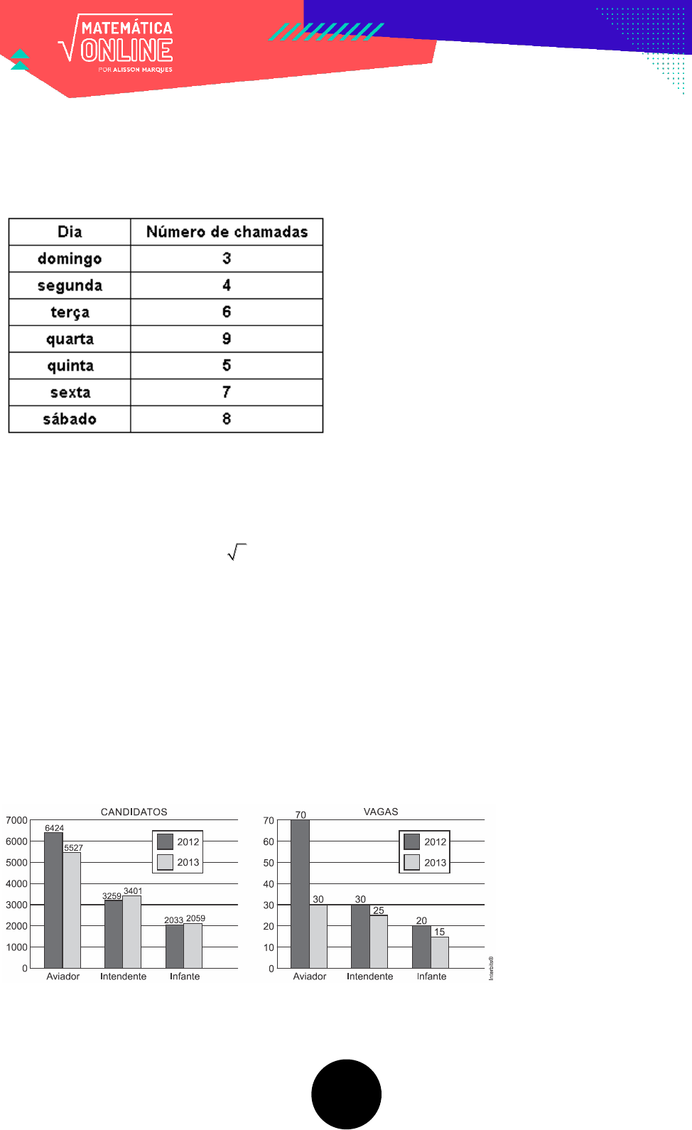 ESPECÍFICOS DE DESVIO PADRÃO E VARIÂNCIA 90 1. (Ufpr) O serviço de atendimento ao consumidor de uma concessionária de veículos recebe as reclamações dos clientes via telefone. Tendo em vista a melhoria nesse serviço, foram anotados os números de chamadas durante um período de sete dias consecutivos. Os resultados obtidos foram os seguintes: Sobre as informações contidas nesse quadro, considere as seguintes afirmativas: I. O número médio de chamadas dos últimos sete dias foi 6. II. A variância dos dados é 4. III. O desvio padrão dos dados é 2 . Assinale a alternativa correta. a)Somente as afirmativas I e III são verdadeiras. b)Somente as afirmativas I e II são verdadeiras. c)Somente as afirmativas II e III são verdadeiras. d)Somente a afirmativa I é verdadeira. e)As afirmativas I, II e III são verdadeiras. 2. (Epcar (Afa)) Os gráficos a seguir apresentam os números de candidatos e de vagas para os concursos AFA 2012 e 2013. ESPECÍFICOS DE DESVIO PADRÃO E VARIÂNCIA 91 Entenda-se por concorrência a razão entre o número de candidatos e número de vagas. Do concurso 2012 para o concurso 2013, pode-se afirmar corretamente que a)para a infantaria, a taxa de crescimento do número de candidatos foi positiva, porém a concorrência diminuiu. b)para o quadro de intendência, tanto a procura quanto a concorrência diminuíram. c)apesar da taxa de crescimento do número de candidatos ao quadro de aviadores ser negativa, a concorrência aumentou. d)a concorrência dobrou. 3-(Enem) Um produtor de café contratou uma empresa de consultoria para avaliar as produções de suas diversas fazendas. No relatório entregue consta que a variância das produtividades das fazendas foi igual a 9 216 kg 2 /ha 2 . Esse produtor precisa apresentar essa informação, mas em outra unidade de produtividade: sacas/ha. Ele sabe que a saca de café tem 60 kg, mas tem dúvidas em determinar o valor da variância em sacas 2 /ha 2 . A variância das produtividades das fazendas de cafe expressa em sacas 2 /ha 2 é a)153,60. b)12,39. c)6,55. d)2,56 e)1,60. 4 - (ENEM) Um fiscal de certa empresa de ônibus registra o tempo, em minuto, que um motorista novato gasta para completar certo percurso. No Quadro 1 figuram os tempos gastos pelo motorista ao realizar o mesmo percurso sete vezes. O Quadro 2 apresenta uma classificação para a variabilidade do tempo, segundo o valor do desvio padrão. Com base nas informações apresentadas nos quadros, a variabilidade do tempo é ESPECÍFICOS DE DESVIO PADRÃO E VARIÂNCIA 92 a)extremamente baixa. b)baixa. c)moderada. d)alta. e)extremamente alta. 5 - (UniRV GO) A tabela a seguir, indica a quantidade de carros vendidos ao longo de um ano por uma concessionária numa determinada cidade X. Assinale V (verdadeiro) ou F (falso) para as alternativas. a)A média de vendas foi de exatamente 26 carros por ano. b)A mediana e a moda foram, respectivamente, iguais a 25 e 22. c)A variância das vendas foi de aproximadamente 9,27. d)O desvio médio foi aproximadamente igual a 3,04. GABARITO: 1:B 2:C 3:D 4: B 5: VFFF
