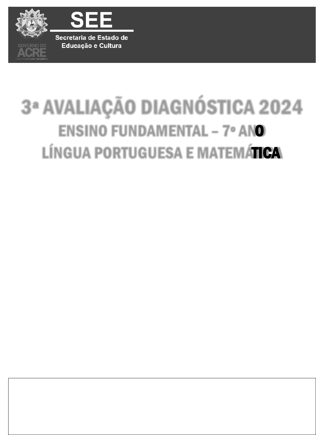 SECRETARIA DE ESTADO DE EDUCAÇÃO E CULTURA – DEPARTAMENTO DE PROGRAMAS E AÇÕES ESPECIAIS - 1 DIRETORIA DE ENSINO DEPARTAMENTO DE PROGRAMAS E AÇÕES ESPECIAIS DIVISÃO DE AVALIAÇÃO ESCOLAR INTERNA 3ª AVALIAÇÃO DIAGNÓSTICA 2024 ENSINO FUNDAMENTAL – 7º ANO LÍNGUA PORTUGUESA E MATEMÁTICA Caro(a) aluno(a), Este é um momento importante da sua vida escolar. Você está participando da 3ª Avaliação Diagnóstica 2024. Sua participação é indispensável para melhorar a qualidade da educação oferecida pela nossa escola. Faça este teste com calma. Isso é fundamental para garantir um bom resultado na avaliação. Veja algumas dicas: Este caderno contêm questões de Língua Portuguesa (01 a 15) e de Matemática (16 a 30). Leia com atenção cada questão antes de respondê-la. Cada questão tem uma única resposta certa. Reserve os últimos 20 minutos para as transcrições na folha de resposta. Cuidado e muita atenção com a ordem das questões para fazer a marcação. Procure não deixar nenhuma questão sem resposta. Quando for autorizado pelo professor, transcreva suas respostas para a Folha de Respostas utilizando caneta azul ou preta. Obrigado(a) pela sua participação! Nome da escola:____________________________________________________________________________________ Nome do(a) aluno(a):____________________________________________________________________ Nº: _____ Série:_________________________ Turma:______________ Turno: Manhã Tarde SECRETARIA DE ESTADO DE EDUCAÇÃO E CULTURA – DEPARTAMENTO DE PROGRAMAS E AÇÕES ESPECIAIS - 2 LÍNGUA PORTUGUESA Atenção! Você vai produzir um texto e, em seguida, responder a questões de Língua Portuguesa. INFORMAÇÕES PARA A PRODUÇÃO TEXTUAL GÊNERO: CARTA ABERTA Trata-se de um gênero textual de caráter argumentativo que tem a função principal de se posicionar ou solicitar alguma medida em relação a determinado tema social. A carta aberta é um gênero textual com função de direcionar alguma mensagem, questionamento ou solicitação de determinado indivíduo ou grupo para alguma pessoa ou organização de reconhecimento público. Por meio desse texto, o autor procura defender um ponto de vista e convencer não apenas o destinatário, como também o público que tiver acesso à carta. A estrutura desse gênero se assemelha à das cartas pessoais, mas possui um caráter argumentativo, tendo em vista que sempre defende uma opinião. Dessa forma, a carta aberta se estrutura de modo estratégico, para convencer os leitores a respeito da sua opinião, configurando- se, assim, em um gênero textual público. A carta aberta é muito semelhante a uma carta comum, possui remetente e destinatário, data, local e assinatura, na seguinte ordem: TÍTULO, INTRODUÇÃO, DESENVOLVIMENTO, CONCLUSÃO, DESPEDIDA, ASSINATURA. Por meio desse gênero, pode-se exercer funções cidadãs, através da publicização do seu posicionamento crítico, solicitação e sugestão de medidas políticas, baseando-se em argumentos sólidos. Disponível em: https://brasilescola.uol.com.br/redacao/carta-aberta.htm. Acesso em: 04/06/2024. Adaptado. PROPOSTA DE PRODUÇÃO Antes de produzir, leia um exemplo de carta aberta: CARTA ABERTA À PREFEITURA DE SÃO PAULO E À SECRETARIA DE TRANSPORTE Venho manifestar minha profunda insatisfação e indignação com a notícia do aumento da passagem em nossa cidade. A despeito da rotineira mudança de preço, ocorrida anualmente, é inaceitável que o trabalhador gaste tamanho valor para acessar o transporte público. Como dito já de início, é sabido que a atualização do preço ocorre anualmente, entretanto, diante das atuais condições do transporte público da capital e da renda média recebida pelos trabalhadores, é um assalto que o preço chegue a esse valor, sem apresentar por outro lado alguma melhoria significativa. Ignorando a condição do preço, é preciso questionar, por que não criar maneiras de reutilizar os cartões de transporte, seja aumentando o tempo hábil de integração ou a quantidade de uso para uma mesma passagem. Além disso, é necessário urgentemente apresentar à sociedade quais são os gastos com o transporte que justifiquem tão alto valor, afinal, além da passagem paga diariamente, contribuímos enquanto cidadãos através de nossos impostos, sendo assim, temos direito de acessar tais informações. Tenho certeza que, diante da manifestação pública desta indignação, os responsáveis tomarão providências para melhorar esta situação. Atenciosamente, Marília Cecília. São Paulo, 24 de Julho de 2018. Disponível em: https://brasilescola.uol.com.br/redacao/carta-aberta.htm. Acesso: 04/06/2024. Com base no texto, e no seu conhecimento sobre o gênero, escreva sua própria carta aberta. Lembre-se que o título deve apresentar o destinatário da mensagem. Na introdução, apresente o problema. No desenvolvimento, apresente os argumentos. Na conclusão, estimule uma atitude positiva. Finalize com sua despedida formal e assinatura com data. https://brasilescola.uol.com.br/redacao/carta-aberta.htm https://brasilescola.uol.com.br/redacao/carta-aberta.htm SECRETARIA DE ESTADO DE EDUCAÇÃO E CULTURA – DEPARTAMENTO DE PROGRAMAS E AÇÕES ESPECIAIS - 3 FOLHA DE RASCUNHO 01 02 03 04 05 06 07 08 09 10 11 12 13 14 15 16 17 18 19 20 21 22 23 24 25 26 27 28 29 30 SECRETARIA DE ESTADO DE EDUCAÇÃO E CULTURA – DEPARTAMENTO DE PROGRAMAS E AÇÕES ESPECIAIS - 4 FOLHA OFICIAL DE REDAÇÃO 01 02 03 04 05 06 07 08 09 10 11 12 13 14 15 16 17 18 19 20 21 22 23 24 25 26 27 28 29 30 NOME DO ALUNO: ________________________________________________________________________ Nº: ________________ SECRETARIA DE ESTADO DE EDUCAÇÃO E CULTURA – DEPARTAMENTO DE PROGRAMAS E AÇÕES ESPECIAIS - 5 Leia a tirinha para responder às questões 01 e 02: Disponível em: https://br.pinterest.com/pin/308848486929802537/. Acesso em 05/06/2024 (DAEI – SEE/AC, 2024) Após ler toda a tirinha, podem