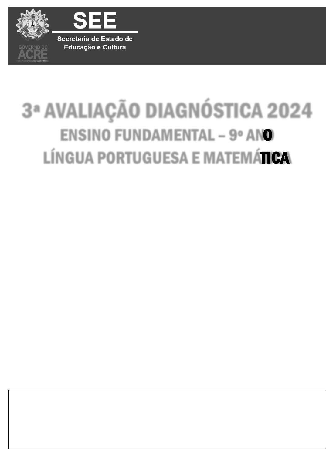 SECRETARIA DE ESTADO DE EDUCAÇÃO E CULTURA – DEPARTAMENTO DE PROGRAMAS E AÇÕES ESPECIAIS - 1 DIRETORIA DE ENSINO DEPARTAMENTO DE PROGRAMAS E AÇÕES ESPECIAIS DIVISÃO DE AVALIAÇÃO ESCOLAR INTERNA 3ª AVALIAÇÃO DIAGNÓSTICA 2024 ENSINO FUNDAMENTAL – 9º ANO LÍNGUA PORTUGUESA E MATEMÁTICA Caro(a) aluno(a), Este é um momento importante da sua vida escolar. Você está participando da 3ª Avaliação Diagnóstica 2024. Sua participação é indispensável para melhorar a qualidade da educação oferecida pela nossa escola. Faça este teste com calma. Isso é fundamental para garantir um bom resultado na avaliação. Veja algumas dicas: Este caderno contêm questões de Língua Portuguesa (01 a 15) e de Matemática (16 a 30). Leia com atenção cada questão antes de respondê-la. Cada questão tem uma única resposta certa. Reserve os últimos 20 minutos para as transcrições na folha de resposta. Cuidado e muita atenção com a ordem das questões para fazer a marcação. Procure não deixar nenhuma questão sem resposta. Quando for autorizado pelo professor, transcreva suas respostas para a Folha de Respostas utilizando caneta azul ou preta. Obrigado(a) pela sua participação! Nome da escola:____________________________________________________________________________________ Nome do(a) aluno(a):____________________________________________________________________ Nº: _____ Série:_________________________ Turma:______________ Turno: Manhã Tarde SECRETARIA DE ESTADO DE EDUCAÇÃO E CULTURA – DEPARTAMENTO DE PROGRAMAS E AÇÕES ESPECIAIS - 2 LÍNGUA PORTUGUESA Atenção! Você vai produzir um texto e, em seguida, responder a questões de Língua Portuguesa. INFORMAÇÕES PARA A PRODUÇÃO TEXTUAL GÊNERO: NOTÍCIA A notícia é um gênero textual jornalístico e não literário que está presente em nosso dia a dia, sendo encontrada principalmente nos meios de comunicação. Para escrever uma notícia, além de relatar o fato, é necessário apresentar concretude ao texto, ou seja, fortalecer a certeza de que a história é verídica, que ocorreu de fato. A comprovação da notícia se faz com o fornecimento de dados que concedam confiabilidade ao texto, como: data e local onde ocorreram os fatos; declaração e depoimentos de pessoas envolvidas nos ocorridos; imagens e outros. A notícia deve se mostrar confiável. A estrutura do gênero divide-se em: TÍTULO: chamada para a notícia, comumente apresenta o enfoque que será trabalhado no fato; SUBTÍTULO: informações complementares ao título; LIDE: parágrafos iniciais que apresentam as principais informações do texto; INFORMAÇÕES SECUNDÁRIAS: informações complementares àquelas apresentadas no lide; DETALHES: detalhes adicionais da notícia. Disponível em: https://abre.ai/fVgR. Acesso em: 09/03/2023. PROPOSTA DE PRODUÇÃO Antes de produzir, leia um exemplo de notícia. Professores estaduais do Rio de Janeiro recebem reajuste salarial Nesta quinta-feira, o secretário de educação do Rio de Janeiro convocou representantes da área para apresentar o novo reajuste salarial de 10% Numa coletiva de imprensa, realizada ontem no Palácio Guanabara, o secretário de educação do Rio de Janeiro informou sobre o reajuste salarial de 10% para os professores do estado. Ferreira explicou que a decisão já foi publicada no Diário Oficial e tem caráter emergencial. O reajuste valerá a partir de janeiro do próximo ano. Antes desta decisão ser tomada, o secretário e alguns representantes dos profissionais da educação, tentavam um acordo de reajuste salarial. A primeira proposta do atual governo era um aumento de 2,5%, que foi negado pelos professores. Em protesto, os educadores alegaram que o aumento era uma “afronta ao futuro do próprio país”. Nos últimos cinco anos, os professores do Rio de Janeiro reivindicavam o reajuste que foi prometido pelo governo atual desde o início de suas campanhas eleitorais. Após inúmeras negociações ao longo dos 3 anos de mandato, o ajuste foi aprovado em 10% para os profissionais de toda a rede estadual. Disponível em: https://www.significados.com.br/genero-textual-noticia/. Acesso em: 19/06/2024. Com base no texto e no seu conhecimento sobre o gênero, produza uma notícia sobre um fato ocorrido no bairro ou na cidade. Você pode escrever sobre o aumento da violência urbana, a campanha de vacinação, feira de livros, movimento cultural, dentre outros. Organize o texto segundo a estrutura básica do gênero jornalístico: títulos, lide e corpo da notícia. Para produzir, é importante ressaltar que a notícia é um texto curto e objetivo, portanto, nela não deverá aparecer a opinião de seus autores. Fique atento à linguagem utilizada, que deverá ser formal, sem perder de vista a clareza e as regras gramaticais. https://abre.ai/fVgR https://www.significados.com.br/genero-textual-noticia/ SECRETARIA DE ESTADO DE EDUCAÇÃO E CULTURA – DEPARTAMENTO DE PROGRAMAS E AÇÕES ESPECIAIS - 3 FOLHA DE RASCUNHO 01 02 03 04 05 06 07 08 09 10 11 12 13 14 15 16 17 18 19 20 21 22 23 24 25 26 27 28 29 30 SECRETARIA DE ESTADO DE EDUCAÇÃO E CULTURA – DEPARTAMENTO DE PROGRAMAS E AÇÕES ESPECIAIS - 4 FOLHA OFICIAL DE REDAÇÃO 01 02 03 04 05 06 07 08 09 10 11 12 13 14 15 16 17 18 19 20 21 22 23 24 25 26 27 28 29 30 NOME DO ALUNO: ________________________________________________________________________ Nº: ________________ SECRETARIA DE ESTADO DE EDUCAÇÃO E CULTURA – DEPARTAMENTO DE PROGRAMAS E AÇÕES ESPECIAIS - 5 (DAEI – SEE/AC, 2024) Leia a tirinha a seguir. Disponível em: https://abre.ai/j2Sc. Acesso em: 25/06/2024. No segundo quadro da tirinha, a chegada do Natal representa um problema porque os perus temem servir de alimento no Natal. detestam a celebração de Natal. nem sempre aproveitam o Natal. são ignorados durante o Natal. Leia o poema. Minha sombra De manhã a minha sombra Com meu papagaio e o meu macaco Começam a me arremedar. E quando saio A minha s
