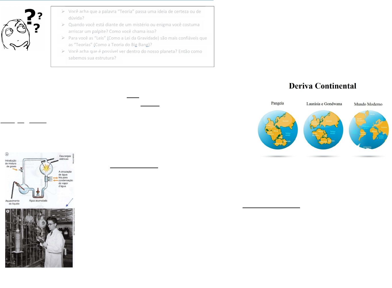15 3 - “Isso é só uma teoria” Muitas vezes utilizamos palavras em nosso dia a dia que têm significado diferente em outros lugares e situações. Por exemplo, quando você diz que tem uma “teoria” sobre porque seu time perdeu uma partida de futebol é diferente de quando um grupo de cientistas elabora uma teoria científica. “Teoria”, no senso comum, é um palpite sobre a explicação de algum fato; um pouco semelhante às hipóteses que os cientistas elaboram: uma explicação provisória, ainda que fundamentada em saberes científicos prévios. Cientistas trabalham com teorias, leis e modelos todos os dias para tentar explicar os fenômenos estudados, mas estas teorias, assim como tudo na ciência, buscam estar exatas, sendo calculáveis, observáveis ou verificáveis. Vamos aprender a diferença entre esses termos? 1 – Hipótese: É uma tentativa de solução do problema científico apresentado, uma explicação temporária, que ainda precisa passar pela verificação. Exemplo: No início do século XX, o cientista sueco Svante Arrhenius elaborou a hipótese da Panspermia Cósmica. Segundo ele, seria altamente improvável que as moléculas complexas da vida tenham surgido de modo espontâneo na Terra. Para ele, tais moléculas teriam vindo do espaço exterior em cometas. Como esta idéia ainda não foi verificada de modo algum, ela segue sendo apenas uma hipótese: uma tentativa de solução para um problema científico. A Teoria atualmente aceita para a origem das moléculas orgânicas é a Teoria da Evolução Química, dos cientistas Oparin e Haldane. Ela foi verificada experimentalmente (“comprovada”) pelos cientistas Miller e Urey. Figura 11 - O experimento que verificou a hipótese sobre a origem das moléculas da vida na Terra. Fonte: Você acha que a palavra “Teoria” passa uma ideia de certeza ou de dúvida? Quando você está diante de um mistério ou enigma você costuma arriscar um palpite? Como você chama isso? Para você as “Leis” (Como a Lei da Gravidade) são mais confiáveis que as “Teorias” (Como a Teoria do Big Bang)? Você acha que é possível ver dentro do nosso planeta? Então como sabemos sua estrutura? 16 2 – Teoria: Uma teoria é desenvolvida quando uma ou várias hipóteses são testadas, confrontadas e verificadas, até que o grupo de cientistas concorde qual delas é a mais adequada para explicar o problema científico proposto inicialmente. Uma teoria pode ser testada empiricamente (experimentos) ou não, dependendo da natureza do fenômeno observado. Porém outras ferramentas podem ser utilizadas, como medições e coleta de dados de campo. Dois exemplos muito famosos de teorias científicas são a Teoria da Evolução e a Teoria da Deriva Continental. A Teoria da Deriva Continental afirma que os continentes estão continuamente em movimento, gerando efeitos no relevo e fenômenos como vulcões e terremotos. A verificação desta teoria se deu ao longo de vários anos, após intenso debate científico, medições, coleta de rochas e fósseis de diferentes lugares para comparação. Figura 12 - Teoria da Deriva Continental Uma teoria científica é sempre “Aproximadamente exata”, pois precisa estar aberta a novos fatos, observações e experimentos que possam modificá-la. Quando isto não ocorre, ou pelo contrário: novos fatos, observações e experimentos comprovam mais ainda a teoria em questão, ela é elevada à condição de CONSENSO CIENTÍFICO. Foi o que aconteceu com as Teorias da Evolução e da Deriva Continental: elas atualmente têm uma gama de elementos de comprovação tão grande que são praticamente exatas. Teorias refutadas: ao longo da história, uma série de teorias científicas foram abandonadas diante do surgimento de novos dados e tecnologias. Foi o caso, por exemplo, do Geocentrismo (Terra como centro do Universo), a Abiogênese (a vida poderia surgir espontaneamente da matéria não-viva) e o Imobilismo (Os continentes estão imóveis ao longo dos milênios). 17 3 – Lei: Ao contrário do que possa parecer, a Lei não é superior à Teoria. As leis científicas são uma descrição detalhada de eventos que acontecem regularmente, e geralmente pode ser expressa por fórmulas matemáticas. Por exemplo: a queda dos objetos. Podemos experimentar que, ao soltar um objeto ele cai em direção ao chão. Ao experimentar muitas vezes, podemos concluir que os objetos sempre caem em direção ao chão. Porém, POR QUE os objetos caem? Com que velocidade eles caem? É possível prever onde, como e quando eles vão cair? Para responder a todos esses questionamentos, usamos a Lei da Gravidade, elaborada pelo cientista Isaac Newton. Ele chegou à conclusão que existe uma força que atrai os objetos em relação ao chão, e isso se dá por causa da enorme massa do nosso planeta em relação ao objeto que é solto. Ele calculou que os objetos sempre caem na mesma taxa de aceleração, que é aproximadamente 9,8 m/s². Com esses dados, é possível prever com regularidade a queda de todos os objetos na superfície da Terra. Figura 13 - Na superfície da Terra todos os objetos caem segundo a mesma lei. As leis não são superiores às teorias, muito pelo contrário: elas muitas vezes ajudam a confirmá-las. A Teoria da Evolução, por exemplo, previa a Seleção Natural dos indivíduos pelo meio, selecionando “Fatores” hereditários. Darwin, porém, não sabia explicar como esses fatores eram transmitidos. Posteriormente, um monge botânico, Gregor Mendel, interessado em prever o resultado do cruzamento de variedades de ervilhas, elaborou as Leis de Mendel, que deram suporte para a Teoria da Evolução de Darwin. Figura 14 - As leis de Mendel ajudaram a explicar as teorias de Darwin 18 4 – Modelos: Algumas vezes os problemas científicos tratam de coisas infinitamente grandes ou infinitamente pequenas, de modo que é impossível ao cientista a observação direta do fenômeno. Para explicar a maior pa