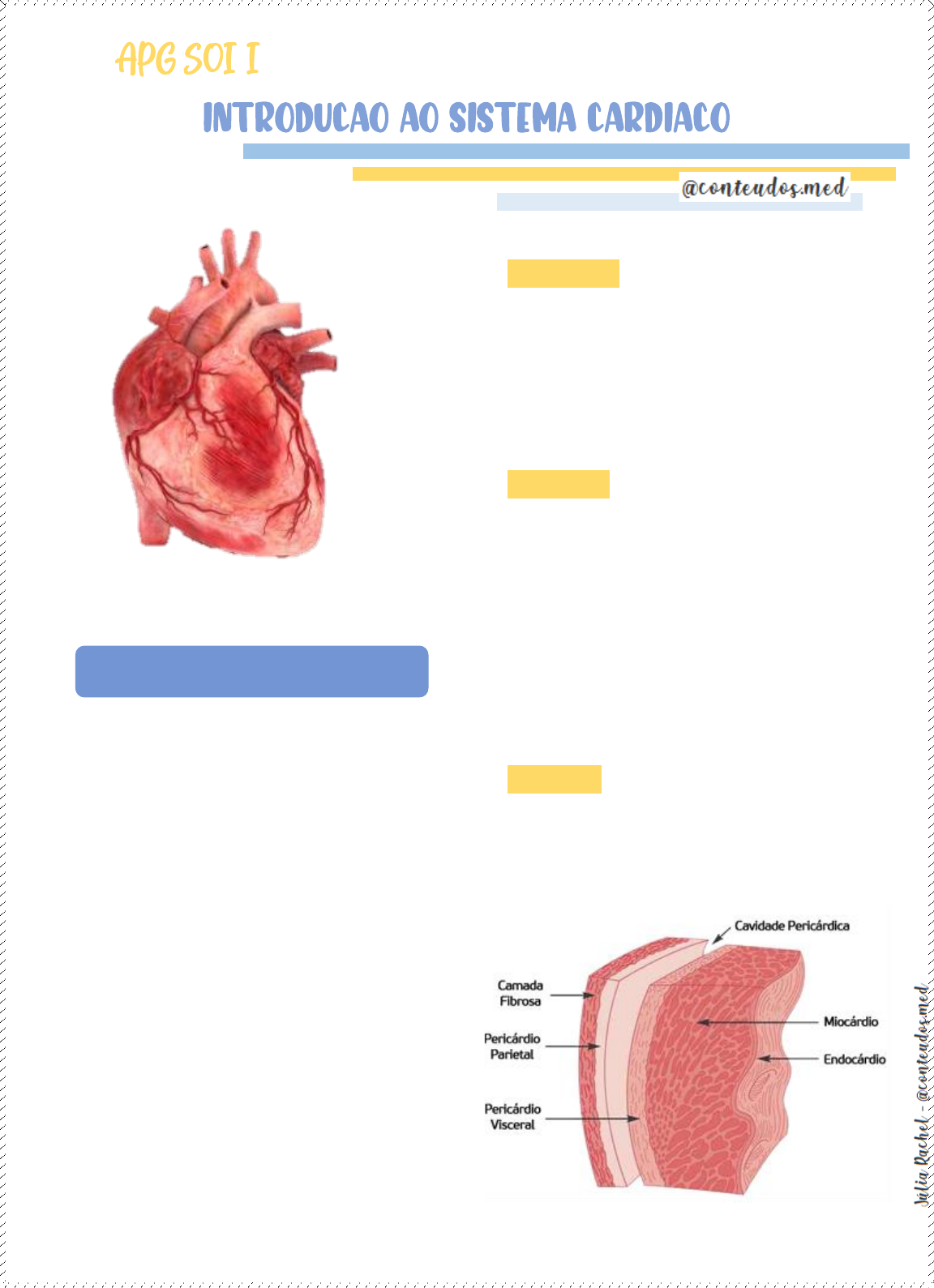 O coração é uma bomba dupla de sucção e pressão, que impulsiona o sangue pela dupla alça infinita formada pelos circuitos pulmonar e sistêmico. As câmaras direitas do coração servem ao primeiro e as câmaras esquerdas, ao segundo. O coração tem o formato de uma pirâmide inclinada, com o ápice em direção anteroinferior e para a esquerda, e a base oposta ao ápice (posterior). Cada lado do coração tem uma câmara de recepção (átrio) e uma câmara de sucção, compressão e expulsão (ventrículo). Tem o tamanho um pouco maior do que uma mão fechada. O coração pode ser dividido em três camadas: endocárdio, miocárdio e epicárdio. ENDOCÁRDIO É uma lâmina fina presente em toda a superfície interna do órgão e suas valvas, podendo ser granular ou liso (granular quando contém trabéculas e liso quando não as tem). MIOCÁRDIO É a parte muscular da parede do órgão e está entre o endocárdio e o pericárdio. Ele é muito visível no septo interventricular, além de possuir células especializadas nos ventrículos. Essas células, dispostas em orientação perpendicular ao tecido de revestimento, aumentam a força de contração. EPICÁRDIO Faz parte do próprio pericárdio, sendo apresentado como a lâmina visceral do pericárdio seroso. ANATOMIA MÚSCULO ESTRIADO ESQUELÉTICO A contração se dá pelos mecanismos de despolarização e repolarização com bomba de Na+ e K+. Polarização: em repouso. Predomínio de Na+ no meio extracelular e K+ no meio intracelular; Despolarização: abertura dos canais rápidos de Na+, influxo de Na+ e efluxo de K+; Repolarização: bomba de Na+ e K+, devolvendo o Na+ para fora e o K+ para dentro, em uma proporção de 3:1. MÚSCULO ESTRIADO CARDÍACO A contração se dá pelos mecanismos de despolarização e repolarização. Polarização: em repouso. Predomínio de Na+ no meio extracelular e K+ no meio intracelular; Despolarização: estímulo das células marcapasso. Abertura dos canais rápidos de Na+ e abertura dos canais lentos de Ca2+; Repolarização precoce: fechamento dos canais rápidos de Na+, efluxo de K+ da célula e manutenção da abertura dos canais lentos de Ca2+. Plateau: o músculo cardíaco continua despolarizado, devido aos canais lentos de Ca2+ abertos reduzirem a velocidade de saída do K+; Repolarização: fechamento dos canais lentos de Ca2+ e saída dos íons K+. Sístole é o momento de contração e diástole é o momento de relaxamento. O átrio direito vai receber sangue venoso vindo das veias cavas superior e inferior. Esse sangue venoso do átrio direito segue para o ventrículo direito passando pela válvula tricúspide. O sangue venoso ventricular direito é ejetado passando pela válvula pulmonar semilunar. CICLO CARDÍACO MECANISMOS DE CONTRAÇÃO MUSCULAR O sangue venoso vai para os pulmões ser oxigenado através das artérias pulmonares. O sangue já oxigenado, arterial, retorna dos pulmões para o átrio esquerdo através das veias pulmonares. O sangue arterial passa do átrio esquerdo para o ventrículo esquerdo através da válvula bicúspide/mitral. O ventrículo esquerdo vai ejetar o sangue arterial através da válvula aórtica semilunar. Esse sangue segue para a circulação sistêmica pela artéria aorta. GUYTON, A.C.; HALL, J.E. Tratado de Fisiologia Médica. 11ª ed. Rio de Janeiro, Ed. Elsevier,2006. SILVERTHORN DU. Fisiologia humana: Uma abordagem integrada. 7ª ed., Porto Alegre: Ed. Artmed, 2017. TORTORA, Gerard J.. Principios de anatomia e fisiologia . 14 ed. Rio de Janeiro: Guanabara Koogan, 2017. FASES DE CONTRAÇÃO VENTRICULAR Fase de enchimento rápido; (70%) válvulas tricúspide e bicúspide estão abertas, válvulas semilunares estão fechadas. Fase de enchimento lento; (30%) válvulas tricúspide e bicúspide estão abertas, válvulas semilunares estão fechadas. Fase de contração isovolumétrica: os ventrículos vão se contrair, mas sem ejetar sangue. Para criar pressão no interior dos ventrículos para abrir as válvulas semilunares. Válvulas tricúspide e bicúspide, válvulas aórticas e pulmonares fechadas; Fase de ejeção rápida: Válvulas tricúspide e bicúspide fechadas, válvulas semilunares se abrem; Fase de ejeção lenta: Válvulas tricúspide e bicúspide fechadas, válvulas semilunares se abrem; Repouso: diástole ventricular. Referências