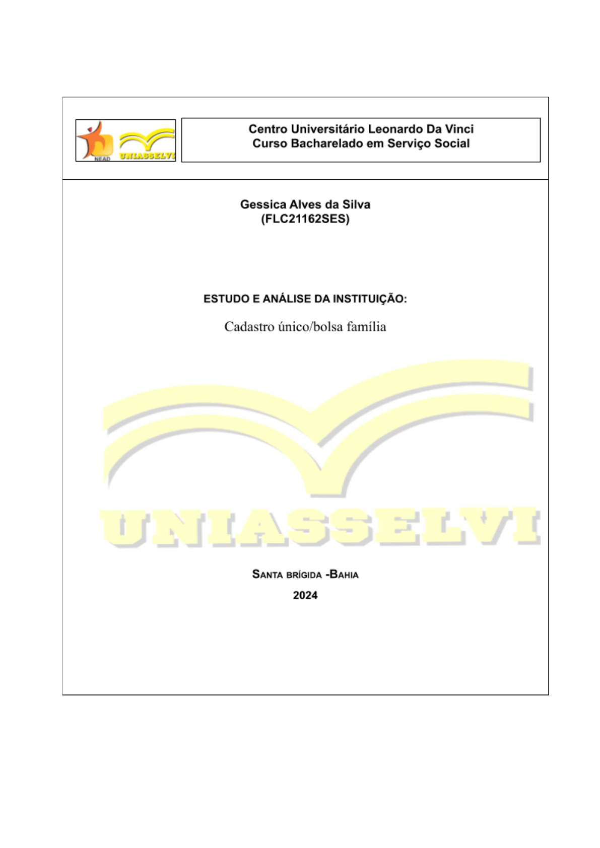 GESSICA ALVES DA SILVA ESTUDO E ANÁLISE DA INSTITUIÇÃO: (cadastro único) Estudo apresentado à disciplina de Estágio I – Iniciação ao Serviço Social – do Curso de Serviço Social – do Centro Universitário Leonardo da Vinci – UNIASSELVI, como requisito parcial para avaliação. Nome do Tutor Externo – Janeíse Nascimento de Morais Nome do Supervisor de Campo – Silvana Silva SANTA BRÍGIDA 2024 SUMÁRIO INTRODUÇÃO .................................................................................................................. 1 IDENTIFICAÇÃO DA INSTITUIÇÃO CONCEDENTE DE ESTÁGIO............................ 1.1 DADOS CADASTRAIS DA INSTITUIÇÃO ................................................................. 1.2 DESCRIÇÃO GERAL DA INSTITUIÇÃO.................................................................. 1. Histórico da instituição..................................................................................... 2. Área de atuação, objetivos e finalidades........................................................ 3. Área de abrangência........................................................................................ 4. Demandas atendidas pela instituição............................................................... 5. Principais características da população atendidas pela instituição.................. 6. Proposta de atuação ao usuário...................................................................... 7. Estrutura e funcionamento da organização...................................................... 1.3 O SERVIÇO SOCIAL NA INSTITUIÇÃO............................................................... 1.3.1 Identificação do Supervisor de Campo............................................................... 1.3.2 Origem do Serviço Social na Instituição.............................................................. 1.3.3 O Assistente Social.............................................................................................. 1.3.4 O Instrumental Técnico-Operativo........................................................................ 2 CONCLUSÕES......................................................................................................... O ESTUDO DA INSTITUIÇÃO............................................................................. 3 REFERÊNCIA BIBLIOGRÁFICA.................................................................................. INTRODUÇÃO Neste presente trabalho será feito uma análise institucional com a finalidade de conhecer a instituição identificando qual a sua forma de organização e compreendendo quais são os seus objetivos e proposta de atuação. A partir dessa análise será esclarecido a função do setor cadastro único no município de Santa Brígida, que se encontra vinculado à secretaria de assistência e desenvolvimento social. 1 IDENTIFICAÇÃO DA INSTITUIÇÃO CONCEDENTE DE ESTÁGIO O CadÚnico foi instituído por meio do decreto nº 3877 de 24 de julho de 2001. Em 2003 aconteceu a integração entre a base do cadúnico e o programa bolsa família, sendo que os cadastros das famílias beneficiárias de tal programa deviam ser atualizados e complementados no cadúnico. 1.1 DADOS CADASTRAIS DA INSTITUIÇÃO Razão Social: cadastramento bolsa familia CNPJ: 14.217.368/001-10 Nome Fantasia: cadastro único Tipo de Instituição: ( x ) Pública ( ) Privada ( ) Terceiro setor ( ) Outra (mais opções) Ramo de Atividade: ( x ) Serviços ( ) Indústria ( ) Outra (mais opções) End: avenida rui barbosa Bairro: centro Cidade:Santa Brigida UF: BA Fone: (75) 3698-2155 CEP.: 480570-000 E-mail: smcds@SANTABRIGIDA.BA.GOV.BR Representada por: Andreza Zacarias dos Santos Cargo: gestora 1.2 DESCRIÇÃO GERAL DA INSTITUIÇÃO O setor cadastro único é um órgão da prefeitura vinculado à secretaria de assistência e desenvolvimento social, e está localizado na avenida Rui Barbosa no município de Santa Brígida, em uma casa alugada pela prefeitura no centro da cidade; neste espaço é realizado os cadastros para a identificação socioeconômica das famílias de baixa renda, além da inserção dessas famílias no programa bolsa família, que dispõe de vários benefícios, como: benefício de renda de cidadania (BRC), benefício complementar (BC), benefício primeira infância (BPI), benefício variável familiar (BVF), benefício extraordinário de transição (BET), e programa auxílio gás. 1.2.1 Histórico da instituição: Instituído por meio do decreto nº 3.877 de 24 de julho de 2001, a base cadúnico e o programa bolsa escola foram integrados em 2013, sendo que os cadastros das famílias beneficiárias de tal programa deveriam ser atualizados e complementados no cadúnico, também nesse ano foi criado o programa bolsa família pelo governo de Luiz Inácio Lula da Silva, e que ainda hoje se constitui como principal usuário do cadastro único. 1.2.2 Área de atuação, objetivos e finalidades No município de Santa Brígida a instituição tem como principal política pública o programa bolsa família, que por sua vez contribui para o resgate da dignidade e da cidadania das famílias e também para a atuação em ações complementares por meio de articulações com outras políticas, para a superação da pobreza e transformação social, tais como: assistência social, acesso das famílias à saúde, educação, esporte, ciência e trabalho. Os profissionais trabalham em prol das famílias de renda per capita de até meio salário mínimo, e o principal objetivo é identificar todas essas famílias para planejamento de políticas públicas em todas as esferas de governo. O cadastro único para programas sociais é a principal ferramenta para identificar e caracterizar as famílias de baixa renda, permitindo que a gestão pública seja mais eficiente e equitativa na alocação de recursos e execução de programas sociais(JANNUZZI,2009) 1.2.3 Área de abrangência A i