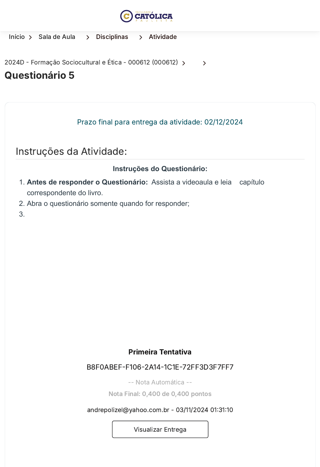 Início 〉 Sala de Aula 〉 Disciplinas 〉 Atividade 2024D � Formação Sociocultural e Ética - 000612 �000612� 〉 〉 Questionário 5 Instruções da Atividade: Prazo final para entrega da atividade: 02/12/2024 Instruções do Questionário: 1. Antes de responder o Questionário: Assista a videoaula e leia o capítulo correspondente do livro. 2. Abra o questionário somente quando for responder; 3. Ao abrir o questionário você terá 4 questões para responder; 4. Leia com calma todas as questões e entenda o que pede a questão: se pede a incorreta, a correta e qual o tema da questão; 5. Lembre-se de Clicar no botão "Enviar"; 6. Você tem duas tentativas para fazer o teste, a segunda tentativa é opcional; 7. Lembre-se que as respostas mudam de lugar em cada tentativa; 8. As respostas corretas só aparecem após o envio da segunda tentativa; 9. O sistema considera a maior nota entre as duas tentativas; 10. Lembre-se que na segunda tentativa zera TODAS as questões, inclusive as que você acertou na primeira tentativa. Bons estudos! Primeira Tentativa B8F0ABEF�F106�2A14�1C1E�72FF3D3F7FF7 -- Nota Automática -- Nota Final: 0,400 de 0,400 pontos andrepolizel@yahoo.com.br - 03/11/2024 01�31�10 Visualizar Entrega 05/11/2024, 22:59 AVA - Faculdade Católica Paulista https://ava.uca.edu.br/aluno/sala-de-aula/disciplina/modulo/atividade/187941 1/8 https://ava.uca.edu.br/aluno/sala-de-aula/disciplina/modulo/atividade/187941 https://ava.uca.edu.br/aluno/sala-de-aula/disciplina/modulo/atividade/187941 https://ava.uca.edu.br/aluno/sala-de-aula/disciplina https://ava.uca.edu.br/aluno/sala-de-aula/disciplina/modulo/atividade/:id/:nome javascript:void(0); Fazer Segunda Tentativa Perguntas Pergunta 1. Pergunta 2. Pergunta 3. Pergunta 4. pontos: 0,100Pergunta 1. A formação histórica do Brasil é permeada pela maneira como os indígenas, os portugueses e os negros conformaram a base de nossa sociedade. Enquanto o primeiro grupo era originário desta terra, o segundo buscou convertê-lo à religião, civilidade e ao trabalho escravo, mas diante da ausência de sucesso trouxe os terceiros da África para promover o avanço da produção de matérias-primas na colônia. Tendo em vista os aspectos históricos e conceituais das relações étnico-raciais no Brasil, assinale a alternativa correta: Múltipla Escolha: A�� Os termos raça e etnia remetem ao mesmo conceito, como praticado pelo Instituto Brasileiro de Geografia e Estatística (IBGE). B�� A existência de marcas simbólicas de reconhecimento cultural de povos não configura elemento étnico-racial. C�� 05/11/2024, 22:59 AVA - Faculdade Católica Paulista https://ava.uca.edu.br/aluno/sala-de-aula/disciplina/modulo/atividade/187941 2/8 javascript:void(0); Tratar de relações étnico-raciais diz respeito às discussões que versam especificamente sobre negros e indígenas. D�� A etnia diz respeito às dimensões de pertencimento e identificação cultural de indivíduos como um mesmo povo. E�� A raça é uma categoria biológica, que permite a classificação de indivíduos conforme seu local de nascimento. pontos: 0,100Pergunta 2. Ao abordar as ações do Estado brasileiro frente às questões de ordem étnico-raciais, o material didático da disciplina de Formação Sociocultural e Ética enfocou um conjunto de elementos históricos que tratam dos avanços e dos limites das políticas públicas, instituições e legislações criadas para atender aos direitos sociais de negros e indígenas. Acerca desse assunto, analise as afirmações a seguir: I – A abordagem do Estado junto aos indígenas se deu com respeito às suas tradições e culturas. II – Durante muitos séculos, os indígenas não foram atendidos por políticas públicas no Brasil. III – A noção de alteridade permeou a definição de políticas públicas às populações indígenas. IV – A criação do Serviço de Proteção ao Índio buscava defender seus direitos em seus territórios. Avaliação Nota Avaliada: 0,100 de 0,100 05/11/2024, 22:59 AVA - Faculdade Católica Paulista https://ava.uca.edu.br/aluno/sala-de-aula/disciplina/modulo/atividade/187941 3/8 javascript:void(0); V – Na década de 1930 houve atuação estatal para migrar indígenas ao trabalho rural e miscigenação. É correto o que se afirma apenas em: Múltipla Escolha: A�� II e V. B�� I, II e III. C�� I, III, IV e V. D�� II, III e IV. E�� I, III e IV. pontos: 0,100Pergunta 3. A relação entre marcadores sociais e políticas públicas é debatida em diversas aulas da disciplina de Formação Sociocultural e Ética, sendo que no que diz respeito à questão de Avaliação Nota Avaliada: 0,100 de 0,100 05/11/2024, 22:59 AVA - Faculdade Católica Paulista https://ava.uca.edu.br/aluno/sala-de-aula/disciplina/modulo/atividade/187941 4/8 javascript:void(0); grupos etários e acesso a direitos discutiu-se os públicos formados por crianças, adolescentes e jovens e também idosos. Sobre tais públicos e as políticas públicas desenvolvidas para cada segmento, analise as afirmações a seguir: I – Crianças e adolescentes são públicos prioritários de políticas públicas previstas na Constituição de 1988. II – Há conselhos de políticas públicas para todos os grupos etários nos municípios por determinação legal. III – Os estatutos para os grupos destacados confirmam a maior atenção a eles do que aos trabalhadores. IV – Os primeiros direitos sociais instituídos no Brasil tinham restrições ao reconhecimento de profissões. V – O Estatuto da Criança e do Adolescente se sobrepõe ao Estatuto da Juventude para aqueles entre 15 e 18 anos. É correto o que se afirma apenas em: Múltipla Escolha: A�� III, IV e V. B�� II, III, IV e V. C�� I, IV e V. D�� I, II, III e IV. E�� I, II e III. Avaliação Nota Avaliada: 0 100 de 0 100 05/11/2024, 22:59 AVA - Faculdade Católica Paulista https://ava.uca.edu.br/aluno/