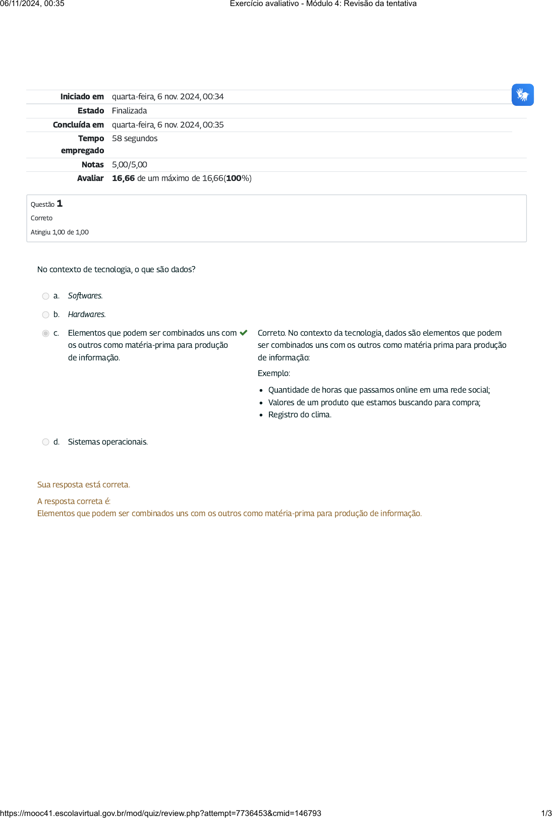 Iniciado em quarta-feira, 6 nov. 2024, 00:34 Estado Finalizada Concluída em quarta-feira, 6 nov. 2024, 00:35 Tempo empregado 58 segundos Notas 5,00/5,00 Avaliar 16,66 de um máximo de 16,66(100%) Questão 1 Correto Atingiu 1,00 de 1,00 No contexto de tecnologia, o que são dados? a. So�wares. b. Hardwares. c. Elementos que podem ser combinados uns com os outros como matéria-prima para produção de informação. Correto. No contexto da tecnologia, dados são elementos que podem ser combinados uns com os outros como matéria prima para produção de informação: Exemplo: Quantidade de horas que passamos online em uma rede social; Valores de um produto que estamos buscando para compra; Registro do clima. d. Sistemas operacionais. Sua resposta está correta. A resposta correta é: Elementos que podem ser combinados uns com os outros como matéria-prima para produção de informação. 06/11/2024, 00:35 Exercício avaliativo - Módulo 4: Revisão da tentativa https://mooc41.escolavirtual.gov.br/mod/quiz/review.php?attempt=7736453&cmid=146793 1/3 Questão 2 Correto Atingiu 1,00 de 1,00 Questão 3 Correto Atingiu 1,00 de 1,00 Indique uma circunstância de vazamento de dados: a. Um colaborador acessou informações restritas apenas com autorização e seguindo as políticas de segurança. b. Um hacker coletou informações pessoais de clientes de um banco, sem permissão, e as divulgou on-line. Correto. O vazamento de dados é quando informações con�denciais ou privadas de uma pessoa, empresa ou organização são acidentalmente ou intencionalmente expostas ao público ou a pessoas não autorizadas. c. Um sistema de backup foi ativado automaticamente para restaurar dados após uma falha de servidor. d. Um usuário alterou sua senha de forma segura após um aviso de política de segurança da empresa. Sua resposta está correta. A resposta correta é: Um hacker coletou informações pessoais de clientes de um banco, sem permissão, e as divulgou on-line. É um dos riscos de quando misturamos dados corporativos com dados pessoais: a. Phishing. Correto. Clicando em um link contaminado por um phishing você pode contaminar seu email pessoal e corporativo. b. Ter uma conta separada. c. Ter um per�l separado para o trabalho. d. Alertas e noti�cações. Sua resposta está correta. A resposta correta é: Phishing. 06/11/2024, 00:35 Exercício avaliativo - Módulo 4: Revisão da tentativa https://mooc41.escolavirtual.gov.br/mod/quiz/review.php?attempt=7736453&cmid=146793 2/3 Questão 4 Correto Atingiu 1,00 de 1,00 Questão 5 Correto Atingiu 1,00 de 1,00 Ao criar um login de acesso, como evitar uma senha preguiçosa (fraca)? a. Usar palavras não encontradas em dicionário e combinar números aleatórios, sem sequência ou signi�cado pessoal. Correto. Recomenda-se criar senhas fortes, que não sejam palavras encontradas em dicionário e que não possuam uma sequência de número previsíveis. Para números, evitar sequências ou aqueles que possuam relação direta com você, como sua data de aniversário ou placa de seu carro. b. Criar senha com uma data de nascimento conhecida do usuário. c. Criar senha com nomes de familiares. d. Ter a mesma senha para várias contas. Sua resposta está correta. A resposta correta é: Usar palavras não encontradas em dicionário e combinar números aleatórios, sem sequência ou signi�cado pessoal. É uma consequência quando acontece um vazamento de dados em uma empresa: a. Perda de con�ança de clientes ou usuários. Correto. Uma das principais consequências quando acontecem vazamentos de dados em uma empresa é a perda de con�ança dos clientes ou usuário podendo até mesmo prejudicar a imagem da instituição. b. Consciência de segurança da informação. c. Atualizações e Patches. d. Firewall e Antivírus. Sua resposta está correta. A resposta correta é: Perda de con�ança de clientes ou usuários. ◄ Conteúdo do módulo 4 Seguir para... Conteúdo do módulo 5 ► 06/11/2024, 00:35 Exercício avaliativo - Módulo 4: Revisão da tentativa https://mooc41.escolavirtual.gov.br/mod/quiz/review.php?attempt=7736453&cmid=146793 3/3 https://mooc41.escolavirtual.gov.br/mod/url/view.php?id=146792&forceview=1 https://mooc41.escolavirtual.gov.br/mod/url/view.php?id=146794&forceview=1