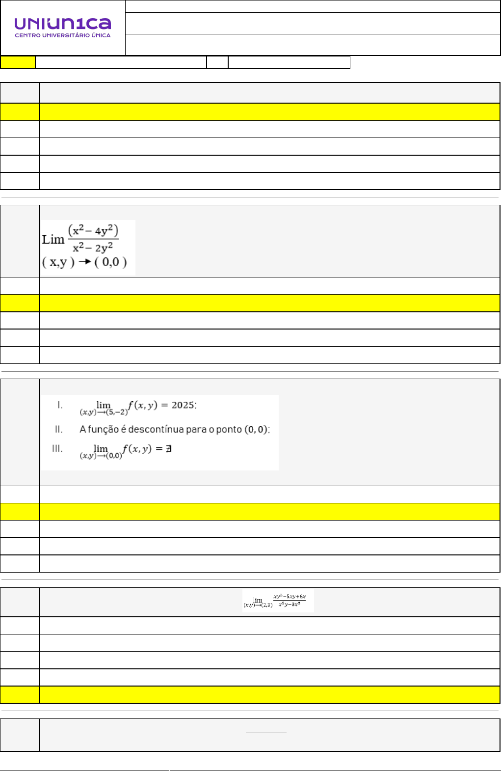 001 Seja a função f ( x , y ) = x2 + y2 , o valor de f ( 1 , 2 ) é :