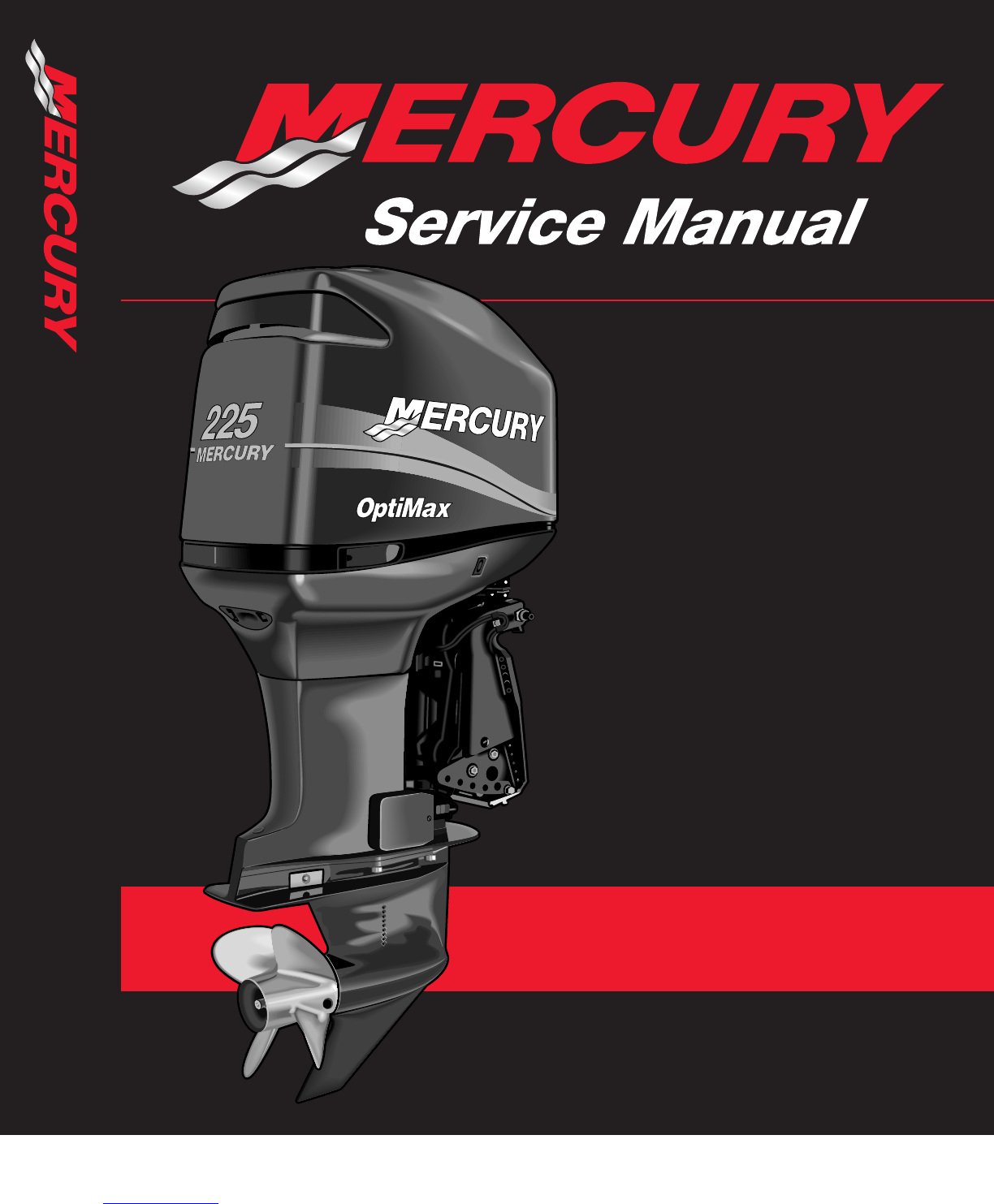 ©2000, Mercury Marine Printed in U.S.A. 90-859769R1 AUGUST 2000 200/225 OptiMax Direct Fuel Injection Starting Model Year 2000 Starting Serial Number OG960500 Starting M odel Year 2000 Starting S/N OG960500 200/225 OptiM ax Downloaded from www.Manualslib.com manuals search engine http://www.manualslib.com/ 90-859769R1 DECEMBER 2000 Page i Notice Throughout this publication, “Dangers”, “Warnings” and “Cautions” (accompanied by the In- ternational HAZARD Symbol ) are used to alert the mechanic to special instructions con- cerning a particular service or operation that may be hazardous if performed incorrectly or carelessly. OBSERVE THEM CAREFULLY! These “Safety Alerts” alone cannot eliminate the hazards that they signal. Strict compliance to these special instructions when performing the service, plus “Common Sense” operation, are major accident prevention measures. DANGER DANGER - Imm ediate hazards which WILL result in severe personal injury or death. WARNING WARNING - Hazards or unsafe practices which COULD result in severe personal in- jury or death. CAUTION Hazards or unsafe practices which could result in minor personal injury or product or property damage. Notice to Users of This Manual This service manual has been written and published by the Service Department of Mercury Marine to aid our dealers’ mechanics and company service personnel when servicing the products described herein. It is assumed that these personnel are familiar with the servicing procedures of these prod- ucts, or like or similar products manufactured and marketed by Mercury Marine, that they have been trained in the recommended servicing procedures of these products which in- cludes the use of mechanics’ common hand tools and the special Mercury Marine or recom- mended tools from other suppliers. We could not possibly know of and advise the service trade of all conceivable procedures by which a service might be performed and of the possible hazards and/or results of each method. We have not undertaken any such wide evaluation. Therefore, anyone who uses a service procedure and/or tool, which is not recommended by the manufacturer, first must completely satisfy himself that neither his nor the products safety will be endangered by the service procedure selected. All information, illustrations and specifications contained in this manual are based on the latest product information available at the time of publication. As required, revisions to this manual will be sent to all dealers contracted by us to sell and/or service these products. It should be kept in mind, while working on the product, that the electrical system and ignition system are capable of violent and damaging short circuits or severe electrical shocks. When performing any work where electrical terminals could possibly be grounded or touched by the mechanic, the battery cables should be disconnected at the battery. Any time the intake or exhaust openings are exposed during service they should be covered to protect against accidental entrance of foreign material which could enter the cylinders and cause extensive internal damage when the engine is started. Downloaded from www.Manualslib.com manuals search engine http://www.manualslib.com/ Page ii 90-859769R1 DECEMBER 2000 It is important to note, during any maintenance procedure replacement fasteners must have the same measurements and strength as those removed. Numbers on the heads of the met- ric bolts and on the surfaces of metric nuts indicate their strength. American bolts use radial lines for this purpose, while most American nuts do not have strength markings. Mis- matched or incorrect fasteners can result in damage or malfunction, or possibly personal injury. Therefore, fasteners removed should be saved for reuse in the same locations when- ever possible. Where the fasteners are not satisfactory for re-use, care should be taken to select a replacement that matches the original. Cleanliness and Care of Outboard Motor A marine power product is a combination of many machined, honed, polished and lapped surfaces with tolerances that are measured in the ten thousands of an inch/mm. When any product component is serviced, care and cleanliness are important. Throughout this manu- al, it should be understood that proper cleaning, and protection of machined surfaces and friction areas is a part of the repair procedure. This is considered standard shop practice even if not specifically stated. Whenever components are removed for service, they should be retained in order. At the time of installation, they should be installed in the same locations and with the same mating surfaces as when removed. Personnel should not work on or under an outboard which is suspended. Outboards should be attached to work stands, or lowered to ground as soon as possible. We reserve the right to make changes to this manual without prior notification. Refer to dealer service bulletins for other pertinent information concerning the products de- scribed in this manual. Page Numbering Two number groups appear at the bottom of each page. The example below is self-explana- tory. EXAMPLE: 90-859769 R1 JULY 2000 LOWER UNIT - 6A-7 Revision No. 1 Month of Printing Year of Printing Section Description Section Number Part of Section Letter Page Number Downloaded from www.Manualslib.com manuals search engine http://www.manualslib.com/ 1 2 3 4 5 6 7 General Information & Specifications Electrical Fuel System Powerhead Mid-Section Gear Housing Attachment/Control Linkage Color Diagrams 8 90-859769R1 DECEMBER 2000 Page iii Service Manual Outline Section 1 - General Information & Specifications A - Specifications B - Maintenance C - General Information D - Outboard Installation Section 2 - Electrical A - Ignition B - Charging & Starting System C - Timing, Synchronizing & Adjusting D - Wiring Diagrams Section 3 - Fuel System A - Fuel Pump B - Direct Fuel Injection C - Oil Injection D - Emissions Section 4 - Powerhead A 
