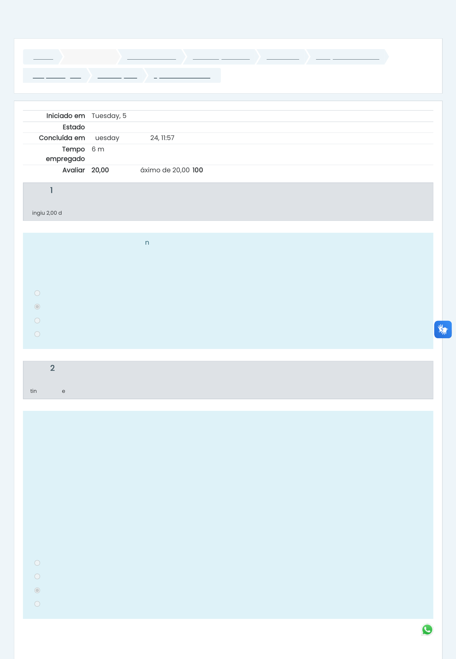 Painel Meus cursos CURSOS FUNEC Graduação - EAD Aluno EAD JUNÇÕES DE TURMA Fitopatologia II AVALIAÇÕES QUESTIONÁRIO 02 Iniciado em Tuesday, 5 Nov 2024, 11:50 Estado Finalizada Concluída em Tuesday, 5 Nov 2024, 11:57 Tempo empregado 6 minutos 22 segundos Avaliar 20,00 de um máximo de 20,00(100%) Questão 1 Completo Atingiu 2,00 de 2,00 Questão 2 Completo Atingiu 2,00 de 2,00 Os sintomas da bacteriose em mandioca (Manihot esculenta Crantz) caracterizam-se por manchas angulares, de aparência aquosa, nos folíolos, murcha das folhas e pecíolos, morte descendente e exsudação de goma nas hastes, além de necrose dos feixes vasculares, e morte da planta. O agente etiológico da bacteriose é: Escolha uma opção: a. Sphaceloma manihoticola. b. Xanthomonas campestris pv. Manihotis. c. Phytophthora sp. d. Fusarium sp. As doenças bacterianas estão entre os principais problemas fitossanitários das hortaliças. Essas doenças podem ocorrer no campo ou após a colheita. Sobre essas doenças e seu controle, analise as proposições abaixo. 1) Algumas bactérias, como Fusarium oxysporum, são consideradas patógenos habitantes do solo. 2) O sintoma de murcha é um distúrbio no xilema em que a bactéria se multiplica após a penetração pelas raízes, prejudicando o movimento de água para as folhas. 3) A diversificação de lavouras com espécies de diferentes famílias botânicas reduz a população de bactérias fitopatogênicas presentes no solo. 4) A murcha bacteriana ou murchadeira (Ralstonia solanacearum) é uma das principais doenças da batata. Estão corretas: Escolha uma opção: a. 1, 3 e 4, apenas. b. 1, 2, 3 e 4. c. 2, 3 e 4, apenas. d. 1 e 2, apenas. 06/11/2024, 11:07 QUESTIONÁRIO 02 https://ava.funec.br/mod/quiz/review.php?attempt=683207&cmid=21525 1/4 https://ava.funec.br/my/ https://ava.funec.br/course/index.php?categoryid=10 https://ava.funec.br/course/index.php?categoryid=17 https://ava.funec.br/course/index.php?categoryid=19 https://ava.funec.br/course/index.php?categoryid=77 https://ava.funec.br/course/view.php?id=1636 https://ava.funec.br/course/view.php?id=1636#section-6 https://ava.funec.br/mod/quiz/view.php?id=21525 Questão 3 Completo Atingiu 2,00 de 2,00 Questão 4 Completo Atingiu 2,00 de 2,00 Questão 5 Completo Atingiu 2,00 de 2,00 O Decreto nº 24.114, de 12 de abril de 1934, aprova o regulamento de defesa sanitária vegetal. Nesse Decreto, o Art. 1 afirma que são proibidos, em todo o território nacional, a importação, o comércio, o trânsito e a exportação: Escolha uma opção: a. de plantas exóticas. b. de vegetais e partes de vegetais, como sejam: mudas, galhos, estacas, bacélos, frutos, sementes, raízes, tubérculos, bulbos, rizomas, folhas e flores, quando portadores de doenças ou pragas perigosas. c. de caixas, sacos e outros artigos de acondicionamento, que tenham servido ao transporte de produtos de origem animal. d. de insetos vivos ou mortos, ácaros vivos ou mortos, nematoides e outros parasitos nocivos às plantas, vivos ou mortos. o Sobre o trânsito de vegetais com potencial disseminar pragas, pode-se afirmar que: Escolha uma opção: a. A PTV será fundamentada na certificação fitossanitária de origem (CFO) ou na certificação fitossanitária de origem consolidada (CFOC). b. Não há previsão para dispensa de PTV. c. A PTV é um documento que independe de demais certificações para a sua emissão. d. A PTV só será requerida quando em caso de exportação/importação, sendo, portanto, dispensada para transito em território nacional. Sobre o Certificado Fitossanitário de Origem – CFO e o Certificado Fitossanitário de Origem Consolidado – CFOC, analise a sentença abaixo: O CFO é o documento emitido na origem, unidade de produção, para atestar a condição fitossanitária da partida de plantas ou de produtos vegetais de acordo com as normas vigentes (1ª parte). Já o CFOC se diferencia do CFO, pois a origem é na unidade de consolidação (2ª parte). Ambos certificados fundamentam a emissão da Permissão de Trânsito de Vegetais para comprovar a origem da partida de plantas ou de produtos vegetais de Área Livre de Praga, de Local Livre de Praga, de Sistema de Mitigação de Riscos de Praga ou de Área de Baixa Prevalência de Praga, reconhecidos pelo MAPA (3ª parte). Quais partes estão corretas? Escolha uma opção: a. Apenas a 1ª parte. b. Apenas a 2ª e a 3ª partes. c. Apenas a 3ª parte. d. Todas as partes. 06/11/2024, 11:07 QUESTIONÁRIO 02 https://ava.funec.br/mod/quiz/review.php?attempt=683207&cmid=21525 2/4 Questão 6 Completo Atingiu 2,00 de 2,00 Questão 7 Completo Atingiu 2,00 de 2,00 Questão 8 Completo Atingiu 2,00 de 2,00 A umidade do ar é imprescindível a vida porém, quando ocorre um elevado teor de umidade no ar afeta o estado fitossanitário da cultura. Assinale a alternativa CORRETA que apresenta problemas fitossanitários a cultura causada pelo elevado teor de umidade no ar. Escolha uma opção: a. Bactérias fitopatogênicos e alguns insetos. b. Ataque de fungos e manifestação de ácaros. c. Ataque de fungos e bactérias fitopatogênicos. d. Manifestação de ácaros e alguns insetos. Analise as afirmativas a seguir: I. As doenças de espiga de milho mais comuns são as podridões e a fusarium. Em geral, essas doenças podem ser combatidas a partir do aumento da taxa de nitrogênio e redução da drenagem do solo. Evitar a rotação de culturas também é uma prática recomendável. II. Uma das recomendações para promover a saúde da lavoura de milho inclui realizar o plantio em época adequada, de modo a evitar que os períodos críticos para a cultura coincidam com condições ambientais mais favoráveis ao desenvolvimento de doenças. Escolha uma opção: a. A afirmativa II é verdadeira, e a I é falsa. b. As duas afirmativas são verdadeiras. c. A afirmativa I é verdadeira, e a II é falsa. d. As duas afirmativas são falsas. O Milho é cultivado em quase todos os países