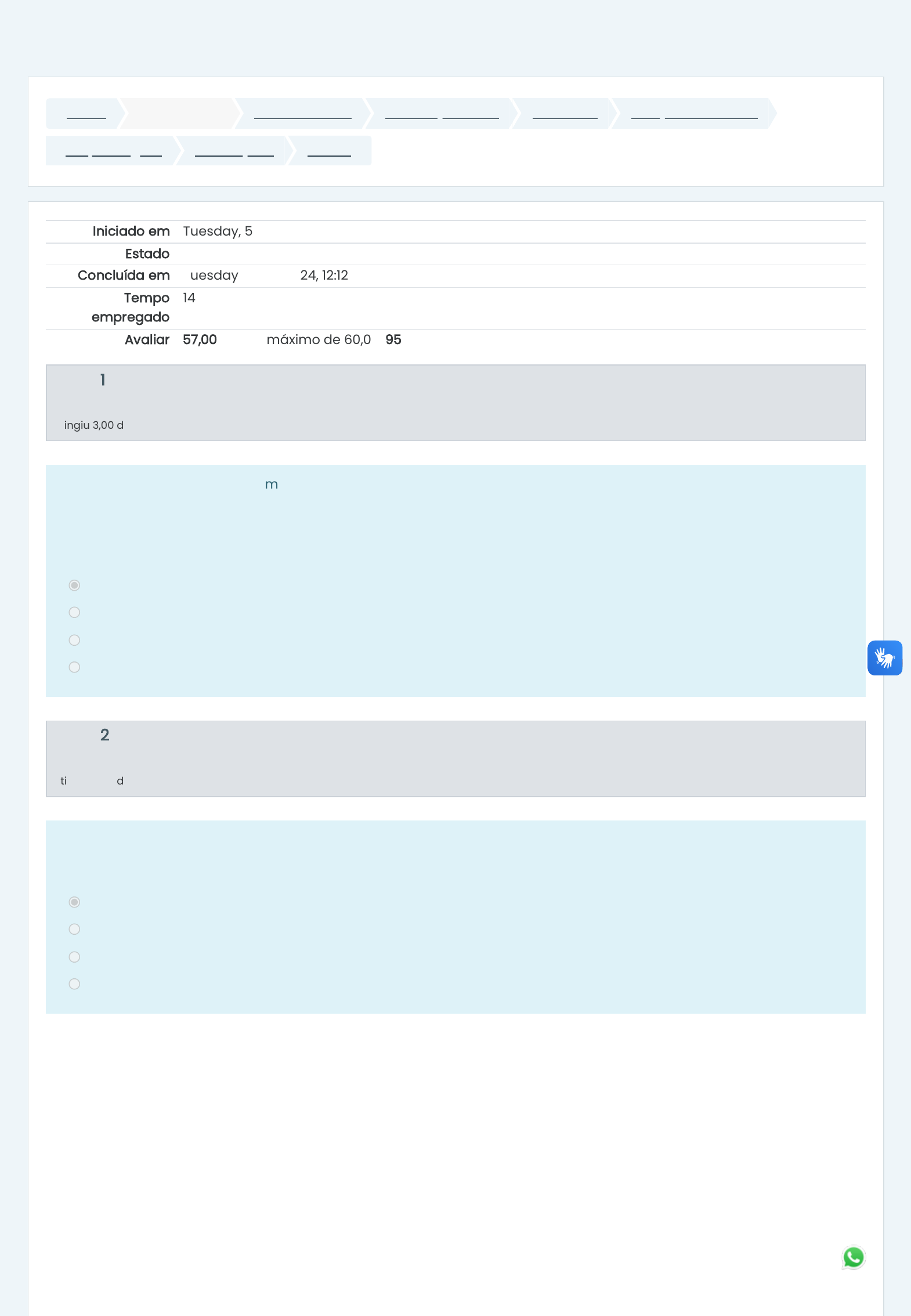 Painel Meus cursos CURSOS FUNEC Graduação - EAD Aluno EAD JUNÇÕES DE TURMA Fitopatologia II AVALIAÇÕES PROVA Iniciado em Tuesday, 5 Nov 2024, 11:57 Estado Finalizada Concluída em Tuesday, 5 Nov 2024, 12:12 Tempo empregado 14 minutos 31 segundos Avaliar 57,00 de um máximo de 60,00(95%) Questão 1 Completo Atingiu 3,00 de 3,00 Questão 2 Completo Atingiu 3,00 de 3,00 O Míldio das cucurbitáceas é uma doença mais ou menos comum nas nossas culturas de pepino, melancia, melão e abóboras. Sua severidade, contudo, está sujeita às variações das condições ambientais que lhe são favoráveis. O Míldio tem como agente causal: Escolha uma opção: a. Pseudoperonospora cubensis (Berk. Et Curtis) Rostowzew. b. Cladosporium cucumerinum. c. Pseudomonas lachrymans (EFS & Brian) Carsner. d. Mycosphaerella melonis (Pass.) Chiu et Walker. Sobre o sistema de classificação de fitopatogenias de McNew, podemos associar que: Escolha uma opção: a. Quanto menos específico a relação patógeno-hospedeiro, mais agressiva é a patogenia. b. Quanto mais específico a relação patógeno-hospedeiro, mais agressiva é a patogenia. c. Quanto mais específico a relação patógeno-hospedeiro, mais agressiva é a patogenia. d. Não há relação entre especificidade da relação patógeno-hospedeiro em relação a agressividade da patogenia. 06/11/2024, 11:08 PROVA https://ava.funec.br/mod/quiz/review.php?attempt=683211&cmid=21543 1/9 https://ava.funec.br/my/ https://ava.funec.br/course/index.php?categoryid=10 https://ava.funec.br/course/index.php?categoryid=17 https://ava.funec.br/course/index.php?categoryid=19 https://ava.funec.br/course/index.php?categoryid=77 https://ava.funec.br/course/view.php?id=1636 https://ava.funec.br/course/view.php?id=1636#section-6 https://ava.funec.br/mod/quiz/view.php?id=21543 Questão 3 Completo Atingiu 3,00 de 3,00 Questão 4 Completo Atingiu 3,00 de 3,00 Nematoides são organismos aquáticos que habitam diferentes espaços na crosta terrestre desde água doce, salgada e o solo. Quando no solo, se fitoparasitas, infectam as raízes e também a parte aérea de plantas cultivadas causando danos irreversíveis à produção. O manejo de nematoides envolve diversas estratégias que visam reduzir a população presente na área a níveis que não causem danos às plantas. Entre os principais gêneros que ocorrem em áreas de produção de grãos e fibras no cerrado estão Meloidogyne incognita, Pratylenchus spp, Heterodera glycines e Rotylenchulus reniformis que são conhecidos, sobretudo, pelos sintomas característicos que causam nas raízes e pelo tipo de sintoma ou estrutura que produz, respectivamente: Escolha uma opção: a. Nematoide de galhas, nematoide das lesões radiculares, nematoide do cisto e nematoide reniforme. b. Nematoide do cisto, nematoide reniforme, nematoide cavernícola e nematoide das lesões radiculares. c. Nematoide de galhas, nematoide de cisto, nematoide das lesões radiculares e nematoide reniforme. d. Nematoide cavernícola, nematoide de galhas, nematoide do cisto e nematoide das lesões radiculares. É considerada uma Praga Quarentenária Escolha uma opção: a. todo organismo de natureza animal e/ou vegetal que, estando presente em outros países ou regiões, sem controle permanente, constitui ameaça à economia agrícola do país ou região importadora exposta. b. todo organismo de natureza animal e/ou vegetal que, estando presente em outros países ou regiões, mesmo sob controle permanente, constitui ameaça à economia agrícola do país ou região importadora exposta. c. todo organismo de natureza animal e/ou vegetal que, estando presente em outros países ou regiões, sem controle permanente, constitui ameaça à economia agrícola do país ou região exportadora exposta. d. todo organismo de natureza vegetal que, estando presente em outras regiões do país, mesmo sob controle permanente, constitui ameaça à produção agrícola do país ou região exportadora exposta. 06/11/2024, 11:08 PROVA https://ava.funec.br/mod/quiz/review.php?attempt=683211&cmid=21543 2/9 Questão 5 Completo Atingiu 3,00 de 3,00 Questão 6 Completo Atingiu 3,00 de 3,00 Questão 7 Completo Atingiu 3,00 de 3,00 Diversos critérios, baseados no hospedeiro e/ou no agente causal, têm sido usados para classificar doenças de plantas. Considerando que os processos vitais podem sofrer interferências provocadas por diferentes patógenos, os grupos de doenças existentes são: Escolha uma opção: a. Grupo I – Doenças que destroem os órgãos aéreos; Grupo II – Doenças que causam danos em folhas; Grupo III – Doenças que danificam os órgãos subterrâneos; Grupo IV – Doenças que atacam as flores; Grupo V – Doenças que interferem na respiração celular; Grupo VI – Doenças que alteram a produção de hormônios. b. Grupo I – Doenças que destroem as folhas; Grupo II – Doenças que causam danos em caules; Grupo III – Doenças que danificam as raízes; Grupo IV – Doenças que atacam os frutos; Grupo V – Doenças que interferem no florescimento; Grupo VI – Doenças que alteram a fotossíntese. c. Grupo I – Doenças que destroem os órgãos de armazenamento; Grupo II – Doenças que causam danos em plântulas; Grupo III – Doenças que danificam as raízes; Grupo IV – Doenças que atacam o sistema vascular; Grupo V – Doenças que interferem na fotossíntese; Grupo VI – Doenças que alteram o aproveitamento das substâncias fotossintetizadas. d. Grupo I – Doenças que destroem os órgãos de reprodução; Grupo II – Doenças que causam danos em folhosas; Grupo III – Doenças que danificam as raízes; Grupo IV – Doenças que atacam os frutos; Grupo V – Doenças que interferem na fotossíntese; Grupo VI – Doenças que alteram o aproveitamento das substâncias fotoassimiladas. Fitonematoides podem apresentar, quando presentes em um cultivo, sintomas na planta hospedeira, bem como sintomas de campo. Sobre estes últimos,