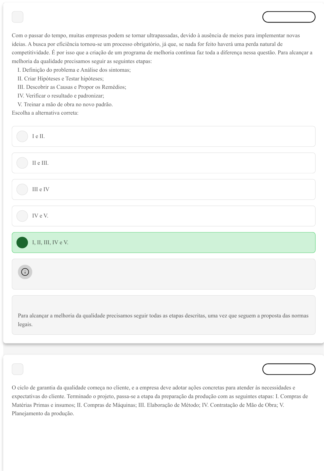 A B C D E 1 Marcar para revisão Com o passar do tempo, muitas empresas podem se tornar ultrapassadas, devido à ausência de meios para implementar novas ideias. A busca por eficiência tornou-se um processo obrigatório, já que, se nada for feito haverá uma perda natural de competitividade. É por isso que a criação de um programa de melhoria contínua faz toda a diferença nessa questão. Para alcançar a melhoria da qualidade precisamos seguir as seguintes etapas: I. Definição do problema e Análise dos sintomas; II. Criar Hipóteses e Testar hipóteses; III. Descobrir as Causas e Propor os Remédios; IV. Verificar o resultado e padronizar; V. Treinar a mão de obra no novo padrão. Escolha a alternativa correta: I e II. II e III. III e IV IV e V. I, II, III, IV e V. Questão não respondida Opa! A alternativa correta é a letra E. Confira o gabarito comentado! Gabarito Comentado Para alcançar a melhoria da qualidade precisamos seguir todas as etapas descritas, uma vez que seguem a proposta das normas legais. 2 Marcar para revisão O ciclo de garantia da qualidade começa no cliente, e a empresa deve adotar ações concretas para atender às necessidades e expectativas do cliente. Terminado o projeto, passa-se a etapa da preparação da produção com as seguintes etapas: I. Compras de Matérias Primas e insumos; II. Compras de Máquinas; III. Elaboração de Método; IV. Contratação de Mão de Obra; V. Planejamento da produção. A B C D E A B C D E I. II. III e IV. IV e V. I, II, III, IV e V. Questão não respondida Opa! A alternativa correta é a letra E. Confira o gabarito comentado! Gabarito Comentado Terminado o projeto, passa-se a etapa da preparação da produção com as seguintes etapas: Compras de Matérias Primas e insumos; Compras de Máquinas; Elaboração de Método; Contratação de Mão de Obra; Planejamento da produção. 3 Marcar para revisão A quantificação dos custos relativos à qualidade é extremamente útil para identificar se o problema é relevante ou não. Os gerentes avaliam os projetos selecionados baseados em critérios de prioridade como: - Estimativa de redução anual de custos; - Estimativa dos investimentos necessários em instalações e despesas; - Retorno sobre o investimento. I. I e II I, II e III I e III II e III. Questão não respondida Opa! A alternativa correta é a letra C. Confira o gabarito comentado! A B C D E A B Gabarito Comentado Os gerentes avaliam os projetos selecionados baseados em critérios de prioridade como: Estimativa de redução anual de custos; estimativa dos investimentos necessários em instalações e despesas; Retorno sobre o investimento. 4 Marcar para revisão A quantificação dos custos relativos à qualidade é extremamente útil para identificar se o problema é relevante ou não. O princípio de Pareto permite identificar e separar os poucos processos vitais dos triviais. Vitais dos triviais. Rápidos dos demorados. Fáceis dos difíceis. Grandes dos pequenos. Rotineiros das tarefas. Questão não respondida Opa! A alternativa correta é a letra A. Confira o gabarito comentado! Gabarito Comentado O princípio de Pareto permite identificar e separar os poucos processos vitais dos triviais. 5 Marcar para revisão O projeto de fabricação do produto deve ser feito de tal maneira a incorporar a percepção de várias áreas da empresa como: vendas, marketing, engenharia de produto, engenharia de processo, produção, contabilidade e reciclagem do produto pós-uso. Este procedimento evita projetos complexos e difíceis de serem fabricados e que podem resultar em produtos defeituosos. A garantia de qualidade é incorporada já na fase de: Inspeção. Desenvolvimento de projeto. C D E A B C D E Garantia da Qualidade. Abordagem Estratégica da Qualidade. Seis sigma. Questão não respondida Opa! A alternativa correta é a letra B. Confira o gabarito comentado! Gabarito Comentado O projeto de fabricação do produto deve ser feito de tal maneira a incorporar a percepção de várias áreas da empresa como: vendas, marketing, engenharia de produto, engenharia de processo, produção, contabilidade e reciclagem do produto pós-uso. Este procedimento evita projetos complexos e difíceis de serem fabricados e que podem resultar em produtos defeituosos. A garantia de qualidade é incorporada já na fase de desenvolvimento de projeto. 6 Marcar para revisão Controlar a qualidade em um processo é adotar o gerenciamento pelo ciclo PDCA. O controle da qualidade é conduzido como objetivo de eliminar a causa fundamental dos problemas e depende da habilidade dos funcionários em analisar os processos produtivos. Uma jornada importante que parte do problema para solução é conhecida como Jornada: Diagnóstico e da Solução. Realimentação do cliente. Medição de indicadores financeiros. Pesquisa de satisfação de fornecedor. Entrega do produto. Questão não respondida Opa! A alternativa correta é a letra A. Confira o gabarito comentado! Gabarito Comentado Uma jornada importante que parte do problema para solução é conhecida como Jornada do Diagnóstico e da Solução. A B C D E A B C 7 Marcar para revisão PDCA é um método iterativo de gestão de quatro passos, utilizado para o controle e melhoria contínua de processos e produtos. No ciclo PDCA o termo Execução das tarefas com previsto no plano está associado com: Planos, metas e métodos. Comparar metas com resultados. Treinamento da mão de obra, escolha fornecedores e coleta de dados. Identificar desvios e treinamento. Fazer as ações corretivas. Questão não respondida Opa! A alternativa correta é a letra C. Confira o gabarito comentado! Gabarito Comentado No ciclo PDCA o termo Execução das tarefas com previsto no plano está associado com: Treinamento da mão de obra, escolha fornecedores e coleta de dados. O ciclo PDCA é um método de gestão que consiste em quatro etapas: planejar, fazer, checar e agir. A etapa de fazer consiste em exec