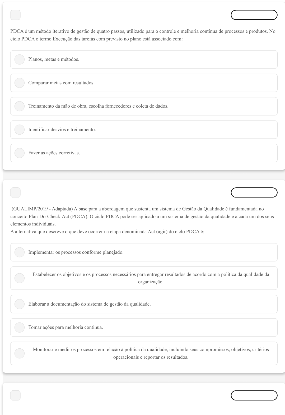 A B C D E A B C D E 1 Marcar para revisão PDCA é um método iterativo de gestão de quatro passos, utilizado para o controle e melhoria contínua de processos e produtos. No ciclo PDCA o termo Execução das tarefas com previsto no plano está associado com: Planos, metas e métodos. Comparar metas com resultados. Treinamento da mão de obra, escolha fornecedores e coleta de dados. Identificar desvios e treinamento. Fazer as ações corretivas. 2 Marcar para revisão (GUALIMP/2019 - Adaptada) A base para a abordagem que sustenta um sistema de Gestão da Qualidade é fundamentada no conceito Plan-Do-Check-Act (PDCA). O ciclo PDCA pode ser aplicado a um sistema de gestão da qualidade e a cada um dos seus elementos individuais. A alternativa que descreve o que deve ocorrer na etapa denominada Act (agir) do ciclo PDCA é: Implementar os processos conforme planejado. Estabelecer os objetivos e os processos necessários para entregar resultados de acordo com a política da qualidade da organização. Elaborar a documentação do sistema de gestão da qualidade. Tomar ações para melhoria contínua. Monitorar e medir os processos em relação à política da qualidade, incluindo seus compromissos, objetivos, critérios operacionais e reportar os resultados. 3 Marcar para revisão cogeplan Realce cogeplan Realce A B C D E A B C D E No planejamento da qualidade procuramos antecipar os desejos dos cientes incorporando-os nas especificações. Para tal é necessário entender: O processo de produção, distribuição e custos. O processo de distribuição, reclamações e legislação O processo de compra, métodos de produção e assistência técnica As necessidades e expectativas dos clientes. O processo de compras, desejos dos clientes e reciclagem após uso. 4 Marcar para revisão Algumas características do mercado são: menor tempo entre a descoberta de novas tecnologias e o desenvolvimento de novos produtos; ciclo de vida do produto cada vez menor, pois o produto é substituído por outro com tecnologia mais avançada. I-Rápidas no desenvolvimento dos produtos; II-Objetivas na tradução das necessidades e expectativas dos clientes; III-Eficazes e eficientes nos produtos e processos produtivos; I e III. I, II e III. 5 Marcar para revisão Para detectarmos as causas que produzem efeitos indesejados nos processos produtivos, utilizamos a ferramenta_________. Escolha a alternativa correta: cogeplan Realce cogeplan Realce A B C D E A B C D E A B Pareto. Levantamento de dados. PDCA. Espinha de peixe. Diagrama de dispersão. 6 Marcar para revisão Julgue os itens a seguir, com relação aos prêmios da qualidade no mundo. O prêmio Deming foi instituído no: EUA China. Alemanha Brasil Japão. 7 Marcar para revisão O Brasil segue o exemplo dos sistemas mais modernos, nos quais somente um organismo acreditador por país ou economia é reconhecido, e há uma clara separação entre as atividades de certificação e de acreditação. No Brasil, o único organismo acreditador reconhecido pelo Sistema Nacional de Metrologia, Normalização e Qualidade Industrial denomina-se IPEM. ABNT. cogeplan Realce cogeplan Realce C D E A B C D E A B C INMETRO. SINMETRO. CONMETRO. 8 Marcar para revisão Em meados do século passado, representantes de vinte e cinco países decidiram fundar a International Organization for Standardization, com o objetivo de promover o desenvolvimento da normalização de atividades industriais. A criação da ISO possibilitou o intercâmbio econômico, científico e tecnológico. Qual é o significado da sigla ISO? Escolha a alternativa correta. Instituição Social das Organizações. Instituição Social das Organizações Ambientais. Instituição Social das Organizações Socioambientais. Organização Internacional de Normalização. Organização Internacional de Normalização Ambiental. 9 Marcar para revisão O ciclo de garantia da qualidade começa no cliente, e a empresa deve adotar ações concretas para atender às necessidades e expectativas do cliente. Terminado o projeto, passa-se a etapa da preparação da produção com as seguintes etapas: I. Compras de Matérias Primas e insumos; II. Compras de Máquinas; III. Elaboração de Método; IV. Contratação de Mão de Obra; V. Planejamento da produção. I. II. III e IV. cogeplan Realce cogeplan Realce D E A B C D E IV e V. I, II, III, IV e V. 10 Marcar para revisão Controle de qualidade é um sistema que permite entender o padrão de qualidade oferecido de acordo com parâmetros predefinidos. Quando se atua nos processos da empresa praticando o controle da qualidade, a qualidade de conformidade irá melhorar a redução dos defeitos e consequentemente a redução de: Inspeção de recebimento. Custos. Inspeção no cliente. Atividades que agregam valor. Controle de processo. cogeplan Realce cogeplan Realce