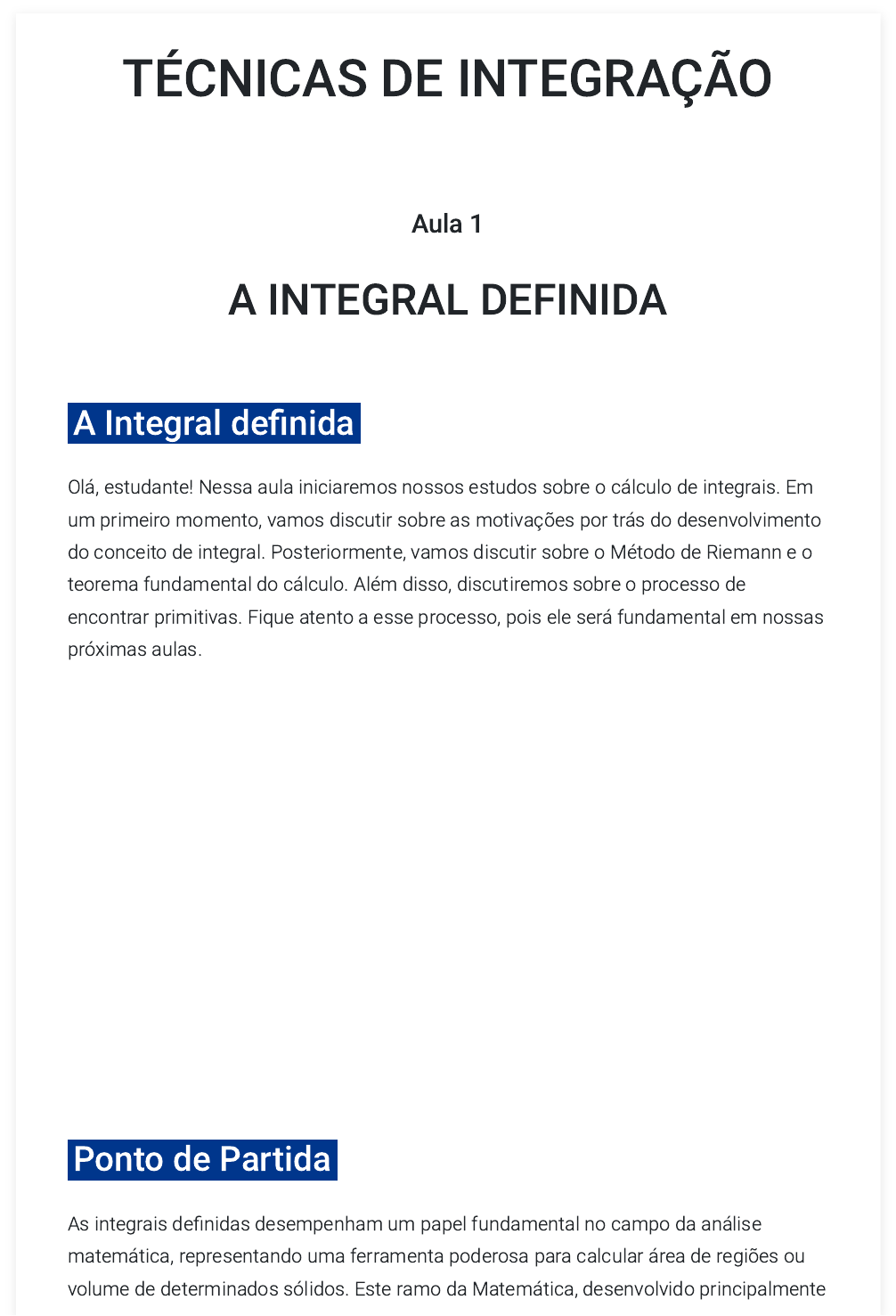 TÉCNICAS DE INTEGRAÇÃO Aula 1 A INTEGRAL DEFINIDA A Integral definida Olá, estudante! Nessa aula iniciaremos nossos estudos sobre o cálculo de integrais. Em um primeiro momento, vamos discutir sobre as motivações por trás do desenvolvimento do conceito de integral. Posteriormente, vamos discutir sobre o Método de Riemann e o teorema fundamental do cálculo. Além disso, discutiremos sobre o processo de encontrar primitivas. Fique atento a esse processo, pois ele será fundamental em nossas próximas aulas. Ponto de Partida As integrais definidas desempenham um papel fundamental no campo da análise matemática, representando uma ferramenta poderosa para calcular área de regiões ou volume de determinados sólidos. Este ramo da Matemática, desenvolvido principalmente por Isaac Newton e Gottfried Leibniz no século XVII, revolucionou a maneira como compreendemos e modelamos fenômenos que variam de forma contínua. Vamos começar nossa exploração sobre integrais ao compreender a interpretação geométrica na aplicação da integral de Riemann. Além disso, exploraremos as integrais definidas, o teorema fundamental do cálculo e as antiderivadas, também conhecidas como integrais primitivas. O entendimento desses conceitos fundamentais nas integrais é crucial para resolver problemas em diversas áreas do nosso dia a dia. Para que você compreenda como podemos utilizar esses conceitos, suponha que você esteja estudando sobre o cálculo de integrais e resolveu fazer um comparativo dos resultados encontrados ao calcular uma integral por meio do método de Riemann e utilizando o teorema fundamental do cálculo. A função a ser estudada é no intervalo e, para utilizar o método de Riemann, você decidiu dividir a região abaixo da curva de em 4 retângulos. Qual é o resultado utilizando o método de Riemann e utilizando o Teorema de Cálculo? Como você poderá resolver esse problema? Vamos iniciar nossos estudos? Vamos Começar! Primeiramente, já pensou em como calcular a área abaixo de uma curva? Se essa curva for reta, é fácil, pois basta relacionar com triângulos ou retângulos e fazer as relações adequadas, conforme exemplificado na Figura 1. Figura 1 | Exemplos de figuras com lados que são curvas retas. Fonte: Stewart, Clegg e Watson (2021, p. 342). Entretanto, não é tão fácil encontrar a área de uma região com lados curvos (como na Figura 2). As tradicionais fórmulas de áreas não são úteis para determinar áreas em casos de figuras curvilíneas, sendo assim, são necessárias ferramentas mais elaboradas para chegar ao resultado pretendido. f(x) = x2 [0, 2] f(x) Figura 2 | Região delimitada pela função contínua f(x), pelas retas verticais x = a e x = b e pelo eixo x. Fonte: Stewart, Clegg e Watson (2021, p. 342). O matemático Riemann formulou um método para estimar áreas sob curvas, utilizando retângulos para preencher os espaços. Nessa abordagem, a altura de cada retângulo corresponde ao valor da função em um ponto específico e o comprimento da base pode variar. A soma de Riemann é uma aproximação da área abaixo de uma curva, alcançada ao dividir a região em múltiplos retângulos. Riemann concebeu a ideia de obter a área dividindo-a em retângulos, em que cada retângulo terá comprimento com tamanho , sendo que cada um teria uma altura , cada área seria a multiplicação entre o comprimento e a altura, isto é, . Assim, a área seria, aproximadamente, a soma das áreas desses retângulos, ou seja, , conforme, ilustra a figura 3. Figura 3 | Representação do método de Riemann dividindo a área em retângulos. Fonte: Stewart, Clegg e Watson (2021, p. 345). Pode surgir a dúvida sobre a quantidade de retângulos necessários para subdividir a área abaixo da curva. Para responder a essa indagação, é preciso analisar a Figura 4. Figura 4 | Aproximação da área pelo Método de Riemann com retângulos. Fonte: Stewart, Clegg e Watson (2021, p. 346). S n Δx = b−a n f(xi) Si = Δx ⋅ f(xi) S S = S1 + S2 + ⋯ + Sn Observe que a precisão da estimativa da área aumenta à medida que reduzimos o tamanho da base e, consequentemente, aumentamos o número de retângulos utilizados. Nesse sentido, quanto maior o número de retângulos, mais próxima será a estimativa da área total. Logo, “a área da região que está sob o gráfico de uma função contínua é o limite da soma das áreas dos retângulos aproximantes (STEWART; CLEGG; WATSON, 2021, p. 346), isto, Um ponto importante a ser destacado é que a fim de estimar a área sob o gráfico de , é possível criar somas inferiores ou superiores, conforme ilustra a Figura 5, selecionando pontos amostrais , de modo que represente o valor mínimo (ou máximo) de no i-ésimo subintervalo. Diante disso, podemos dizer que a área é o único número que é menor que todas as somas superiores e maior que todas as somas inferiores. Figura 5 | Somas inferiores e superiores. Fonte: Stewart, Clegg e Watson (2021, p. 347). Até este ponto, exploramos um método para calcular a área sob uma curva e você pode estar se questionando sobre a conexão desse tipo de problema com o estudo das integrais. Eles estão relacionados uma vez que, se temos uma função contínua definida em um intervalo , a integral definida de a é dada por: Se esse limite existir, dizemos que é integrável em (STEWART; CLEGG; WATSON, 2021). Segundo Stewart (2021), o símbolo foi introduzido pelo matemático Leibniz e representa um S alongado uma vez uma integral é um limite de somas. Na notação é denominado de integrando, e são os limites de integração, sendo o limite inferior e o limite superior e por enquanto o símbolo não possui um significado sozinho, ele apenas indica em relação a qual variável estamos realizando o processo de integração, que nesse caso é Por fim, denominamos de integração o processo de determinar integrais. Mas como podemos calcular uma integral? Será necessário resolver o 
