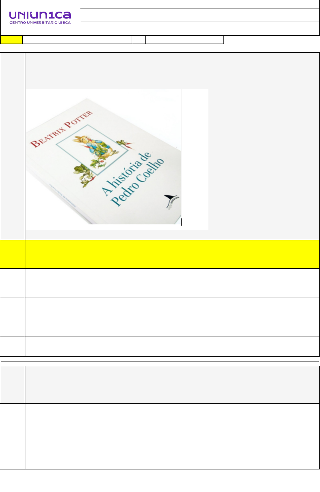 06/11/2024 15:52:44 1/5 REVISÃO DE SIMULADO Nome: JACQUELINE FERREIRA FARIAS Disciplina: Literatura Infantojuvenil Respostas corretas são marcadas em amarelo X Respostas marcardas por você. Questão 001 Outra forma de relação entre o texto verbal e visual definido por Golden (apud NIKOLAJEVA; SCOTT, 2011) é quando a ilustração reforça e elabora o texto. Com isso, analise a capa a seguir e, em seguida, escolha a alternativa que melhor conceitua esse tipo de integração palavra-imagem: X A) O texto verbal corresponde ao título e o texto visual equivale à ilustração do coelho. Logo, a imagem reforça e elabora o título, ao passo que a primeira não elabora uma narrativa, mas ilustra o personagem citado no texto verbal. B) Não há um tipo de relação palavra-imagem, pois tanto o texto verbal como o visual são representados na capa do livro, quando os tipos de interação verbal e visual apenas são considerados quando estão na parte interna do livro. C) Texto e imagem estabelecem uma relação simétrica, pois ambas linguagens expressam um tipo de narrativa tanto verbal como visual. D) Há uma narrativa elementar, representada pela ilustração, na qual o texto é seletivo, pois não oferece nenhum acréscimo de sentido. E) A narrativa principal é dada pelo texto verbal escrito, pois o título depende da palavra para transmitir sentido, enquanto a imagem não gera nenhum significado. Questão 002 Na tentativa de classificar as formas de interação entre o texto e a imagem, Nikolajeva e Scott (2011) trazem a perspectiva de diversos autores em torno do tema. A variedade de terminologias e conceitos ocorre devido à dinamicidade criativa que o livro ilustrado permite aos criadores. De modo que A) as classificações delimitadas pelos teóricos são uma tentativa de compreender os níveis de relação entre o texto e a imagem nesses livros destinados, usualmente, ao público adulto; e como isso contribui para a recepção da obra e desenrolar da narrativa. B) as classificações limitadas pelos teóricos não são uma tentativa de compreender os níveis de relação entre o texto e a imagem nesses livros destinados, usualmente, ao público infantil e juvenil; e como isso contribui para a recepção da obra e desenrolar da narrativa. 06/11/2024 15:52:44 2/5 C) as classificações delimitadas pelos teóricos são uma tentativa de compreender os níveis de relação entre o texto e a imagem nesses livros destinados, usualmente, ao público infantil e juvenil; e como isso contribui para a recepção da obra e alterando sua narrativa. X D) as classificações delimitadas pelos teóricos são uma tentativa de compreender os níveis de relação entre o texto e a imagem nesses livros destinados, usualmente, ao público infantil e juvenil; e como isso contribui para a recepção da obra e desenrolar da narrativa. E) as classificações delimitadas pelos filósofos são uma tentativa de compreender os níveis de relação entre o texto e a imagem nesses livros destinados, usualmente, ao público infantil e juvenil; e como isso contribui para a recepção da obra e desenrolar da narrativa. Questão 003 O significado do termo “infantil” remete a tudo aquilo que é relativo ou adequado às infâncias ou às crianças. Nesse sentido, é certo afirma que a literatura infantil é aquela que produz obras literárias apropriadas a esse universo. Desse modo, a definição que melhor se aplica à esta literatura, feita por Cademartori (2021), consiste na alternativa: A) “Sendo assim, o texto deve ser adequado à competência linguística da criança para ler os signos, assim como às suas experiências de vida.” X B) “A literatura infantil é um gênero literário definido pelo público a que se destina. Certos textos são considerados pelos adultos como sendo próprios à leitura pela criança e é, a partir desse juízo, que recebem a definição de gênero e passam a ocupar determinado lugar entre os demais livros.” C) “A mediação do professor é decisiva na relação que a criança irá estabelecer com a literatura infantil, pois a ele cabe escolher o livro, promover sua leitura e conversar a respeito na sala de aula.” D) “Um livro de literatura infantil, portanto, constitui uma forma de comunicação que prevê a faixa etária do possível leitor, atende aos seus interesses e respeita as suas possibilidades.” E) “Os principais traços do leitor implícito do texto infantil são: um leitor em formação e com vivências limitadas por força da idade.” Questão 004 O texto literário não se produz apenas a partir da palavra, ao passo que a ilustração, por exemplo, também transmite uma narrativa. Assim que ambas, em conjunto, podem criar outras dimensões de interpretação. Essa perspectiva colabora para que o professor desmistifique a noção de que a literatura se vale apenas da palavra escrita, ao passo que a imagem e demais elementos gráficos do livro (como o papel, as cores, o formato, entre outros aspectos) sejam vistos como produtores de significado da obra. A respeito do trecho acima, podemos concluir que: A) Em um texto literário a apenas palavras compõem a narrativa, mesmo utilizando vários elementos, só as palavras compõe o significado da obra. B) Em um texto literário a ilustração, as palavras e outros elementos compõem a narrativa. Esses elementos em conjunto podem criar dimensões de interpretação. Com isso, percebemos que são vários os elementos que compõe o significado da obra. Dentre todos esses elementos, a ilustração é sem dúvida o mais importante. X C) Em um texto literário a ilustração, as palavras e outros elementos compõem a narrativa. Esses elementos em conjunto podem criar dimensões de interpretação. Com isso, percebemos que são vários os elementos que compõe o significado da obra. 06/11/2024 15:52:44 3/5 D) Em um texto literário a ilustração, as palavras e outros elementos compõem a narrativa. Esses ele