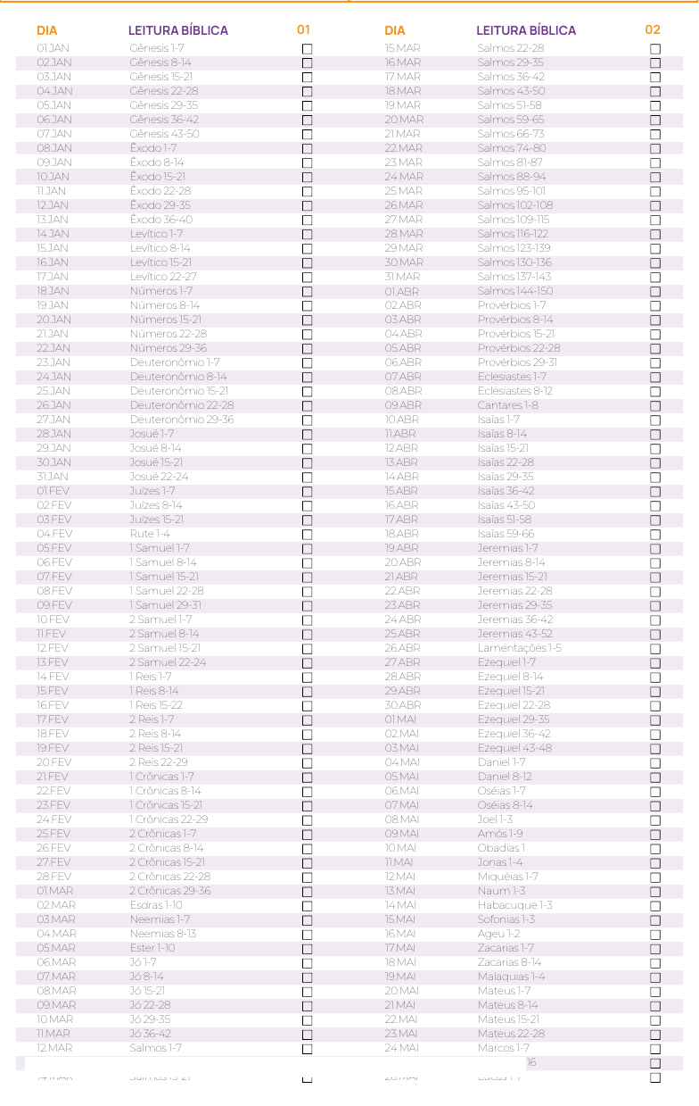 DIA LEITURA BÍBLICA 02.JAN Gênesis 8-14 03.JAN Gênesis 15-21 04.JAN Gênesis 22-28 05.JAN Gênesis 29-35 06.JAN Gênesis 36-42 07.JAN Gênesis 43-50 08.JAN Êxodo 1-7 09.JAN Êxodo 8-14 10.JAN Êxodo 15-21 11.JAN Êxodo 22-28 12.JAN Êxodo 29-35 13.JAN Êxodo 36-40 14.JAN Levítico 1-7 15.JAN Levítico 8-14 16.JAN Levítico 15-21 17.JAN Levítico 22-27 18.JAN Números 1-7 19.JAN Números 8-14 20.JAN Números 15-21 21.JAN Números 22-28 22.JAN Números 29-36 23.JAN Deuteronômio 1-7 24.JAN Deuteronômio 8-14 25.JAN Deuteronômio 15-21 26.JAN Deuteronômio 22-28 27.JAN Deuteronômio 29-36 28.JAN Josué 1-7 29.JAN Josué 8-14 30.JAN Josué 15-21 31.JAN Josué 22-24 01.FEV Juízes 1-7 02.FEV Juízes 8-14 03.FEV Juízes 15-21 04.FEV Rute 1-4 05.FEV 1 Samuel 1-7 06.FEV 1 Samuel 8-14 07.FEV 1 Samuel 15-21 08.FEV 1 Samuel 22-28 09.FEV 1 Samuel 29-31 10.FEV 2 Samuel 1-7 11.FEV 2 Samuel 8-14 12.FEV 2 Samuel 15-21 13.FEV 2 Samuel 22-24 14.FEV 1 Reis 1-7 15.FEV 1 Reis 8-14 16.FEV 1 Reis 15-22 17.FEV 2 Reis 1-7 18.FEV 2 Reis 8-14 19.FEV 2 Reis 15-21 20.FEV 2 Reis 22-29 21.FEV 1 Crônicas 1-7 22.FEV 1 Crônicas 8-14 23.FEV 1 Crônicas 15-21 24.FEV 1 Crônicas 22-29 25.FEV 2 Crônicas 1-7 26.FEV 2 Crônicas 8-14 27.FEV 2 Crônicas 15-21 28.FEV 2 Crônicas 22-28 01.MAR 2 Crônicas 29-36 02.MAR Esdras 1-10 03.MAR Neemias 1-7 04.MAR Neemias 8-13 05.MAR Ester 1-10 06.MAR Jó 1-7 07.MAR Jó 8-14 08.MAR Jó 15-21 09.MAR Jó 22-28 10.MAR Jó 29-35 11.MAR Jó 36-42 12.MAR Salmos 1-7 13.MAR Salmos 8-14 01.JAN Gênesis 1-7 14.MAR Salmos 15-21 DIA 01 DIA LEITURA BÍBLICA 16.MAR Salmos 29-35 17.MAR Salmos 36-42 18.MAR Salmos 43-50 19.MAR Salmos 51-58 20.MAR Salmos 59-65 21.MAR Salmos 66-73 22.MAR Salmos 74-80 23.MAR Salmos 81-87 24.MAR Salmos 88-94 25.MAR Salmos 95-101 26.MAR Salmos 102-108 27.MAR Salmos 109-115 28.MAR Salmos 116-122 29.MAR Salmos 123-139 30.MAR Salmos 130-136 31.MAR 01.ABR Salmos 137-143 Salmos 144-150 02.ABR Provérbios 1-7 03.ABR Provérbios 8-14 04.ABR Provérbios 15-21 05.ABR Provérbios 22-28 06.ABR Provérbios 29-31 07.ABR Eclesiastes 1-7 08.ABR Eclesiastes 8-12 09.ABR Cantares 1-8 10.ABR Isaías 1-7 11.ABR Isaías 8-14 12.ABR Isaías 15-21 13.ABR Isaías 22-28 14.ABR Isaías 29-35 15.ABR Isaías 36-42 16.ABR Isaías 43-50 17.ABR Isaías 51-58 18.ABR Isaías 59-66 19.ABR Jeremias 1-7 20.ABR Jeremias 8-14 21.ABR Jeremias 15-21 22.ABR Jeremias 22-28 23.ABR Jeremias 29-35 24.ABR Jeremias 36-42 25.ABR Jeremias 43-52 26.ABR Lamentações 1-5 27.ABR Ezequiel 1-7 28.ABR Ezequiel 8-14 29.ABR Ezequiel 15-21 30.ABR Ezequiel 22-28 01.MAI Ezequiel 29-35 02.MAI Ezequiel 36-42 03.MAI Ezequiel 43-48 04.MAI Daniel 1-7 05.MAI Daniel 8-12 06.MAI Oséias 1-7 07.MAI Oséias 8-14 08.MAI Joel 1-3 09.MAI Amós 1-9 10.MAI Obadias 1 11.MAI Jonas 1-4 12.MAI Miquéias 1-7 13.MAI Naum 1-3 14.MAI Habacuque 1-3 15.MAI Sofonias 1-3 16.MAI Ageu 1-2 17.MAI Zacarias 1-7 18.MAI Zacarias 8-14 19.MAI Malaquias 1-4 20.MAI Mateus 1-7 21.MAI Mateus 8-14 22.MAI Mateus 15-21 23.MAI Mateus 22-28 24.MAI Marcos 1-7 25.MAI Marcos 8-16 15.MAR Salmos 22-28 26.MAI Lucas 1-7 DIA 02 Conteúdo licenciado para Matheus Sousa Filié - 469.876.458-09 DIA LEITURA BÍBLICA 28.MAI Lucas 15-21 29.MAI Lucas 22-24 30.MAI João 1-7 31.MAI João 8-14 01.JUN João 15-21 02.JUN Atos 1-7 03.JUN Atos 8-14 04.JUN Atos 15-21 05.JUN Atos 22-28 06.JUN Romanos 1-7 07.JUN Romanos 8-16 08.JUN 1 Coríntios 1-7 09.JUN 1 Coríntios 8-16 10.JUN 2 Coríntios 1-7 11.JUN 2 Coríntios 8-13 12.JUN Gálatas 1-6 13.JUN Efésios 1-6 14.JUN Filipenses 1-4 15.JUN Colossenses 1-4 16.JUN 1 Tessalonicenses 1-5 17.JUN 2 Tessalonicenses 1-3 18.JUN 1 Timóteo 1-6 19.JUN Tito 1-3 20.JUN Filemon 1 21.JUN Hebreus 1-7 22.JUN Tiago 1-5 23.JUN 1 Pedro 1-5 24.JUN 2 Pedro 1-3 25.JUN 1 João 1 26.JUN 2 João 1 27.JUN 3 João 1 28.JUN Judas 1 29.JUN Apocalipse 1-7 30.JUN Apocalipse 8-14 01.JUL Apocalipse 15-22 27.MAI Lucas 8-14 DIA 03 Conteúdo licenciado para Matheus Sousa Filié - 469.876.458-09
