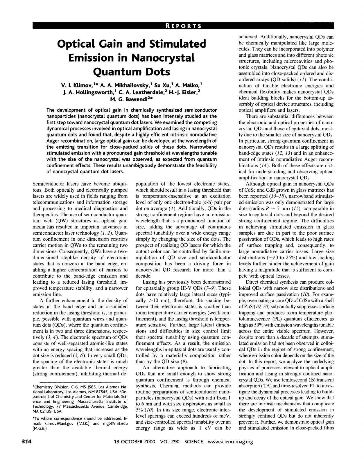 Optical Gain and Stimulated Emission in Nanocrystal Quantum Dots V. I. Klimov,'* A. A. Mikhailovsky,' Su Xu,' A. Malko,' J. A. Hollingsworth,' C. A. Leatherdale,' H.-J.Eisler,' M. C. ~awendi'* The development of optical gain in chemically synthesized semiconductor nanoparticles (nanocrystal quantum dots) has been intensely studied as the first step toward nanocrystal quantum dot lasers. We examined the competing dynamical processes involved in optical amplification and lasing in nanocrystal quantum dots and found that, despite a highly efficient intrinsic nonradiative Auger recombination, large optical gain can be developed at the wavelength of the emitting transition for close-packed solids of these dots. Narrowband stimulated emission with a pronounced gain threshold at wavelengths tunable with the size of the nanocrystal was observed, as expected from quantum confinement effects. These results unambiguously demonstrate the feasibility of nanocrystal quantum dot lasers. Semiconductor lasers have become ubiqui- tous. Both optically and electrically pumped lasers are widely used in fields ranging from telecommunications and information storage and processing to medical diagnostics and therapeutics. The use of semiconductor quan- tum well (QW) structures as optical gain media has resulted in important advances in semiconductor laser technology (1, 2). Quan- tum confinement in one dimension restricts carrier motion in QWs to the remaining two dimensions. Consequently, QWs have a two- dimensional steplike density of electronic states that is nonzero at the band edge. en- abling a higher concentration of carriers to contribute to the band-edge emission and leading to a reduced lasing threshold, im- proved temperature stability, and a narrower emission line. A further enhancement in the density of states at the band edge and an associated reduction in the lasing threshold is, in princi- ple, possible with quantum wires and quan- tum dots (QDs), where the quantum confine- ment is in two and three dimensions, respec- tively (3, 4). The electronic spectrum of QDs consists of well-separated atomic-like states with an energy spacing that increases as the dot size is reduced (5, 6). In very small QDs, the spacing of the electronic states is much greater than the available thermal energy (strong confinement), inhibiting thermal de- 'Chemistry Division, C-6, MS-1585, Los Alamos Na- tional Laboratory, Los Alamos, NM 87545, USA. *De- partment of Chemistry and Center for Materials Sci- ence and Engineering, Massachusetts Institute of Technology, 77 Massachusetts Avenue, Cambridge, MA 02139. USA. *To whom correspondence should be addressed. E- mail: klimov@lanl.gov ( V.I.K.) and mgb@mit.edu (M.G.B.) population of the lowest electronic states, which should result in a lasing threshold that is temperature-insensitive at an excitation level of only one electron-hole (e-h) pair per dot on average (4). Additionally, QDs in the strong confinement regime have an emission wavelength that is a pronounced function of size, adding the advantage of continuous spectral tunability over a wide energy range simply by changing the size of the dots. The prospect of realizing QD lasers for which the output color can be controlled by facile ma- nipulation of QD size and semiconductor composition has been a driving force in nanocrystal QD research for more than a decade. Lasing has previously been demonstrated for epitaxially group 111-V QDs (7-9). These dots have relatively large lateral sizes (typi- cally >10 nm); therefore, the spacing be- tween their electronic states is smaller than room temperature carrier energies (weak con- finement), and the lasing threshold is temper- ature sensitive. Further, large lateral dimen- sions and difficulties in size control limit their spectral tunability using quantum con- finement effects. As a result, the emission wavelengths in epitaxial dots are usually con- trolled by a material's composition rather than by the QD size (9). An alternative approach to fabricating QDs that are small enough to show strong quantum confinement is through chemical synthesis. Chemical methods can provide routine preparations of semiconductor nano- particles (nanocrystal QDs) with radii from 1 to 6 nm and with size dispersions as small as 5% (10). In this size range, electronic inter- level spacings can exceed hundreds of meV, and size-controlled spectral tunability over an energy range as wide as 1 eV can be achieved. Additionally, nanocrystal QDs can be chemically manipulated like large mole- cules. They can be incorporated into polymer and glass matrices and into different photonic structures, including microcavities and pho- tonic crystals. Nanocrystal QDs can also be assembled into close-packed ordered and dis- ordered arrays (QD solids) ( I I ) . The combi- nation of tunable electronic energies and chemical flexibility makes nanocrystal QDs ideal building blocks for the bottom-up as- sembly of optical device structures. including optical amplifiers and lasers. There are substantial differences between the electronic and optical properties of nano- crystal QDs and those of epitaxial dots, most- ly due to the smaller size of nanocrystal QDs. In particular, strong quantum confinement in nanocrystal QDs results in a large splitting of band-edge states (12, 13) and in an enhance- ment of intrinsic nonradiative Auger recom- binations (14). Both of these effects are crit- ical for understanding and observing optical amplification in nanocrystal QDs. Although optical gain in nanocrystal QDs of CdSe and CdS grown in glass matrices has been reported (15-18). narrowband stimulat- ed emission was only demonstrated for large dots (radius R - 7 nm) (IS), comparable in size to epitaxial dots and beyond the desired strong confinement regime. The difficulties in achieving stimulated emission in glass samples are due in part to the poor surface passivation of QDs, which leads to high rates of surface trapping and, co