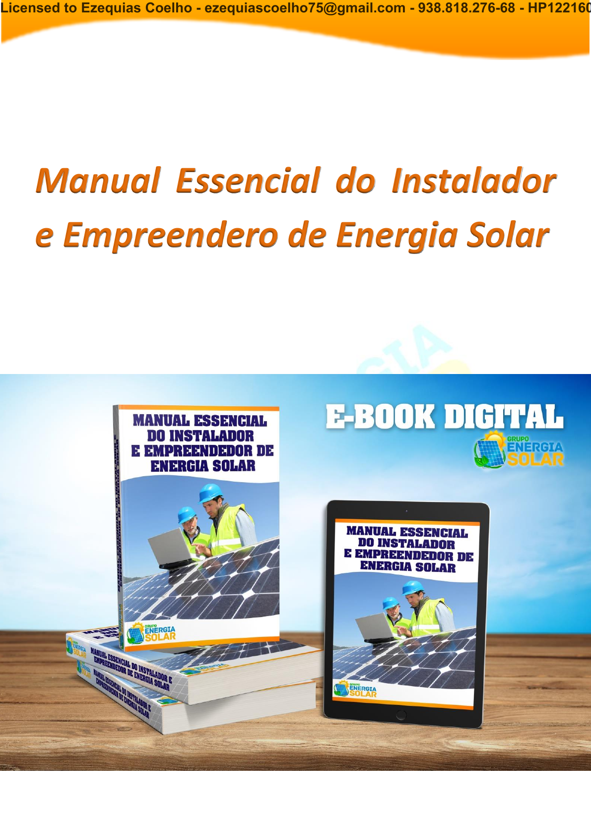 Manual Essencial do Instalador e Empreendedor de Energia Solar Grupo - Energia Solar 1 Manual Essencial do Instalador e Empreendero de Energia Solar Licensed to Ezequias Coelho - ezequiascoelho75@gmail.com - 938.818.276-68 - HP12216062500492 Manual Essencial do Instalador e Empreendedor de Energia Solar Grupo - Energia Solar 2 Olá! Meu nome é Adir Pettenon, sou fundador do Grupo Energia Solar e criador do: Manual Essencial do Instalador e Empreendedor de Energia Solar. Sou Empresário e entusiasta de sistemas fotovoltaicos desde 2010, quando vi a necessidade do mundo todo em busca por preservação do meio ambiente. Além do mais, as grandes oportunidades em negócios no setor fotovoltaico, que o mundo inteiro oferece e continuará em pleno crescimento nas próximas DÉCADAS. Vim aqui, juntamente com nosso grupo de especialistas te repassar, um passo a passo. Mesmo você começando do ZERO! Você irá aprender tudo o que precisa para montar qualquer negócio de Energia Solar: Licensed to Ezequias Coelho - ezequiascoelho75@gmail.com - 938.818.276-68 - HP12216062500492 Manual Essencial do Instalador e Empreendedor de Energia Solar Grupo - Energia Solar 3 Como abrir literalmente uma empresa ou prestadora de serviços, instaladora de Energia Solar corretamente. Ferramentais necessários para utilização inicial Um fluxograma de atendimento inicial correto desde os primeiros clientes até aos furos clientes em sincronia com seus fornecedores. Como você poderá usar e divulgar on-line seu negócio de forma efetiva, em mídias sociais que são acessíveis em massa de forma grátis ou até mesmo de forma paga. Lista dos principais fornecedores do Brasil. Como fazer suas primeiras instalações. E muito mais... © Copyright 2020 - Todos os direitos reservados Licensed to Ezequias Coelho - ezequiascoelho75@gmail.com - 938.818.276-68 - HP12216062500492 Manual Essencial do Instalador e Empreendedor de Energia Solar Grupo - Energia Solar 4 INTRODUÇÃO Licensed to Ezequias Coelho - ezequiascoelho75@gmail.com - 938.818.276-68 - HP12216062500492 Manual Essencial do Instalador e Empreendedor de Energia Solar Grupo - Energia Solar 5 INTRODUÇÃO OPS! Sei que você está ansioso, para ver o conteúdo desse e-book sua nova aquisição. Parabéns pela sua compra e obrigado pela sua confiança. Prometemos te entregar, repassar nessas páginas seguintes, tudo o que sabemos e vivenciamos na prática, visando sempre o seu ganho em conhecimentos. Sugerimos que você imprima esse material e compre um caderno, pode ser simples tipo brochura, ao ler vá rabiscando e fazendo anotações de tudo o que achar importante. Levando em consideração com os novatos do setor. Portanto precisamos começar com os básicos. Sem mais delongas! Vamos lá... Ótima Leitura! Energia solar fotovoltaica Nada mais é do que a conversão direta da radiação solar em energia elétrica. Então essa conversão é realizada pelas chamadas células fotovoltaicas, compostas por material semicondutor, que normalmente é o silício. Quando o Sol alcança sobre as células, a luz solar provoca a movimentação dos elétrons do material condutor, transportando-os pelo material até serem Licensed to Ezequias Coelho - ezequiascoelho75@gmail.com - 938.818.276-68 - HP12216062500492 Manual Essencial do Instalador e Empreendedor de Energia Solar Grupo - Energia Solar 6 captados por um campo elétrico (formado por uma diferença de potencial existente entre os semicondutores). Dessa forma, gera-se eletricidade. Normalmente são constituídos por painéis, módulos e equipamentos elétricos, o sistema fotovoltaico não exige um ambiente com alta radiação para funcionar. De modo que, a quantidade de energia produzida depende da densidade das nuvens, ou seja, quanto menos nuvens houver no céu, com certeza maior será a produção de eletricidade. Licensed to Ezequias Coelho - ezequiascoelho75@gmail.com - 938.818.276-68 - HP12216062500492 Manual Essencial do Instalador e Empreendedor de Energia Solar Grupo - Energia Solar 7 Assim sendo, essa forma de obtenção de energia, uma das mais promissoras atualmente, vem crescendo em grande escala e cada vez mais em virtude da redução dos preços e dos incentivos oferecidos para que os países adotem e incentivem as fontes de energia renováveis. De modo que existe uma crescente preocupação com a preservação do meio ambiente e a busca pela diversificação da matriz elétrica, associado com o aumento na demanda por energia e desenvolvimento da indústria, impulsionou a geração de energia elétrica no mundo a partir de fontes renováveis, como a fonte solar. Visto que as fontes renováveis, embora inicialmente sejam mais caras, tornam-se mais competitivas na medida em que se expandem, sendo a competitividade resultante da redução dos custos devido ao ganho de escala e dos avanços tecnológicos. Encontra-se em grande destaque o Brasil por possuir um expressivo potencial para geração de energia elétrica a partir de fonte solar, contando com níveis de irradiação solar superiores aos de países onde projetos para aproveitamento de energia solar são amplamente incentivados, como Alemanha, França e Espanha. “O termômetro do sucesso é apenas a inveja dos descontentes” (Salvador Dalí) Licensed to Ezequias Coelho - ezequiascoelho75@gmail.com - 938.818.276-68 - HP12216062500492 Manual Essencial do Instalador e Empreendedor de Energia Solar Grupo - Energia Solar 8 Com tudo apesar dos altos níveis de irradiação solar no território brasileiro, o uso da fonte para geração de energia elétrica não apresenta a mesma relevância que possui em outros países, nem o mesmo desenvolvimento de outras fontes renováveis, como eólica e biomassa, que já representam, respectivamente, 8,3% e 9,4% da capacidade de geração instalada no Brasil, contra apenas 1,2% da fonte solar. (dados de 2019) Figura 1 www.bluesol.com.br Mencionou uma preocupação com a geração de energia por fontes renováveis