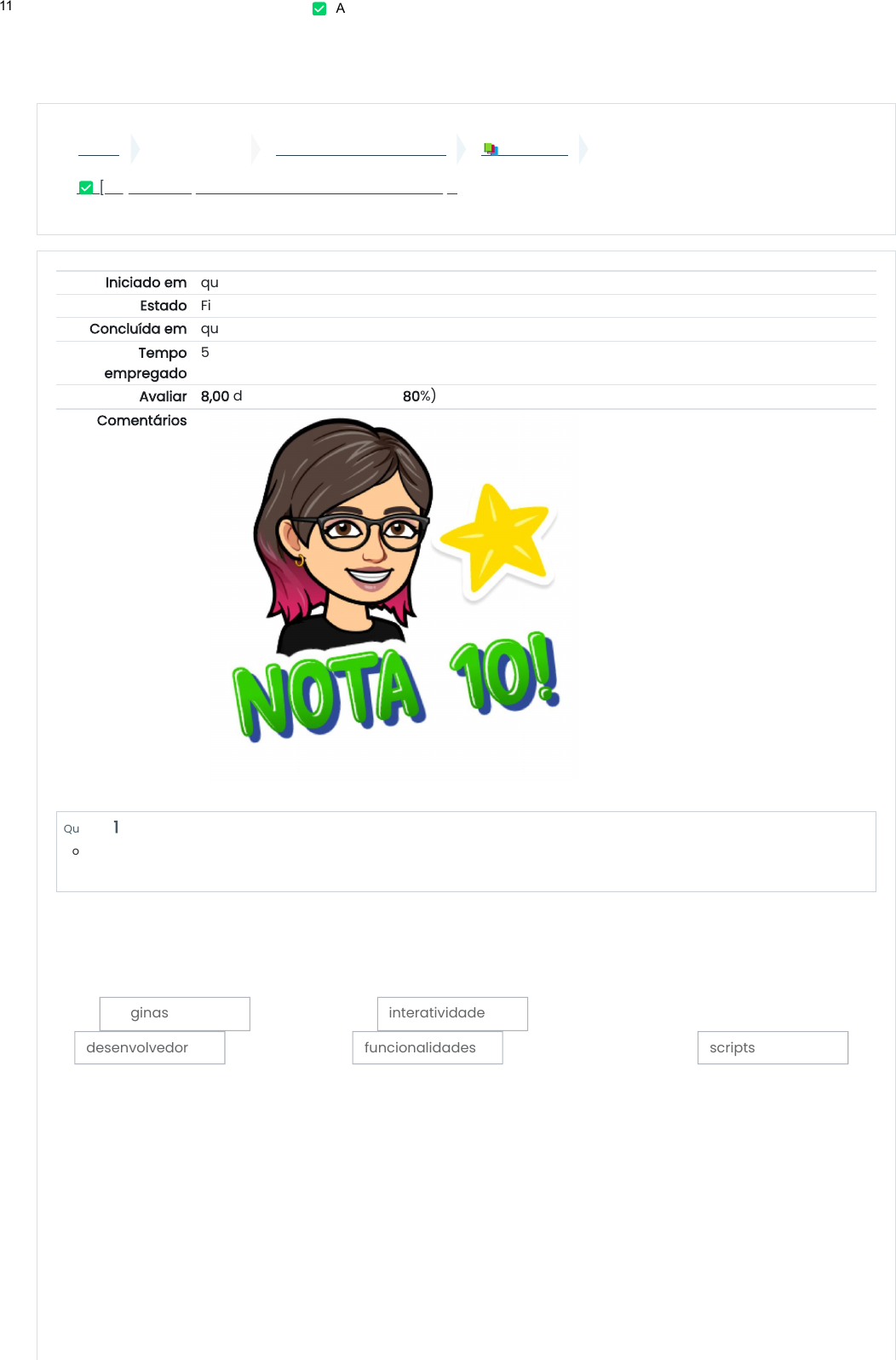 Painel Meus cursos 32010001998-T01-2024-2 📚 Módulo 4 ✅ [A4] – Avaliação do Módulo 4 – Frontend Javascript Iniciado em quarta, 6 nov 2024, 17:00 Estado Finalizada Concluída em quarta, 6 nov 2024, 17:06 Tempo empregado 5 minutos 25 segundos Avaliar 8,00 de um máximo de 10,00(80%) Comentários Questão 1 Correto Atingiu 1,00 de 1,00 De acordo com Marinho (2019, p. 68), com o jQuery: “As web ganham e dinamismo. Dessa forma, o tem acesso a úteis para a criação de [...]” páginas interatividade desenvolvedor funcionalidades scripts 11/6/24, 5:22 PM ✅ [A4] – Avaliação do Módulo 4 – Frontend Javascript: Revisão da tentativa https://ava.ufms.br/mod/quiz/review.php?attempt=1167866&cmid=849827 1/4 https://ava.ufms.br/my/ https://ava.ufms.br/course/view.php?id=60736 https://ava.ufms.br/course/view.php?id=60736#section-5 https://ava.ufms.br/mod/quiz/view.php?id=849827 Questão 2 Correto Atingiu 1,00 de 1,00 Questão 3 Correto Atingiu 1,00 de 1,00 Questão 4 Correto Atingiu 1,00 de 1,00 De acordo com Marinho (2019), o jQuery é baseado em qual linguagem? a. HTML b. Java c. JavaScript d. PHP e. TypeScript De acordo com Miletto (2014), qual propriedade representa quando um campo de um formulário ganha o foco? a. onFocus b. onError c. onLoad d. onAbort e. onChange De acordo com Miletto (2014), qual propriedade representa quando um formulário é enviado? a. onLoad b. onAbort c. onSubmit d. onChange e. onSelect 11/6/24, 5:22 PM ✅ [A4] – Avaliação do Módulo 4 – Frontend Javascript: Revisão da tentativa https://ava.ufms.br/mod/quiz/review.php?attempt=1167866&cmid=849827 2/4 Questão 5 Correto Atingiu 1,00 de 1,00 Questão 6 Incorreto Atingiu 0,00 de 1,00 Questão 7 Correto Atingiu 1,00 de 1,00 Questão 8 Correto Atingiu 1,00 de 1,00 De acordo com Marinho (2019), é correto afirmar que o uso de frameworks web pode diminuir o tempo de produção de uma aplicação? Escolha uma opção: Verdadeiro Falso De acordo com Marinho (2019), é correto afirmar que o Node.js é mono protocolo? Escolha uma opção: Verdadeiro Falso De acordo com Miletto (2014), o JavaScript tem a função de controlar o comportamento da página, permitindo, por exemplo: Escolha uma ou mais: a. Definir padrão de marcação de elementos. b. Ocultar e mostrar objetos. c. Validar formulários. d. Executar pequenas operações e manipulações junto ao navegador. e. Alterar estilos. De acordo com Miletto (2014), qual propriedade representa o evento de carregamento de um elemento? a. onAbort b. onLoad c. onError d. onFocus e. onChange 11/6/24, 5:22 PM ✅ [A4] – Avaliação do Módulo 4 – Frontend Javascript: Revisão da tentativa https://ava.ufms.br/mod/quiz/review.php?attempt=1167866&cmid=849827 3/4 Questão 9 Incorreto Atingiu 0,00 de 1,00 Questão 10 Correto Atingiu 1,00 de 1,00 De acordo com Marinho (2019), é correto afirmar que um framework é um modelo específico de classes e objetos e suas relações? Escolha uma opção: Verdadeiro Falso De acordo com Marinho (2019), assinale a alternativa que NÃO representa um benefício na utilização de frameworks web? a. Aumento de produtividade. b. Compatibilidade e Integração entre aplicações. c. Menor custo. d. Maior reuso. e. Menor nível de abstração. Atividade anterior ◄ 📍 [Checkout de Presença] Módulo 4 – Frontend Javascript Seguir para... Próxima atividade ✅ [PO] Prova Optativa ► Manter contato Suporte Técnico ao Usuário https://suporteagetic.ufms.br (67) 3345-7613 suporte.agead@ufms.br 11/6/24, 5:22 PM ✅ [A4] – Avaliação do Módulo 4 – Frontend Javascript: Revisão da tentativa https://ava.ufms.br/mod/quiz/review.php?attempt=1167866&cmid=849827 4/4 https://ava.ufms.br/mod/assign/view.php?id=849825&forceview=1 https://ava.ufms.br/mod/quiz/view.php?id=849828&forceview=1 https://suporteagetic.ufms.br/ tel:(67) 3345-7613 mailto:suporte.agead@ufms.br https://api.whatsapp.com/send?phone=556733457613