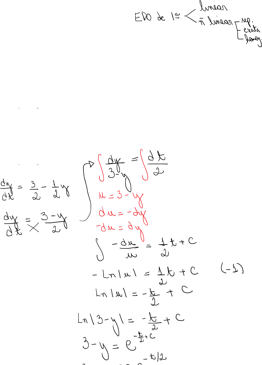 Equações diferenciais de 1 ordem: (1) Equações lineares𝑑𝑦𝑑𝑡⎯⎯⎯+ 𝑝(𝑡)𝑦 = 𝑔(𝑡) Onde p e g são funções dadas da variável independente t. A equação acima pode ser resolvida pelo método de integração, se conseguirmos separar as variáveis, ou pelo método do fator integrante. Método da integração Exemplo: Resolva a equação diferencial a seguir 𝑑𝑦𝑑𝑡⎯⎯⎯+ 12⎯⎯𝑦 = 32⎯⎯ e determine como as soluções se comportam para grandes valores de t. Determine a solução cuja curva passa pelo ponto (0,2). Solução:𝑑𝑦𝑑𝑡⎯⎯⎯+ 12⎯⎯𝑦 = 32⎯⎯ EDO de Primeira Ordem Página 1 de 10 EDO de primeira ordem Esboço do gráfico de soluções: Página 2 de 10 EDO de primeira ordem Exemplo: Determine a solução geral para a EDO 𝑦 = −2𝑦. Solução: Página 3 de 10 EDO de primeira ordem Infelizmente o método direto de resolver uma ED não pode ser usado para encontrar solução de equações diferenciais lineares de primeira ordem mais gerais. Para isso, usamos o método do fator integrante, que consiste em multiplicar a ED por uma certa função desconhecida μ(𝑡)(𝑓𝑎𝑡𝑜𝑟 𝑖𝑛𝑡𝑒𝑔𝑟𝑎𝑛𝑡𝑒) de modo que a equação resultante é imediatamente integrável. Método dos fatores integrantes Seja a equação diferencial de primeira ordem linear:𝑦 + 𝑝(𝑡)𝑦 = 𝑔(𝑡) (1) Para conseguirmos separar as variáveis, vamos multiplicar a EDO linear (1) pelo fator integrante:𝜇(𝑡) = 𝑒∫ ( ) Vejamos no exemplo a seguir como o fator integrante nos ajuda na resolução. Exemplo: Determine a solução do PVI:(𝑎) 𝑦 − 𝑦2⎯⎯= 𝑒𝑦(0) = −1 Solução: Página 4 de 10 EDO de primeira ordem Página 5 de 10 EDO de primeira ordem lim→ − 23⎯⎯𝑒 − 13⎯⎯𝑒⎯⎯= (𝑏) 𝑡𝑦 + 2𝑦 = 4𝑡𝑦(1) = 2 Solução: Primeiro devemos deixar essa EDO linear de primeira ordem na forma padrão, que é deixar y' sozinho:𝑦 + ⎯𝑦 = 4𝑡, 𝑡 ≠ 0 para existir solução. Página 6 de 10 EDO de primeira ordem Exemplo: Determine a solução geral da ED dada:(𝑎)𝑦 + 3𝑦 = 𝑡 + 𝑒𝑦 = − + 𝑒 + 𝑐𝑒 Página 7 de 10 EDO de primeira ordem Resposta: 𝑦 = ⎯ − ⎯ + 𝑒 + 𝑐𝑒 Gráfico das soluções lim→ 𝑡3⎯⎯− 19⎯⎯+ 𝑒 + 𝑐𝑒 é assintótico a t3⎯⎯− 19⎯⎯ que é a reta no gráfico abaixo: Página 8 de 10 EDO de primeira ordem (𝑏)𝑦 − 2𝑦 = 𝑡 𝑒 Resposta: 𝑦 = ⎯⎯⎯⎯+ 𝑐𝑒 Gráfico das soluções Página 9 de 10 EDO de primeira ordem lim→ 𝑡 𝑒3⎯⎯⎯⎯⎯+ 𝑐𝑒 = ∞ (2) Equações separáveis Considere a EDO de primeira ordem:𝑑𝑦𝑑𝑥⎯⎯⎯= 𝑓(𝑥, 𝑦) (1) Se a equação (1) não for linear, não existe um método universal para resolvê-la. Vamos considerar primeiramente as equações que podem ser resolvidas por um processo de integração direta. Podemos escrever a equação (1) na forma: 𝑀(𝑥, 𝑦) + 𝑁(𝑥, 𝑦) 𝑑𝑦𝑑𝑥⎯⎯⎯= 0 (2) Onde 𝑀(𝑥, 𝑦) = −𝑓(𝑥, 𝑦) e 𝑁(𝑥, 𝑦) = 1 Se M depende apenas de x e N depende apenas de y, a equação (2) fica: 𝑀(𝑥) + 𝑁(𝑦) 𝑑𝑦𝑑𝑥⎯⎯⎯= 0 (3) Essa equação (3) é dita separável, pois, se for escrita na forma:𝑀(𝑥)𝑑𝑥 + 𝑁(𝑦)𝑑𝑦 = 0 Então, suas parcelas envolvendo cada variável podem ser separadas pelo sinal de "=". Uma equação separável pode ser resolvida integrando as funções M e N. Exemplo: Mostre que a equação ⎯⎯ = ⎯⎯⎯⎯é separável. Em seguida, encontre uma equação para as suas curvas integrais. Solução: Página 10 de 10 EDO de primeira ordem Solução: 𝑑𝑦𝑑𝑥⎯⎯⎯= 𝑥1 − 𝑦⎯⎯⎯⎯⎯⎯− 𝐸𝐷𝑂 𝑑𝑒 𝑝𝑟𝑖𝑚𝑒𝑖𝑟𝑎 𝑜𝑟𝑑𝑒𝑚 𝑛ã𝑜 𝑙𝑖𝑛𝑒𝑎𝑟 Exemplo: Resolva o problema de valor inicial (PVI):𝑑𝑦𝑑𝑥 = 3𝑥 + 4𝑥 + 22(𝑦 − 1) Página 11 de 10 EDO de primeira ordem 𝑑𝑦𝑑𝑥⎯⎯⎯= 3𝑥 + 4𝑥 + 22(𝑦 − 1)⎯⎯⎯⎯⎯⎯⎯⎯⎯⎯⎯𝑦(0) = −1 E determine o intervalo no qual a solução é válida. Solução: Gráfico da solução: Página 12 de 10 EDO de primeira ordem (3) Equações homogêneas Uma função 𝑓 é homogênea se:𝑓(𝑡𝑥, 𝑡𝑦) = 𝑡 𝑓(𝑥, 𝑦) ⇒ 𝑓 é uma função homogênea de grau 𝑛. Exemplo: (𝑎)𝑓(𝑥, 𝑦) = 𝑥 − 3𝑥𝑦 + 5𝑦 Temos que 𝑓(𝑡𝑥, 𝑡𝑦) = (𝑡𝑥) −3𝑡𝑥𝑡𝑦 + 5(𝑡𝑦) = 𝑡 𝑥 − 3𝑡 𝑥𝑦 + 5𝑡 𝑦 =𝑡 (𝑥 − 3𝑥𝑦 + 5𝑦 ) = 𝑡 𝑓(𝑥, 𝑦) ⇒ 𝑓 é uma função homogênea de grau 2.(𝑏)𝑓(𝑥, 𝑦) = 𝑥2𝑦⎯⎯⎯+ 4 Temos que 𝑓(𝑡𝑥, 𝑡𝑦) = ⎯⎯⎯+ 4 = ⎯⎯+ 4 ⇒ 𝑓 é uma função homogênea de grau zero.(𝑐)𝑓(𝑥, 𝑦) = 𝑥 + 𝑦 + 1 Temos que 𝑓(𝑡𝑥, 𝑡𝑦) = (𝑡𝑥) +(𝑡𝑦) + 1 = 𝑡 𝑥 + 𝑡 𝑦 + 1 = 𝑡 (𝑥 + 𝑦 ) + 1 ⇒ 𝑓 não é uma função homogênea. Uma EDO homogênea é não linear e é da forma:𝑀(𝑥, 𝑦)𝑑𝑥 + 𝑁(𝑥, 𝑦)𝑑𝑦 = 0, em que M e N são funções homogêneas de mesmo grau. Como se resolve uma EDO homogênea? Com substituição algébrica:𝑦 = 𝑢𝑥 𝑑𝑦 = 𝑢𝑑𝑥 + 𝑥𝑑𝑢 Ou𝑥 = 𝑣𝑦 Página 13 de 10 EDO de primeira ordem 𝑥 = 𝑣𝑦 𝑑𝑥 = 𝑣𝑑𝑦 + 𝑦𝑑𝑣 Exemplo: Calcule as EDOs a seguir(𝑎) 𝑑𝑦𝑑𝑥⎯⎯⎯= 3𝑦 − 𝑥2𝑥𝑦⎯⎯⎯⎯⎯⎯⎯⎯ (𝑏) 𝑑𝑦𝑑𝑥⎯⎯⎯= 𝑥 + 𝑦𝑥𝑦⎯⎯⎯⎯⎯⎯⎯ (4) Equações Exatas e fatores integrantes Considere a EDO:𝑀(𝑥, 𝑦) + 𝑁(𝑥, 𝑦) 𝑑𝑦𝑑𝑥⎯⎯⎯= 0 (∗)𝑀(𝑥, 𝑦)𝑑𝑥 + 𝑁(𝑥, 𝑦)𝑑𝑦 = 0é exata se:𝜕𝑀𝜕𝑦⎯⎯⎯ = 𝜕𝑁𝜕𝑥⎯⎯⎯ Existe uma função 𝑓(𝑥, 𝑦) tal que:(1) 𝑀(𝑥, 𝑦