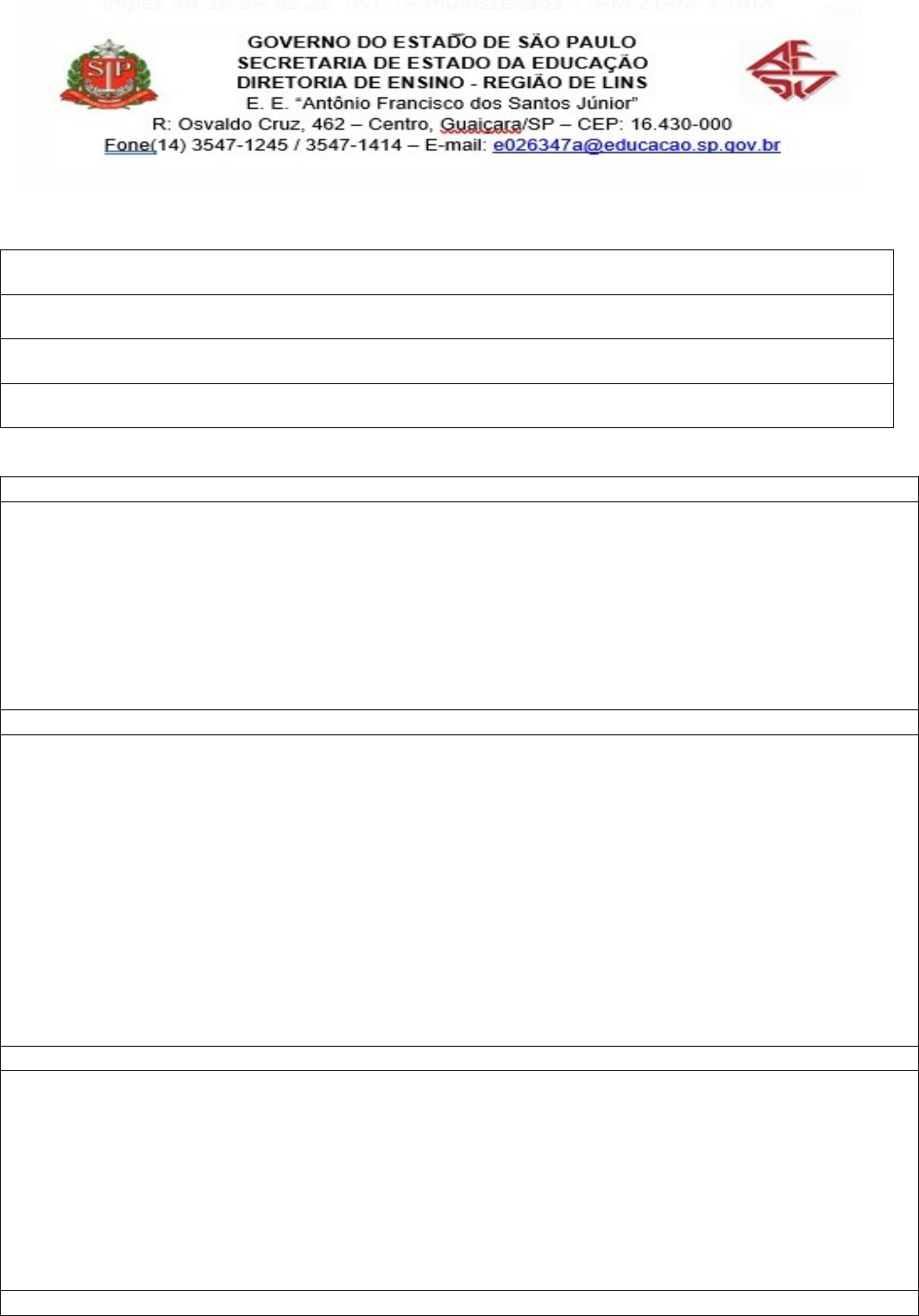PLANO DE TRABALHO SEMANAL – 1º BIMESTRE De 25/03/24 à 28/03/24 PROFESSOR: ESTER ANGELICA OLIVEIRA DOS SANTOS BARBOSA COMPONENTE CURRICULAR: LÍNGUA PORTUGUESA TURMA: 8 C QUANTIDADE DE AULA/ CARGA HORÁRIA SEMANAL: ¨ 6 AULAS PERÍODO: TARDE OBJETO DE CONHECIMENTO/ HABILIDADES: (EF69LP29) Refletir sobre a relação entre os contextos de produção dos gêneros de divulgação científica (reportagem de divulgação científica, verbete de enciclopédia, esquema, infográfico, relatório, relato multissemiótico de campo, entre outros) e os aspectos relativos à construção composicional e às marcas linguísticas características desses gêneros, de forma a ampliar suas possibilidades de compreensão (e produção) de textos pertencentes a esses gêneros.( aulas ,18,19) (EF67LP22) Produzir resumos, a partir das notas e/ou esquemas feitos, com o uso adequado de paráfrases citações (EF69LP07B) Produzir textos em diferentes gêneros, considerando sua adequação ao contexto de produção e circulação.(aulas 20,21,22,223,24,25,26.) METODOLOGIAS: A metodologia utilizada pelo docente para a organização da mediação entre o sujeito (graduando) e o objeto de conhecimento (conteúdos da disciplina) se dará por meio dos seguintes procedimentos: - Valorização de ideias (conhecimento inicial do aluno sobre o conteúdo). - Aulas expositivas dialogadas. - Leituras orientadas de textos selecionados. - Trabalhos individuais e/ou grupais.. - Pesquisas sobre o tema. - Seminários. - Entrevistas com pessoas-fonte. - Palestras. - Discussões e debates dirigidos. - Observações da realidade. - Tarefas de assimilação de conteúdos.. - Análise de vídeos ou filmes. - Leitura de aprofundamento (livro ( x ) Material Digital – aula(s): ( x ) Plataforma Digital: ( x ) Currículo: ( x ) Aprender Sempre: ( ) Multimídia : ( ) Sala Informática ( ) Outros: AVALIAÇÃO: Será contínua com base nos conteúdos aplicados, valorizando o aprendizado e com interferência da professora sempre que preciso. REFERÊNCIAS: CMSP/CURRÍCULO 2024 Assinatura do Professor: Ester Angélica Oliveira dos Santos Barbosa ____________________________________________ image1.png