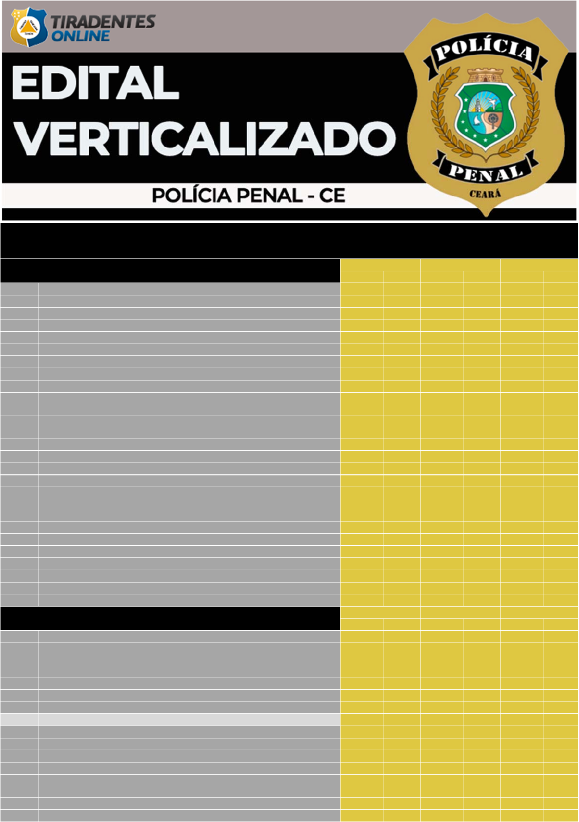 NÍVEL MÉDIO CARGO AGENTE PENITENCIÁRIO LÍNGUA PORTUGUESA 1ª RODADA 2ª RODADA 3ª RODADA ESTUDO EXER ESTUDO EXER ESTUDO EXER 1. Compreensão e interpretação de texto. 2. Tipologia e gêneros textuais. 3. Figuras de linguagem. 4. Significação de palavras e expressões. 5. Relações de sinonímia e de antonímia. 6. Ortografia. 7. Acentuação gráfica. 8. Uso da crase. 9. Divisão silábica. 10. Fonética e Fonologia: som e fonema, encontros vocálicos e consonantais e dígrafos. 11. Morfologia: classes de palavras variáveis e invariáveis e seus empregos no texto. 12. Locuções verbais (perífrases verbais). 13. Funções do “que” e do “se”. 14. Formação de palavras. 15. Elementos de comunicação. 16. Sintaxe: relações sintático‐semânticas estabelecidas entre orações, períodos ou parágrafos (período simples e período composto por coordenação e subordinação). 17. Concordância verbal e nominal. 18. Regência verbal e nominal. 19. Colocação pronominal. 20. Emprego dos sinais de pontuação e sua função no texto. 21. Elementos de coesão. 22. Função textual dos vocábulos. 23. Variação linguística. NOÇÕES DE INFORMÁTICA 1ª RODADA 2ª RODADA 3ª RODADA ESTUDO EXERC ESTUDO EXERC ESTUDO EXER 1. Conceitos e fundamentos básicos de informática. 2. Conhecimento e utilização dos principais softwares utilitários (compactadores de arquivos, chat, clientes de e‐mails, reprodutores de vídeo, visualizadores de imagem, antivírus). 3. Identificação e manipulação de arquivos, backup de arquivos. 4. Periféricos de computadores. 5. Ambientes operacionais. 5.1. Utilização dos sistemas operacionais Windows 7 e Windows 8.1. 6. Utilização dos editores de texto (Microsoft Word e LibreOffice Writer). 7. Utilização dos editores de planilhas (Microsoft Excel e LibreOffice Calc). 8. Utilização do Microsoft PowerPoint. 9. Utilização e configuração de e‐mail no Microsoft Outlook. 10. Conceitos de tecnologias relacionadas à Internet e Intranet, busca e pesquisa na Web, Mecanismos de busca na Web. 11. Navegadores de internet (Internet Explorer, Mozilla Firefox, Google Chrome). 12. Segurança na Internet, Vírus de computadores, Spyware, Malware, Phishing. 13. Transferência de arquivos pela internet. NOÇÕES DE DIREITO 1ª RODADA 2ª RODADA 3ª RODADA ESTUDO EXER ESTUDO EXER ESTUDO EXER 1. Direito Constitucional: 1.1. Direitos e Garantias Fundamentais (artigo 5º). 1.2. Da Administração Pública (artigo 37). 1.3. Da Defesa do Estado e das Instituições Democráticas, do estado de defesa e do estado de sítio (artigos 136 ao 141). 1.4. Da Segurança Pública (artigo 144). 2. Direito Penal: 2.1. Do crime (artigo 13 ao 25). 2.2. Das Penas (artigos 32 ao 52). 2.3. Dos crimes contra a honra (artigos 138 ao 145). 2.4. Dos crimes contra a Pessoa (artigos 121 ao 154). 2.5. Dos crimes contra a liberdade individual (artigos 146 ao 150). 2.6. Dos crimes contra o Patrimônio (artigos 155 ao 180). 2.7. Dos crimes praticados por funcionário público contra a Administração em Geral (artigos 312 ao 327). DIREITOS HUMANOS E CIDADANIA 1ª RODADA 2ª RODADA 3ª RODADA ESTUDO EXERC ESTUDO EXERC ESTUDO EXER 1. A Constituição da República Federativa do Brasil de 1988: 1.1. Dos princípios fundamentais (artigos 1 ao 4). 1.2. Direitos e garantias fundamentais (artigos 5 ao 16). 2. Direitos Humanos: 2.1. Concepções. 2.2. O Estado e as garantias à pessoa em privação de liberdade. 2.3. Carta das Nações Unidas (1945): art.1 e art.55. 2.4. Declaração Universal dos Direitos Humanos (adotada e proclamada pela Resolução 217‐A (III) – da Assembleia Geral das Nações Unidas, em 10 de dezembro de 1948): universalidade, igualdade e não discriminação (artigos 1º, 2º e 7º); direito à vida, à liberdade e à segurança (art.3º); direito de ir e vir e proibição de prisão arbitrária (arts.9º e 13); asilo (art.14). 3. Convenção para a prevenção e a repressão do crime de genocídio: conceito de genocídio (art.2º), responsabilidade (art.4º), genocídio e extradição (art.13). LEGISLAÇÃO ESPECIAL 1ª RODADA 2ª RODADA 3ª RODADA ESTUDO EXER ESTUDO EXER ESTUDO EXER 1. Lei Federal Nº10.826, de 22/12/2003 e posteriores alterações (Dispõe sobre registro, posse e comercialização de armas de fogo e munição, sobre o Sistema Nacional de Armas – Sinarm). 2. Decreto Federal Nº5.123, de 1/07/2004 e alterações posteriores (Regulamenta a Lei Nº10.826, de 22 de dezembro de 2003, que dispõe sobre registro, posse e comercialização de armas de fogo e munição, sobre o Sistema Nacional de Armas ‐ SINARM e define crimes). 3. Lei Estadual Nº 15.455, de 08/11/2013, publicada no Diário Oficial em 21/11/2013 (Dispõe sobre o direito do porte de armas de fogo pelos Agentes Penitenciários do Estado do Ceará e dá outras providências). 4. Lei Federal Nº7.210/84 e alterações posteriores (Lei de Execução Penal): 4.1. Direitos preservados (artigo 3º); 4.2. Do condenado, do internado e egresso (artigos 5º ao 26); 4.3. Dos deveres, direitos e disciplina do condenado (artigos 38 ao 52); 4.4. Dos estabelecimentos penais (artigos 82 ao 104); 4.5. Dos regimes (artigos 110 ao 118). 5. Leis Federais Nº 8.072/90 e Nº 8.930/94 (Dá nova redação ao art.1º da Lei Nº 8.072, de 25 de julho de 1990, que dispõe sobre os crimes hediondos, nos termos do art.5º, inciso XLIII, da Constituição Federal, e determina outras providências). 6. Lei Federal Nº9.455/97 e alterações posteriores (Define os crimes de tortura e dá outras providências). 7. Lei Federal Nº11.343/06 e alterações posteriores (Sistema Nacional de Políticas Públicas sobre Drogas – SISNAD): Título III ‐ Capítulo III, Dos crimes – arts.27 ao 30; Título IV ‐ Capítulo II, Dos Crimes – arts.33 ao 47. CONHECIMENTOS ESPECÍFICOS 1ª RODADA 2ª RODADA 3ª RODADA ESTUDO EXER ESTUDO EXER ESTUDO EXER 1. Direitos, deveres e regime disciplinar dos Funcionários Públi