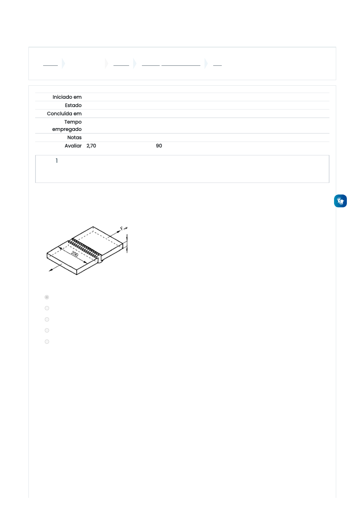 09/11/2021 16:18 A2F: Revisão da tentativa https://moodle.universo.edu.br/mod/quiz/review.php?attempt=209289&cmid=17343 1/9 Painel Meus cursos 4477E1 AVALIAÇÃO A DISTÂNCIA A2F Iniciado em terça, 26 out 2021, 20:07 Estado Finalizada Concluída em terça, 26 out 2021, 20:18 Tempo empregado 10 minutos 14 segundos Notas 9,00/10,00 Avaliar 2,70 de um máximo de 3,00(90%) Questão 1 Correto Atingiu 1,00 de 1,00 A junta de topo representada na figura é composta por duas chapas com largura l = 200 mm e espessura t = 12 mm. A tensão admissível indicada pela SAS (Sociedade Americana de Solda) para solda de topo é τ = 90 MPa. Determinar a carga máxima (F .) que poderá ser suportada pela junta. Escolha uma opção: a. 216 kN b. 108 kN c. 432 kN d. 54 kN e. 21,6kN s máx Sua resposta está correta. A resposta correta é: 216 kN. https://moodle.universo.edu.br/my/ https://moodle.universo.edu.br/course/view.php?id=1368 https://moodle.universo.edu.br/course/view.php?id=1368#section-3 https://moodle.universo.edu.br/mod/quiz/view.php?id=17343 09/11/2021 16:18 A2F: Revisão da tentativa https://moodle.universo.edu.br/mod/quiz/review.php?attempt=209289&cmid=17343 2/9 Questão 2 Correto Atingiu 1,00 de 1,00 Questão 3 Correto Atingiu 1,00 de 1,00 Escolha uma opção: a. 500 Pa e 300 Mpa b. 71,7 N/mm e 292,5 N/mm c. 0,5 MPa e 29,25 MPa d. 10 MPa e 292,5 N/mm e. 50 MPa e 300 Mpa Calcule a tensão de cisalhamento média no pino e a tensão normal de tração média no cabo da estrutura abaixo: 2 2 2 Sua resposta está correta. A resposta correta é: 71,7 N/mm e 292,5 N/mm .2 2 Uma barra circular de aço, possui diâmetro de 20 mm e comprimento de 800 mm encontra-se submetida à ação de uma carga (força) axial de 7,2 kN. Determine: a) Tensão normal atuante. b) O alongamento. Escolha uma opção: a. Tensão Normal = 40,9 MPa Alongamento = 1,087 mm b. Tensão Normal = 0,9 MPa Alongamento = 0,87 mm c. Tensão Normal = 229 MPa Alongamento = 1,87 mm d. Tensão Normal = 2,9 MPa Alongamento = 0,87 mm e. Tensão Normal = 22,9 MPa Alongamento = 0,087 mm Sua resposta está correta. A resposta correta é: Tensão Normal = 22,9 MPa Alongamento = 0,087 mm. 09/11/2021 16:18 A2F: Revisão da tentativa https://moodle.universo.edu.br/mod/quiz/review.php?attempt=209289&cmid=17343 3/9 Questão 4 Correto Atingiu 1,00 de 1,00 Questão 5 Correto Atingiu 1,00 de 1,00 Indique o ponto que representa o limite de proporcionalidade no diagrama tensão-deformação. Escolha uma opção: a. D b. C c. B d. A e. E Sua resposta está correta. A resposta correta é: A. Calcule a tensão de cisalhamento média que ocorre na cola. Escolha uma opção: a. 12,5MPa b. 1,5MPa c. 2,5MPa d. 5,0 MPa e. 25MPa Sua resposta está correta. A resposta correta é: 2,5MPa. 09/11/2021 16:18 A2F: Revisão da tentativa https://moodle.universo.edu.br/mod/quiz/review.php?attempt=209289&cmid=17343 4/9 Questão 6 Correto Atingiu 1,00 de 1,00 Questão 7 Correto Atingiu 1,00 de 1,00 Calcule as reações de apoio da viga de aço abaixo: Escolha uma opção: a. 1039,5 N b. 10395 N c. 103,95 N d. 2071, 5 N e. 10.509, 5 N Sua resposta está correta. A resposta correta é: 1039,5 N. Indique o ponto que representa o limite de resistência no diagrama tensão-deformação. Escolha uma opção: a. C b. D c. E d. A e. B Sua resposta está correta. A resposta correta é: D. 09/11/2021 16:18 A2F: Revisão da tentativa https://moodle.universo.edu.br/mod/quiz/review.php?attempt=209289&cmid=17343 5/9 Questão 8 Correto Atingiu 1,00 de 1,00 Um corpo de prova de alumínio, mostrado na figura, tem diâmetro d = 25 mm e comprimento de referência L = 250 mm. Se uma força de 165 kN provocar um alongamento de 1,20 mm no comprimento de referência, determine o módulo de elasticidade. Considere G = 26 GPa e = 440 MPa. Escolha uma opção: a. 336 MPa b. 70,0 GPa c. 25 GPa d. 220 MPa e. 26 GPa 0 0 al σe Sua resposta está correta. A resposta correta é: 70,0 GPa. 09/11/2021 16:18 A2F: Revisão da tentativa https://moodle.universo.edu.br/mod/quiz/review.php?attempt=209289&cmid=17343 6/9 Questão 9 Incorreto Atingiu 0,00 de 1,00 Indique a região de estricção no diagrama tensão-deformação. Escolha uma opção: a. C-E b. A-B c. C-D d. B-C e. D-E Sua resposta está incorreta. A resposta correta é: D-E. 09/11/2021 16:18 A2F: Revisão da tentativa https://moodle.universo.edu.br/mod/quiz/review.php?attempt=209289&cmid=17343 7/9 Questão 10 Correto Atingiu 1,00 de 1,00 Escolha uma opção: a. 0,0114 m b. 1,14 X 10 m c. 0,00014 mm d. 28,4 X 10 e. 114 X 10 m Uma barra de AI possui secção transversal quadrada com 60mm de lado e, o seu comprimento é de 0,8 m. A carga axial aplicada na barra é de 36 kN. Determinar a tensão normal atuante na barra e o seu alongamento. -6 -5m -6 Sua resposta está correta. A resposta correta é: 114 X 10 m.-6 Atividade anterior ◄ A1P Seguir para... Próxima atividade A2P ► https://moodle.universo.edu.br/mod/quiz/view.php?id=17342&forceview=1 https://moodle.universo.edu.br/mod/quiz/view.php?id=17344&forceview=1 09/11/2021 16:18 A2F: Revisão da tentativa https://moodle.universo.edu.br/mod/quiz/review.php?attempt=209289&cmid=17343 8/9 09/11/2021 16:18 A2F: Revisão da tentativa https://moodle.universo.edu.br/mod/quiz/review.php?attempt=209289&cmid=17343 9/9