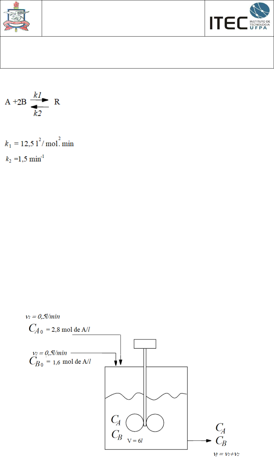 UNIVERSIDADE FEDERAL DO PARÁ INSTITUTO DE TECNOLOGIA Trabalho Disciplina: MODELAGEM E SIMULACAO DE PROCESSOS INDUSTRIAIS – 2024 Prof. Sil Quaresma Considere a reação elementar em fase líquida: Com as constantes de reação: Deve ser adicionado em um reator de mistura perfeita (CSTR) de 6 litros de volume, duas correntes de alimentação, uma contendo 2,8 mols de A/l e a outra contendo 1,6 mol de B/l. As vazões volumétricas são iguais a 0,5 l/min e são sempre iguais. Realize o balanço e elabore um modelo em função do tempo para calcular o perfil de concentração dos componentes A, B e R. Não há alteração de nivel no reator. a) Plot os perfis de concentração para cada componente. b) Encontre o tempo necessário para alcançar o regime permanente e calcule a conversão em relação a B. c) Para uma conversão de 75% do componente B, calcule qual deve ser a vazão volumétrica de cada corrente e o tempo para se alcançar o regime estacionário.