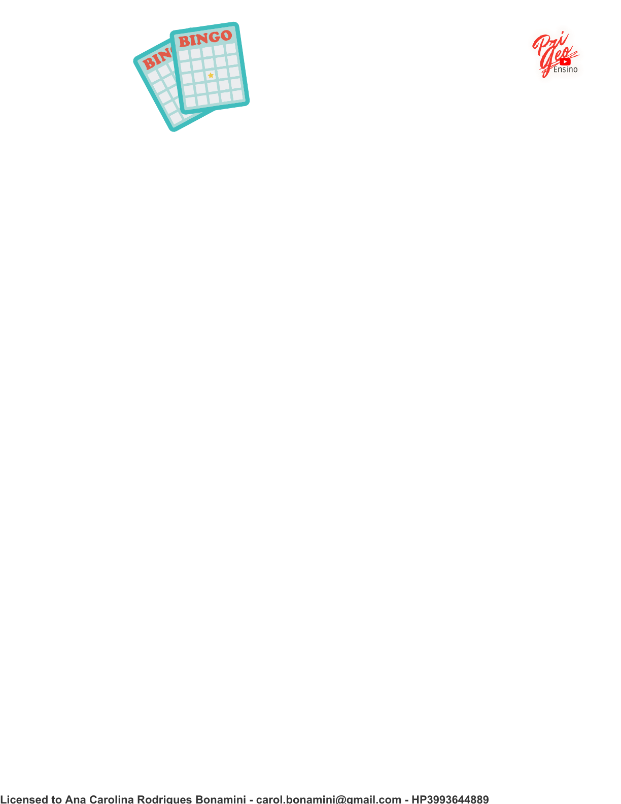 ATENÇÃO: Esse material é de uso individual, para que você, professor (a), use-o em suas de aulas para torná-las mais atrativas. Entretanto, esse material não deve ser compartilhado com outros professores, nem comercializado sem autorização da autora, sob as penas da lei. A indicação do trabalho é livre e eu agradeço. Espero que esse material, feito com muito carinho, ajude a transformar suas aulas em um sucesso. Beijo, da Prigeo. Como jogar: Entregue uma cartela para cada aluno. No presencial, é só imprimir e, no on-line, é só compartilhar o link. (abaixo) Você pode sortear as perguntas de sugestão ou criá-las, levando em consideração as respostas das cartelas. Não fale a resposta, deixe os alunos testarem seus conhecimentos marcando as suas na cartela. Ganha aquele que primeiro completá-la, fazendo o bingo! Você poderá conferir o resultado, de acordo com a cartela de base. Ao fim do bingo, faça o feedback, relendo as perguntas e identificando as respostas em voz alta (sugestão). Vídeo de orientação: como aplicar o bingo educativo em aula. educativo Tema do Bingo: Orientação e localização do espaço terrestre Material de apoio ao professor Link para o bingo virtual: https://mfbc.us/m/tpg2kn5 (Caso vá realizar esse bingo em uma aula on-line, é só clicar no link acima, copiar a URL e enviar para os alunos) Sugestões de questões para o bingo 1- Aparelho de orientação, no qual o ponteiro é uma agulha imantada (como um ímã), que sempre aponta para o norte magnético da Terra. (bússola) 2- Sistema de linhas imaginárias, traçadas sobre a superfície da Terra, que auxilia na localização de qualquer ponto ou lugar na superfície terrestre. (coordenadas geográficas) 3- Paralelo principal que divide a Terra em hemisfério norte e hemisfério sul. (Linha do Equador) 4- Linhas imaginárias, traçadas verticalmente na superfície terrestre (do polo norte ao sul). (meridianos) Licensed to Ana Carolina Rodrigues Bonamini - carol.bonamini@gmail.com - HP3993644889 https://mfbc.us/m/tpg2kn5 5- Principal meridiano que divide a Terra em dois hemisférios: o ocidental (ou oeste) e o oriental (ou leste). (Meridiano de Greenwich) 6- Hemisfério onde o Brasil está localizado levando em consideração o Meridiano de Greenwich. (Hemisfério Ocidental) 7- Linhas imaginárias que circundam toda a superfície do globo terrestre no sentido leste - oeste. Elas indicam as diferentes latitudes da Terra. (paralelos) 8- Ferramenta que recebe e envia informações da superfície terrestre aos satélites que orbitam na Terra. Essa ferramenta orienta o usuário a encontrar um endereço desejado. (GPS) 9- Figura que representa graficamente os principais pontos de orientação na superfície terrestre, trazendo a indicação dos pontos cardeais, colaterais e subcolaterais. (rosa dos ventos) 10- Hemisférios onde o Brasil está localizado levando em consideração a Linha do Equador. (Hemisfério Norte e Sul) 11- Paralelos principais que estão acima da Linha do Equador. (Círculo polar Ártico e Trópico de Câncer) 12- Distância, em graus, de qualquer ponto da superfície terrestre em relação à Linha do Equador, o principal dos paralelos terrestres. (latitude) 13- Variação angular, em graus, de um ponto qualquer da superfície terrestre até o meridiano de Greenwich. (longitude) 14- Paralelos principais que estão abaixo da Linha do Equador. (Trópico de Capricórnio e Círculo Polar Antártico) Atenção: você pode incluir mais perguntas ou mudar as perguntas acima. elas são apenas uma sugestão. BOA AULA! Licensed to Ana Carolina Rodrigues Bonamini - carol.bonamini@gmail.com - HP3993644889 paralelos GPS GPS Trópico de Capricórnio e Circulo Polar Antártico Trópico de Capricórnio e Círculo Polar Antártico Orientação e localização no espaço terrestre Orientação e localização no espaço terrestre Círculo Polar Ártico e Trópico de Câncer latitude rosa dos ventos latitude rosa dos ventos Hemisfério Norte e Sul meridianos Hemisfério Ocidental Meridiano de Greenwich Meridiano de Greenwich coordenadas geográficasbússola Linha do Equador Trópico de Capricórnio e Círculo Polar Antártico longitude rosa dos ventos Hemisfério Norte e Sul Círculo polar Ártico e Trópico de Câncer latitude GPS paralelos Meridiano de Greenwich meridianos Linha do Equador coordenadas geográficas bússola Licensed to Ana Carolina Rodrigues Bonamini - carol.bonamini@gmail.com - HP3993644889 Hemisfério Norte e Sul Linha do Equador longitude Circulo polar Ártico e Trópico de Câncer GPS GPS GPS Trópico de Capricórnio e Círculo Polar Antártico Trópico de Capricórnio e Círculo Polar Antártico Meridiano de Greenwich Meridiano de Greenwich Meridiano de Greenwich meridianos Hemisfério Ocidental meridianos Hemisfério Ocidental meridianos Hemisfério Norte e Sul Hemisfério Norte e Sul Hemisfério Ocidental Orientação e localização no espaço terrestre Orientação e localização no espaço terrestre Orientação e localização no espaço terrestre Orientação e localização no espaço terrestre coordenadas geográficas coordenadas geográficas coordenadas geográficas Linha do Equador paralelos longitude paralelos longitude paralelos paralelos Circulo polar Ártico e Trópico de Câncer Círculo polar Ártico e Trópico de Câncer latitude rosa dos ventos bússola Trópico de Capricórnio e Círculo Polar Antártico Licensed to Ana Carolina Rodrigues Bonamini - carol.bonamini@gmail.com - HP3993644889 Orientação e localização no espaço terrestre Orientação e localização no espaço terrestre Orientação e localização no espaço terrestre Orientação e localização no espaço terrestre meridianos Hemisfério Norte e Sul meridianos Hemisfério Ocidental Hemisfério Norte e Sul meridianos Hemisfério Ocidental meridianos Hemisfério Norte e Sul Linha do Equador rosa dos ventos latitude rosa dos ventos latitude rosa dos ventos latitude rosa dos vento