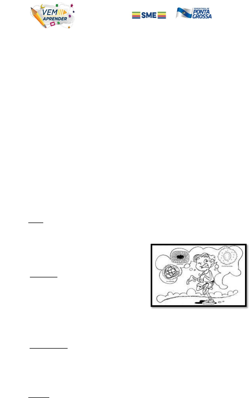 <p>SEMANA 13</p><p>CIÊNCIAS DA NATUREZA - 4º Ano</p><p>Escola:___________________________________________________</p><p>Aluno(a):_________________________________________________</p><p>Data: _____/_______/2020</p><p>Os microrganismos</p><p>Os microrganismos são seres vivos de tamanho pequeno, cujas dimensões não</p><p>permitem que sejam observados a olho nu pelo homem. Assim, eles só podem ser</p><p>visualizados ao microscópio.</p><p>De modo geral, os microrganismos contribuem na fertilização do solo, reciclagem</p><p>de substâncias e podem ser usados na fabricação de produtos como iogurte, vinhos,</p><p>queijos, vinagres, pães e remédios. Existem ainda os microrganismos patogênicos que</p><p>causam doenças em seres humanos, animais e plantas. Os principais grupos de</p><p>microrganismos são: vírus, bactérias, protozoários e fungos.</p><p>Os vírus são organismos microscópicos que não possuem células só</p><p>conseguem realizar suas atividades vitais dentro de outra célula viva. Alguns exemplos</p><p>de doenças causadas por vírus são: gripe, sarampo,</p><p>febre amarela, meningite, caxumba, hepatite, AIDS,</p><p>varíola, COVID 19.</p><p>As bactérias podem ser encontradas em</p><p>diversos ambientes e são capazes de suportar</p><p>condições ambientais onde nenhum outro ser vivo</p><p>conseguiria se desenvolver. Algumas atuam na</p><p>produção de alimentos e medicamentos, já outras bactérias podem causar doenças</p><p>como a cólera, difteria, febre tifoide, lepra, meningite, tuberculose.</p><p>Os protozoários apresentam variadas formas corporais e ocupam ambientes</p><p>úmidos ou o interior de outros organismos. Alguns são parasitas, causadores de</p><p>doenças. Entre as doenças causadas por protozoários estão: amebíase, giardíase,</p><p>malária e doença de chagas.</p><p>Os fungos possuem diversos tipos de habitat visto que são encontrados no solo,</p><p>na água, nos vegetais, nos animais, no homem e nos detritos em geral, alguns são</p><p>https://www.todamateria.com.br/virus/</p><p>utilizados para diferentes fins, como na produção de medicamentos e até mesmo na</p><p>produção de queijos. O cogumelo é um tipo de fungo que é muito apreciado na culinária,</p><p>sendo fonte de proteínas. Existem ainda os fungos que podem causar alguma doença</p><p>como: micoses, sapinho, candidíase e histoplasmose.</p><p>1- Agora que você sabe um pouco mais sobre os microrganismos marque V</p><p>para verdadeiro e F para falso nas afirmações abaixo:</p><p>( ) As bactérias e os vírus podem somente ser vistos através dos microscópios.</p><p>( ) Os protozoários vivem em ambientes úmidos ou no interior de outros organismos.</p><p>( ) Os vírus precisam de outras célula viva para poder sobreviver.</p><p>( ) Todos os fungos são microscópicos.</p><p>( ) Alguns fungos, bactérias, vírus e protozoários podem causar doenças aos seres</p><p>humanos.</p><p>2- Pesquise e liste doenças que podem ser causadas por:</p><p>VÍRUS</p><p>BACTÉRIA</p><p>FUNGOS</p><p>3- Atualmente todo o mundo está preocupado com a COVID19. Escreva o que você</p><p>sabe sobre esta doença.</p><p>___________________________________________________________________</p><p>___________________________________________________________________</p><p>___________________________________________________________________</p>